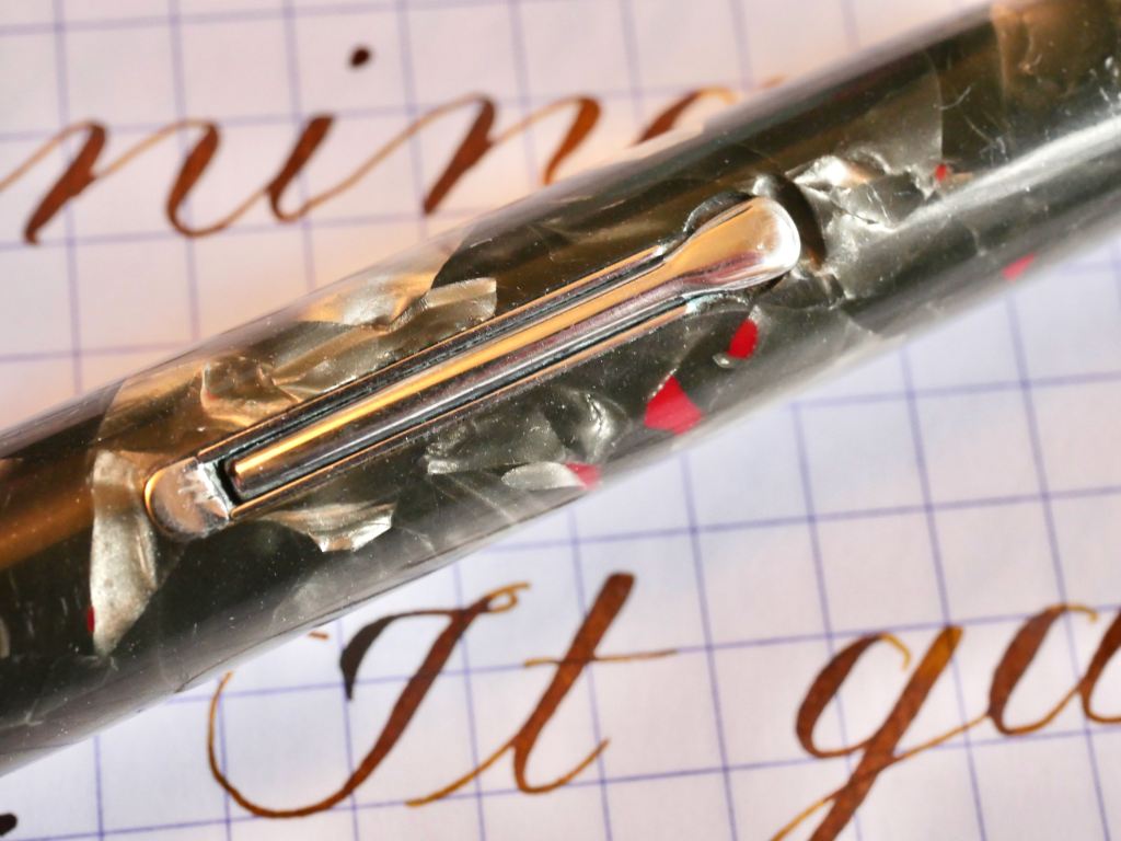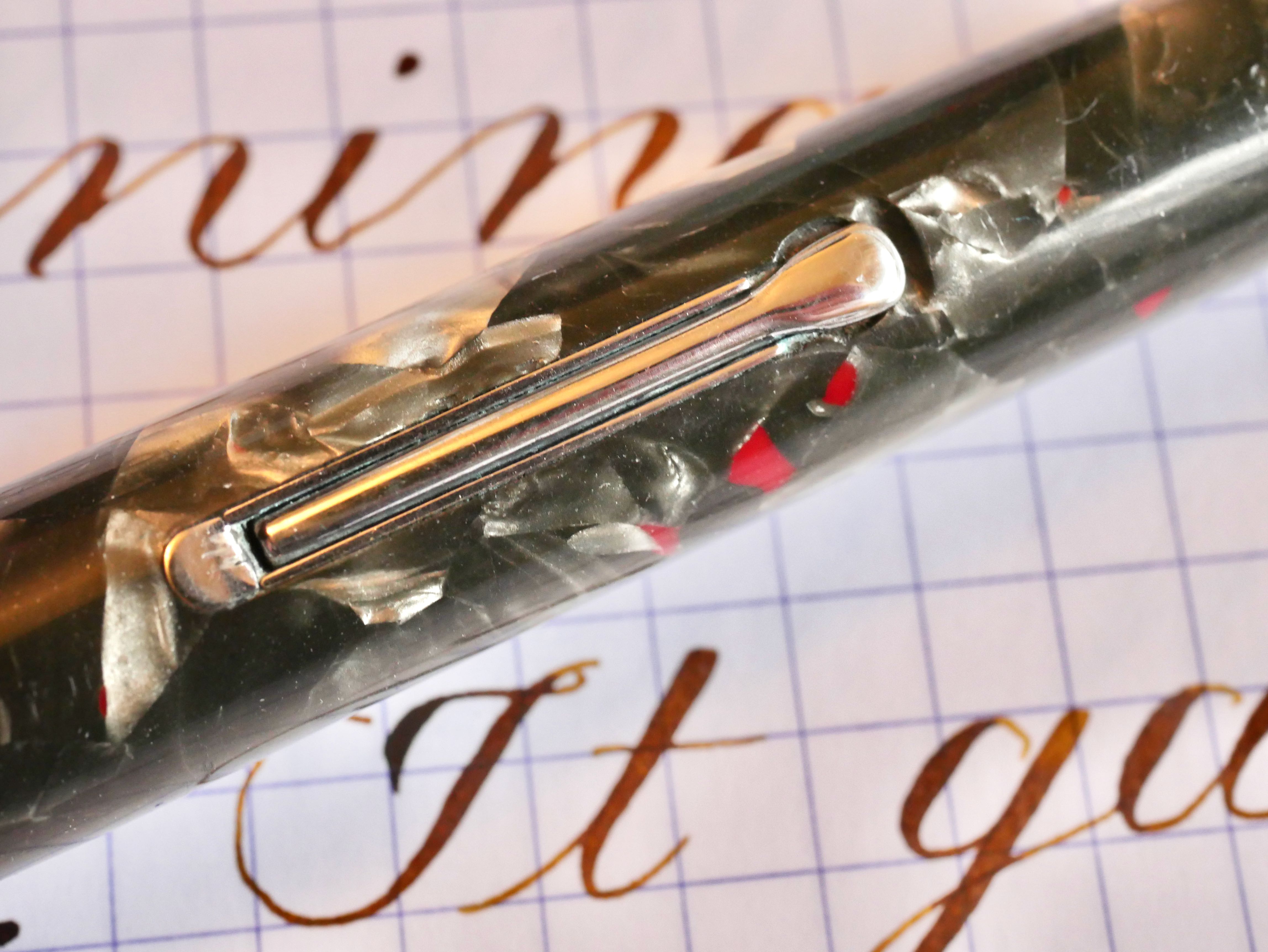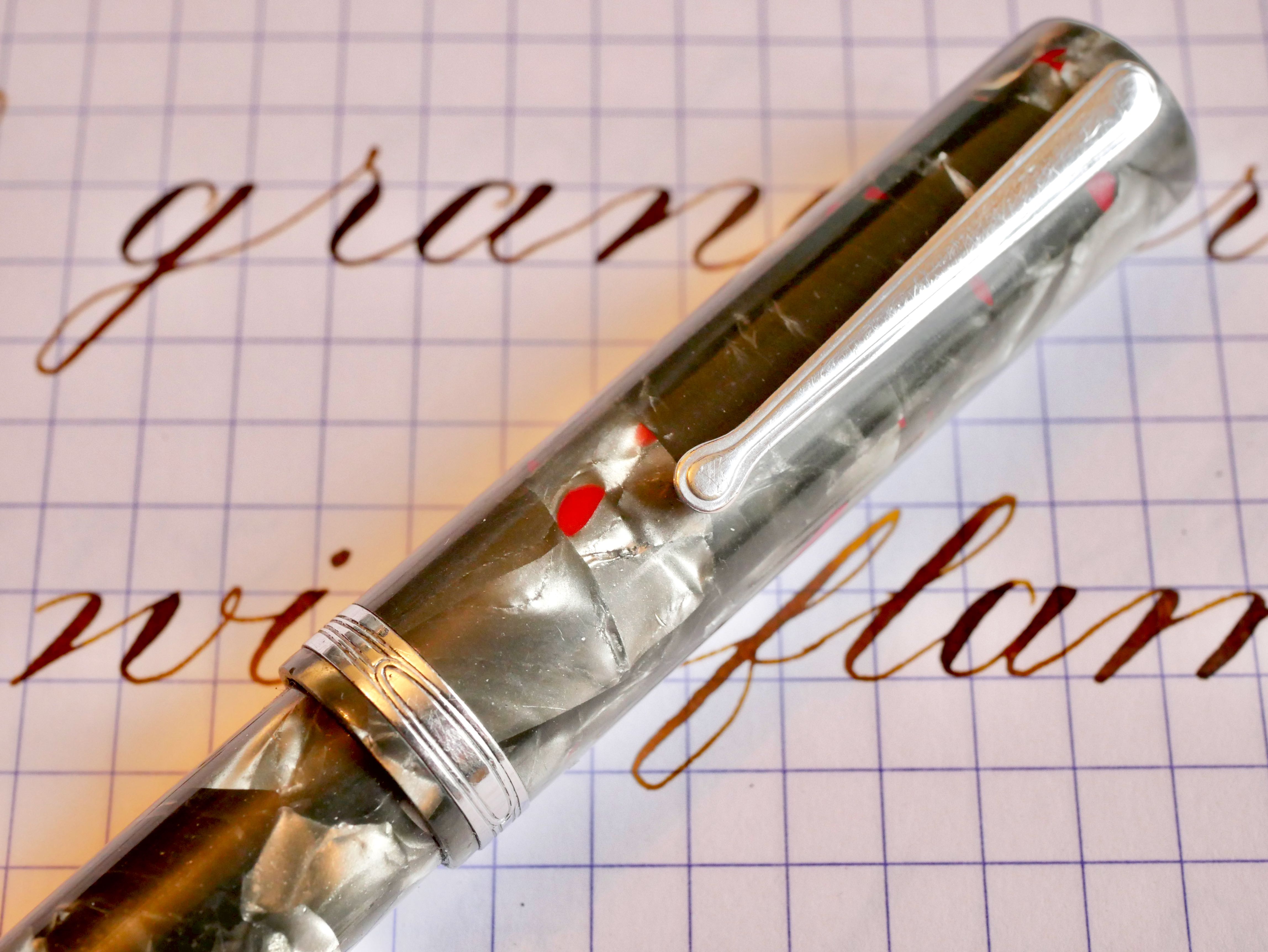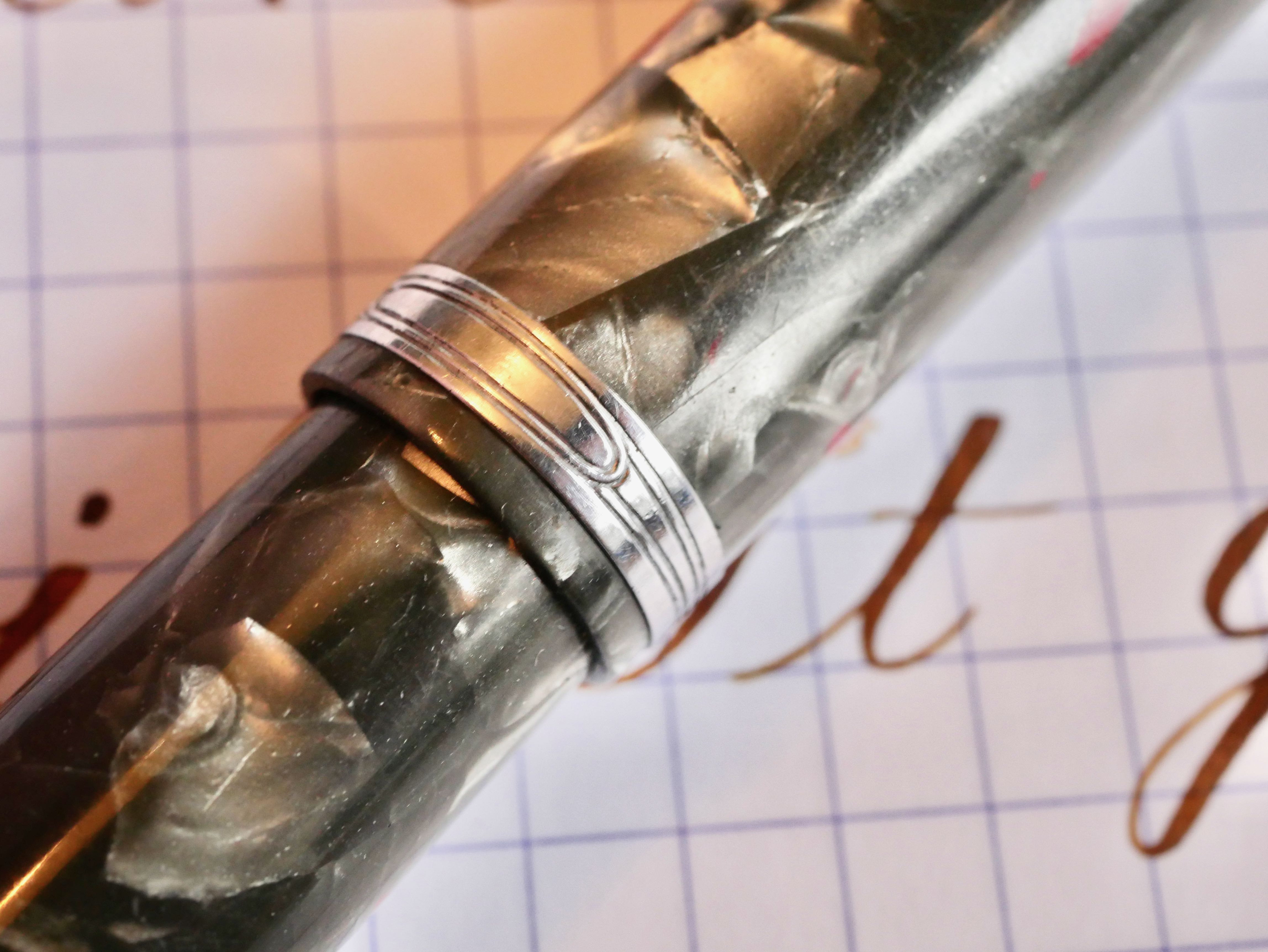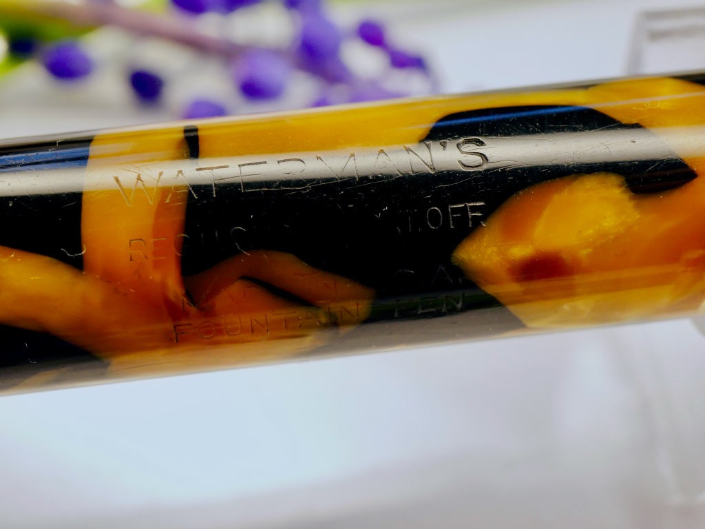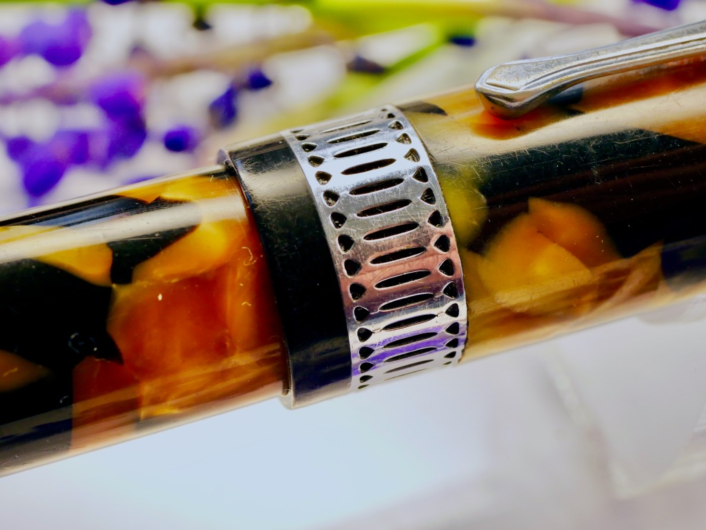 Here is a hard to find Waterman Patrician in their Nacre celluloid and chrome trim. The pen is in good overall shape with a few blemishes from, I would say, a decent lifetime of use. The body does have some scratches throughout, though they are generally only apparent when seen at certain angles. The zoomed in photos make them look a lot more obvious than they are. The pearl celluloid has browned throughout most of the pen, which is pretty typical. The black hard rubber ends are still black with little fading. The chrome trim on the clip and lever has a good amount of scratching. The band is in better shape, and looks better than the pictures. The lever is lifting just slightly from flush with the body. Also the clip is just a little loose. The massive 14kt. Patrician nib is a lovely writer. Normally, it writes as a F (0.4mm) with some character. The nib does have some decent flex, but it is too firm