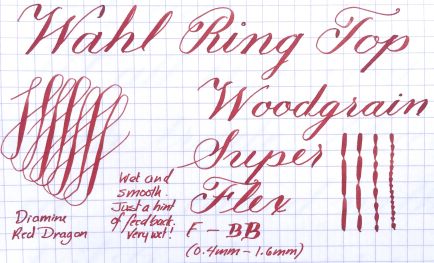Here is a pretty little ring top from Wahl. The red/black woodgrain still looks quite vivid with just a tiny bit of fading. The gold filled trim also looks good with just a little bit of brassing on the crown of the lever. It’s a stunning little pen. The 14kt. Wahl #2 nib is juicy writing F that is smooth with just a hint of feedback to it. The tip of this nib was bent. I straightened the nib out and realigned everything about as good as you can get it. The effect now is purely cosmetic and has no bearing on the performance of the nib. You can just tell the tip of the nib has been marked up a bit in the past. It still has some nice flex going from F to BB (0.4mm to 1.6mm) with plenty of flow to keep up without railroading. A stunning, portable pen with some nice flex ability.