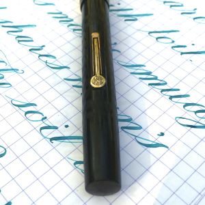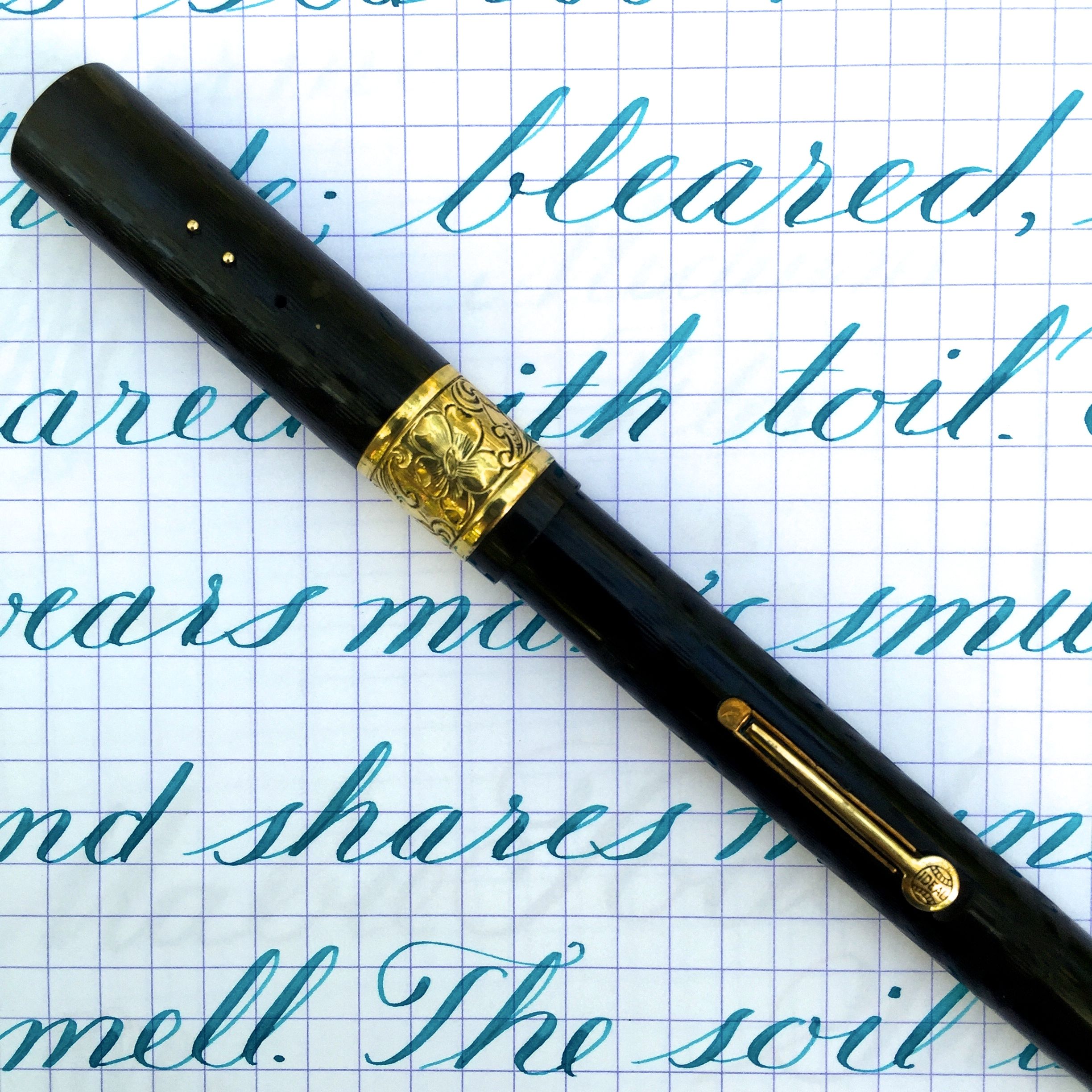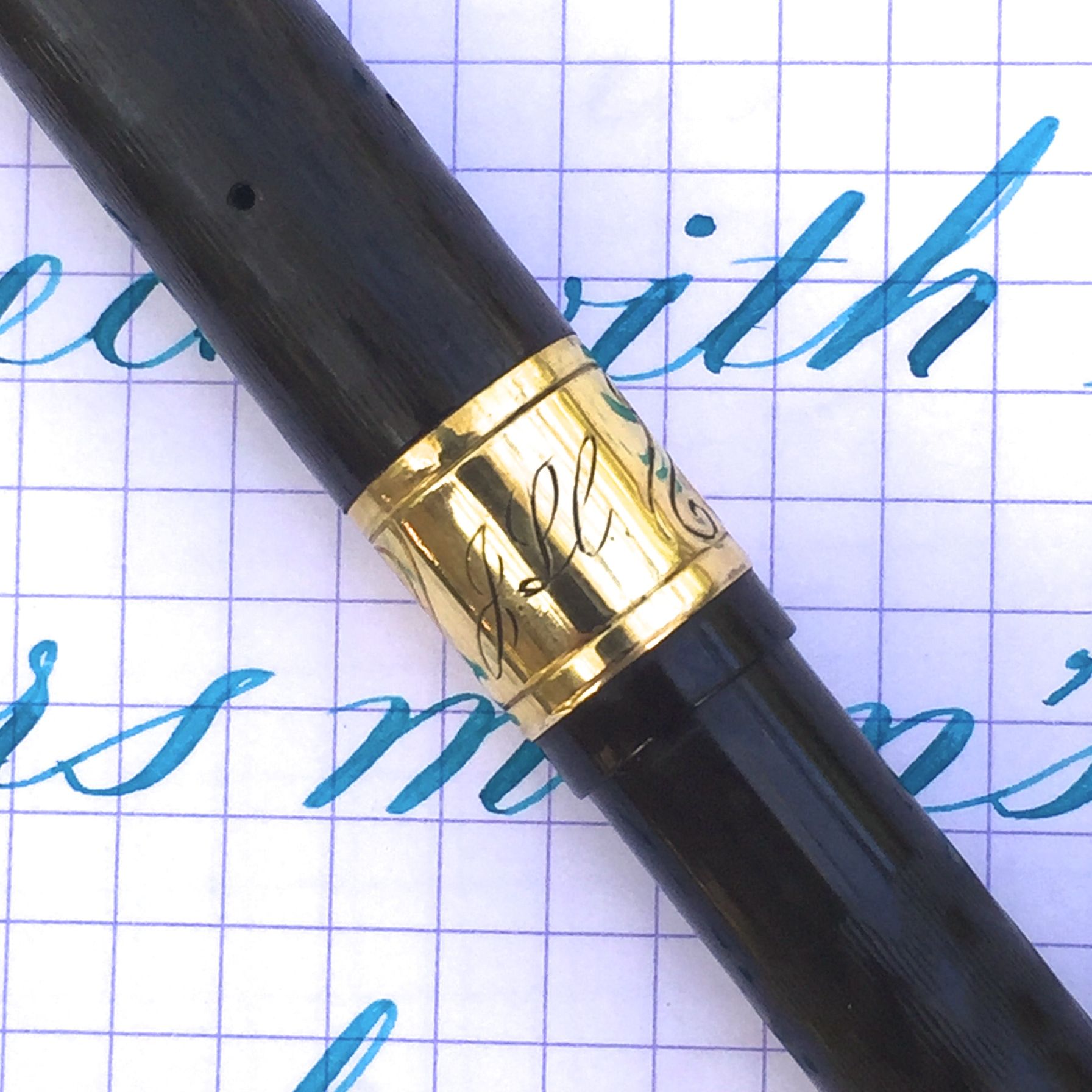 Here is a Waterman 52 in BCHR with gold filled trim. The body on this pen is in excellent condition. It is still very black with minimal fading. All the imprints are very clear and crisp. Sadly the clip is missing, or this would be a near mint condition pen. The gold-filled band has some lovely floral repousse work and the initials “J.L.C.” engraved. There is little to no brassing on the trim that I can see. The 14kt. Waterman #2 nib is a really nice XF factory italic nib (0.5mm). It is smooth, about medium wetness, and has superb line variation for it’s size. It has also some flex going up to 1.5mm pretty easily.