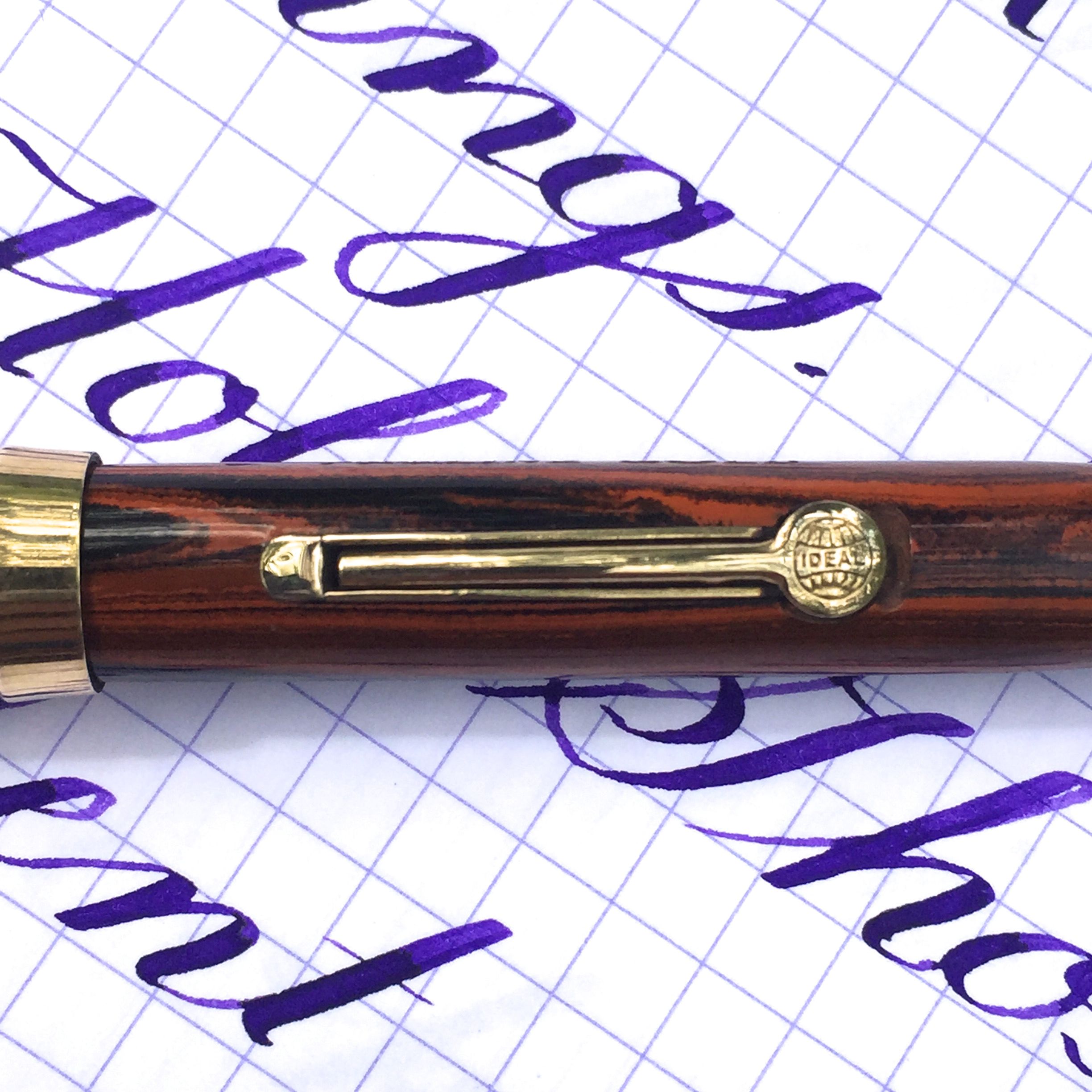 Here is a beautiful combo of a Waterman 52 1/2V and pencil in red mottled hard rubber. The hard rubber shows very little fading and still retains some shine. The trim on both pieces looks very good with no signs of brassing. Both pieces have very good imprints on them and the inscription “Pauline Gold.” I have done nothing to the pencil but shine up the trim a bit. I am also including the original box the combo came in. The real joy of this combo is the pen’s 14kt. Waterman #2 nib. It’s a broad (0.9mm) factory italic nib and it is beauty. It has fantastic line variation in normal writing, and it is smooth and juicy. Add to that the fact that it is a soft super flex nib as well, and you have the makings of a truly special pen. It’s a pure joy to use.