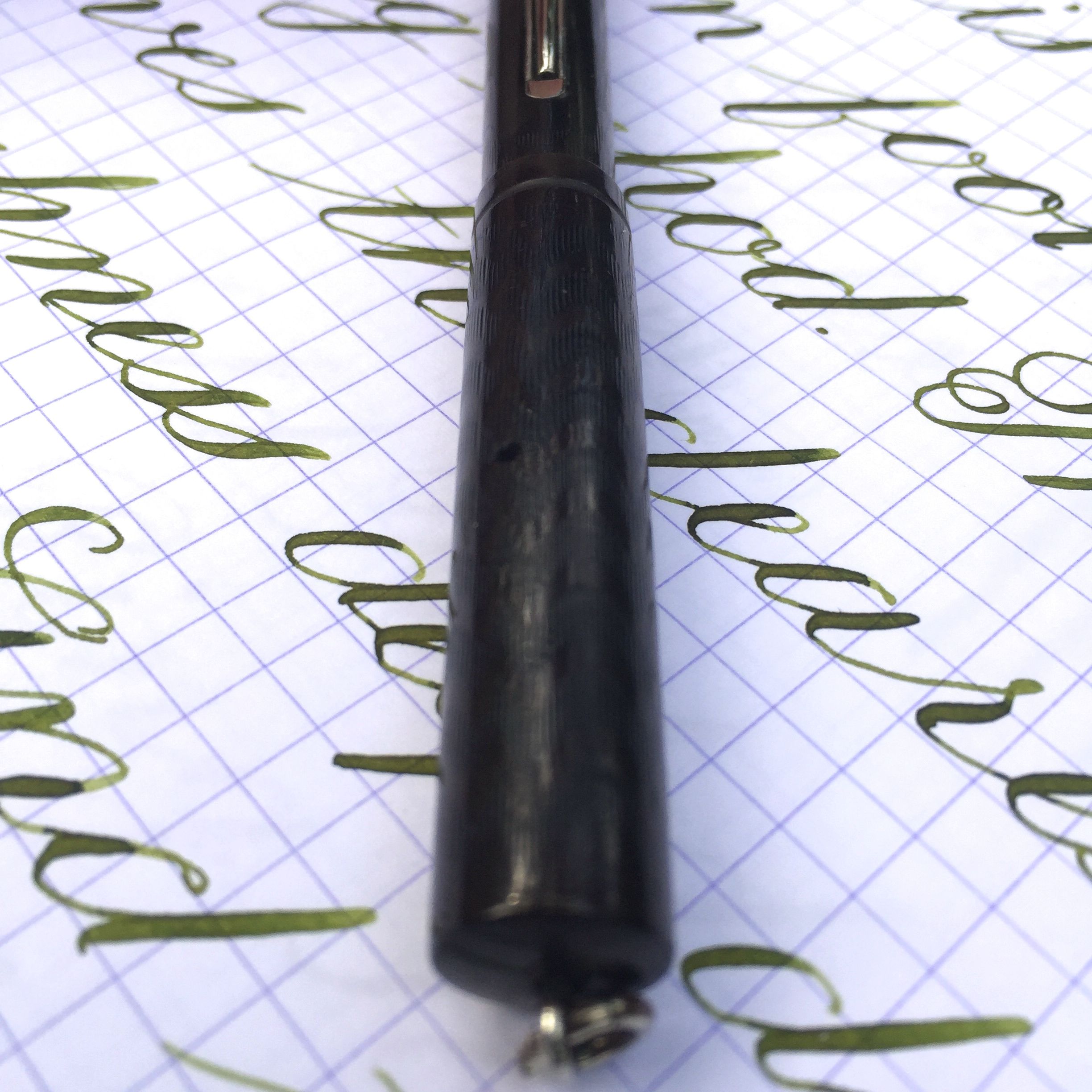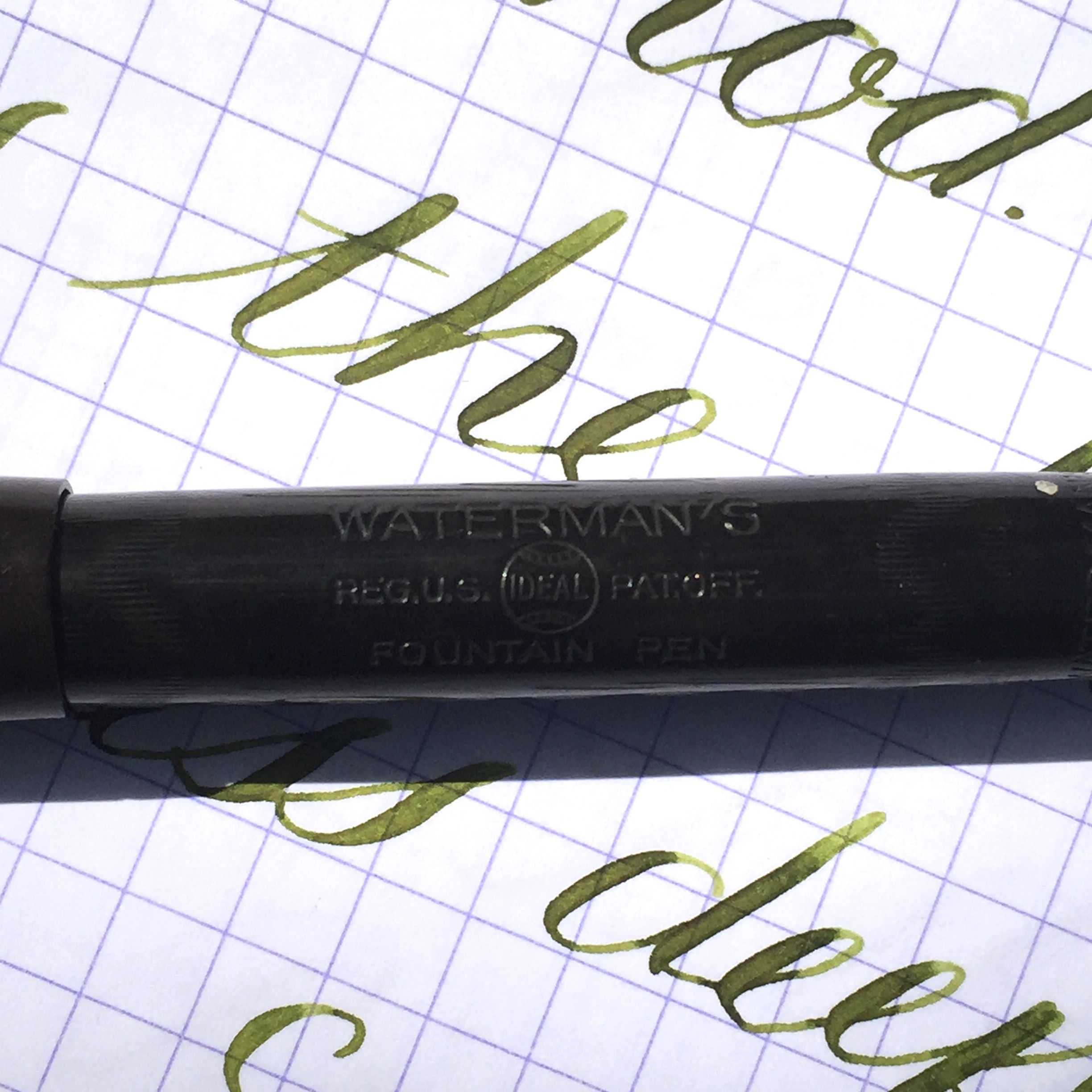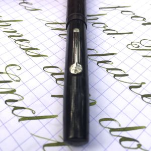 Here is a Waterman 52 1/2V in BCHR with nickel trim. Parts of the black hard rubber body still look pretty black, but it has faded some (especially the cap) to a very dark brown. The chasing and the imprints on this pen are superb and almost look brand new. The nickel plated trim is excellent. The only blemish is that it appears someone did try and pull the lever with a hardened sac inside, and then thought better of it as the lever is slightly bent at the pivot. But there are no cracks or signs of weakness in the lever. The 14kt. Waterman #2 is a soft, smooth, lovely writing F that has a pretty soft flex going up to BB (1.6mm). It’s not the most responsive super flex nib, but the flex comes quite easy and the nib writes beautifully.