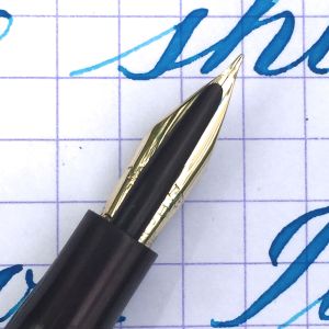 Here is the Mabie Todd & Bard, made in New York Swan pen with over/ under feed. Since it retains the the “Bard” name it would predate 1907. The pen has faded some to a very dark black/ brown color. The chasing has worn, but is still partly visible. Imprints are still present but also worn. The slip cap is good and tight. The 14kt. Swan XF nib writes beautifully. It is soft and smooth and a true pleasure to use. It does have some decent flex that goes up to 1.5mm. It’s just a bit too stiff to be graded higher in my view, but you can still do some good work with it. If you like writing with a #2 pencil, then you will love writing with this 100 plus year pen.