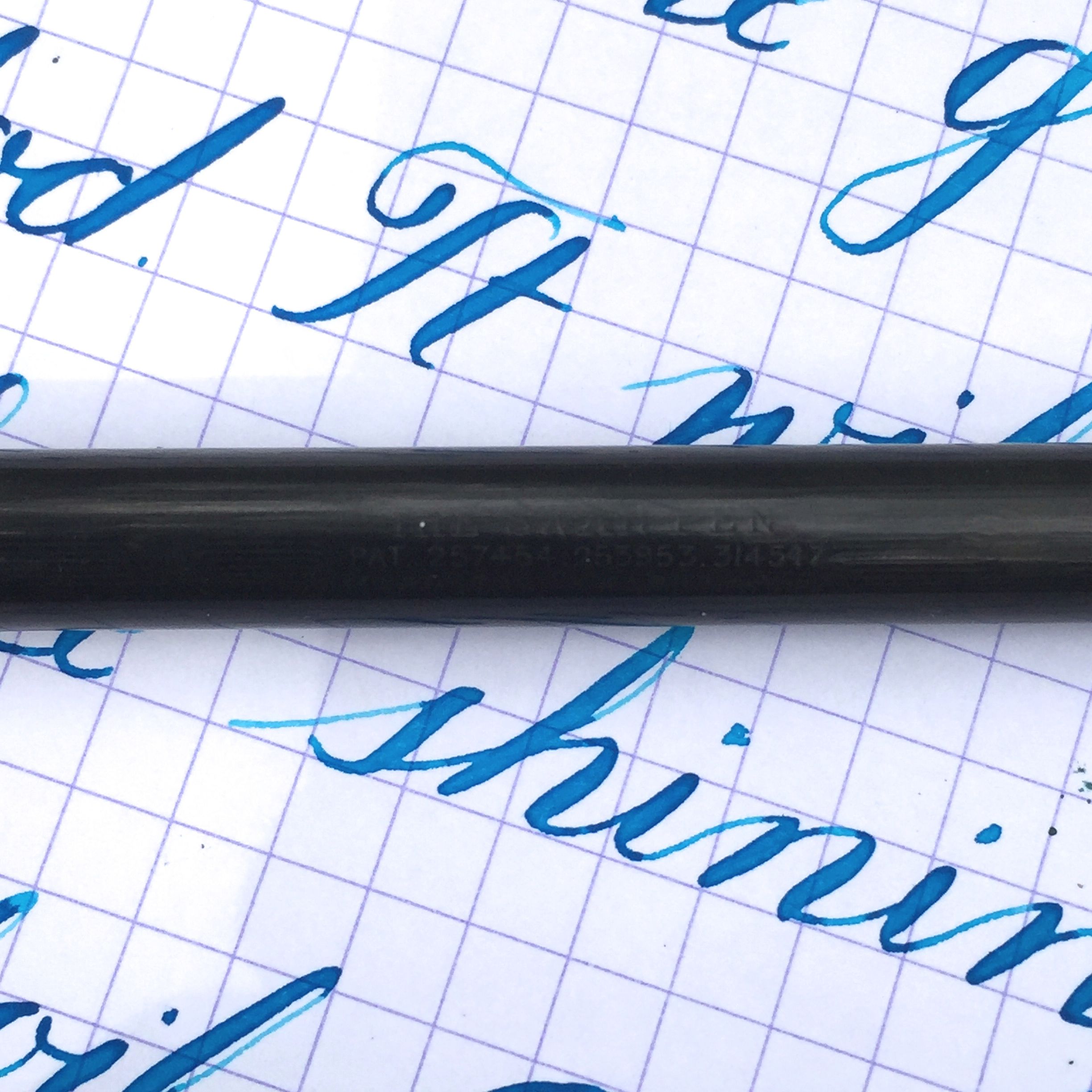 Here is the Mabie Todd & Bard, made in New York Swan pen with over/ under feed. Since it retains the the “Bard” name it would predate 1907. The pen has faded some to a very dark black/ brown color. The chasing has worn, but is still partly visible. Imprints are still present but also worn. The slip cap is good and tight. The 14kt. Swan XF nib writes beautifully. It is soft and smooth and a true pleasure to use. It does have some decent flex that goes up to 1.5mm. It’s just a bit too stiff to be graded higher in my view, but you can still do some good work with it. If you like writing with a #2 pencil, then you will love writing with this 100 plus year pen.