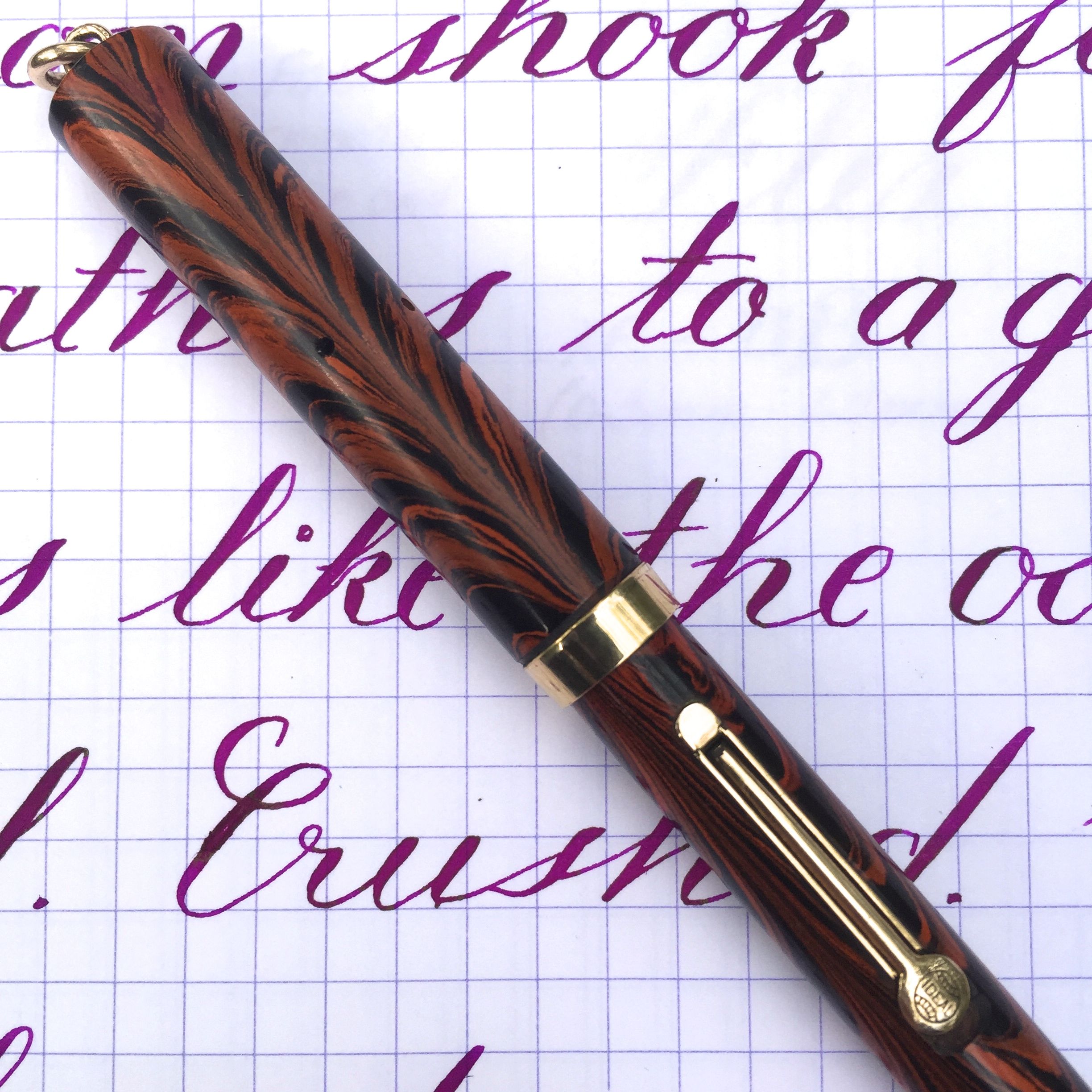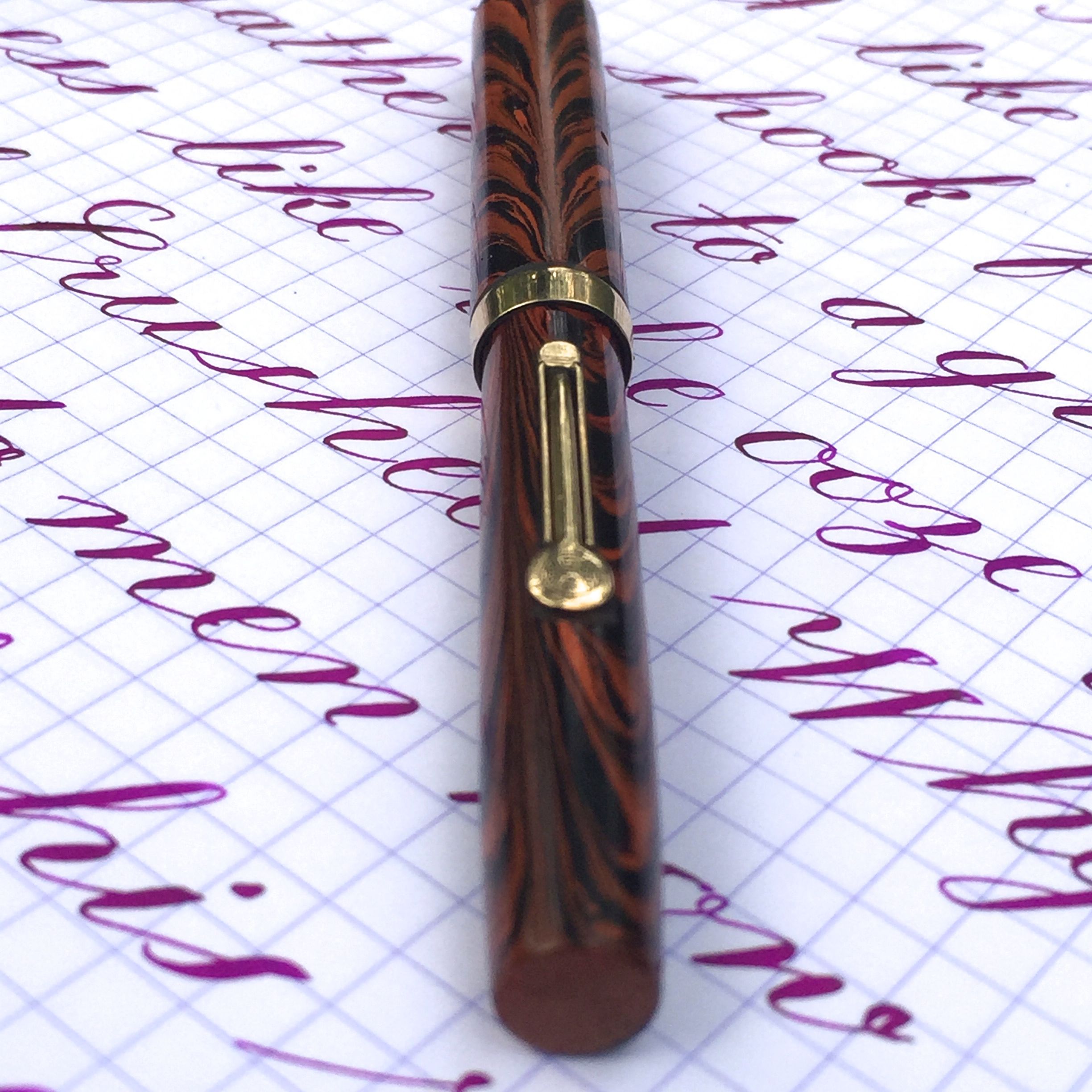 This is a gorgeous Waterman 52 1/2 V pen in the famous Waterman red ripple hard rubber. The pen is in superb condition. There is very little fading to the hard rubber. It’s lost a some of it’s shine, but it still has it’s beautiful color. The imprints are all good and crisp throughout the pen. The trim shows no signs of brassing. The 14kt. Waterman #2 is a wonderful XF (0.3mm) that writes surprisingly smooth and wet. This pen also has some beautiful flex that comes with ease. It ranges from XF-BB (0.3mm-1.5mm). And while that is not as big a range as some super flex nibs, this one has a superb responsiveness that is hard to match. It’s a stunner and a great writer.