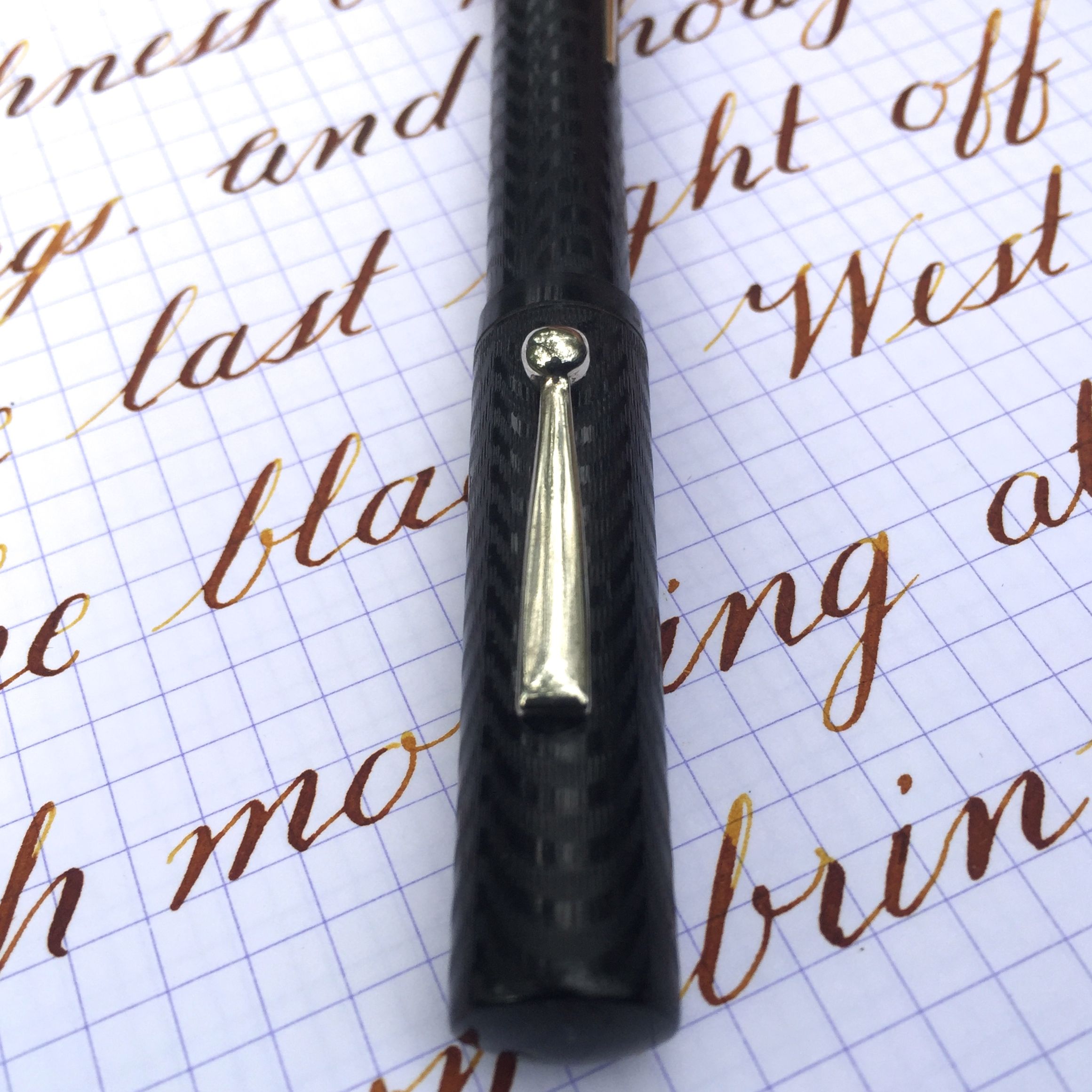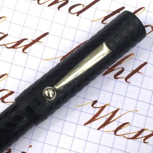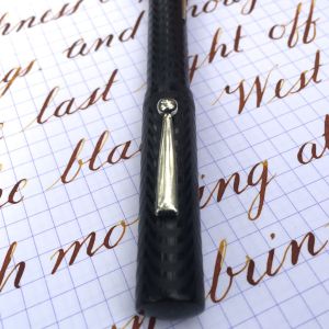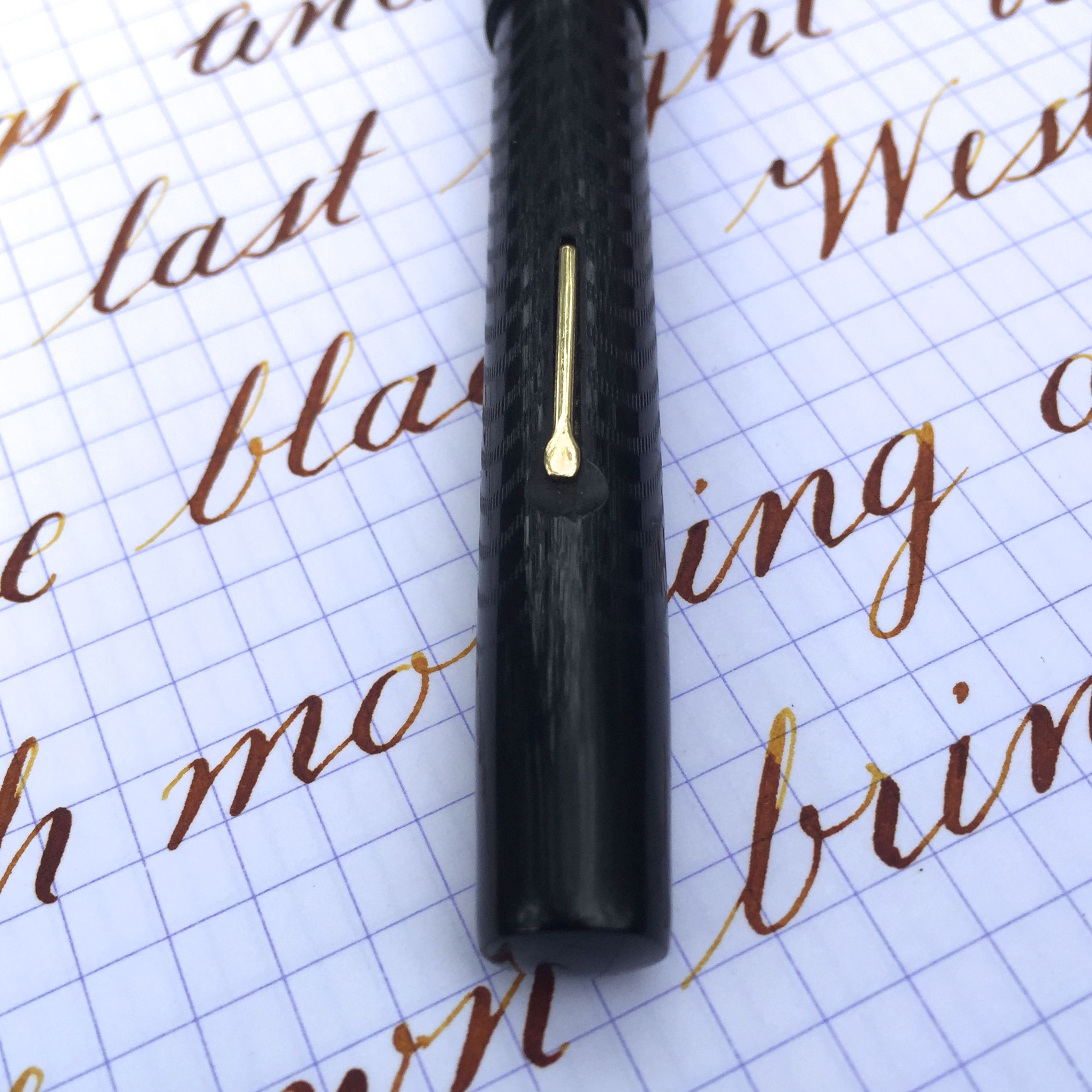Here is a Wirt vest pen in BCHR. The black hard rubber is still very black with hardly if any fading. The chasing looks great as well. There is no brassing of the nickel trim. The pen is in really nice condition. There are some deeper scratches around the section where someone probably used their teeth or a tool to get the section out. The 14kt. Wirt nib has the breather hole in the feed so that it looks like a dip nib. There is a very slight crease up on the tines. The nib may have been slightly sprung at some point. However, the nib seems to retain its shape just fine, and I imagine will continue to do so so long as it is not over flexed. The flex range on this nib is not immense going from XF to BB (0.3mm – 1.5mm), but it has fantastic snap back and the flex comes quite easily. I love the way this nib writes. It has that vintage slightly stubbish nature to it that gives even XF writing some character. Even for just normal writing, this nib is a soft, smooth superb writer.