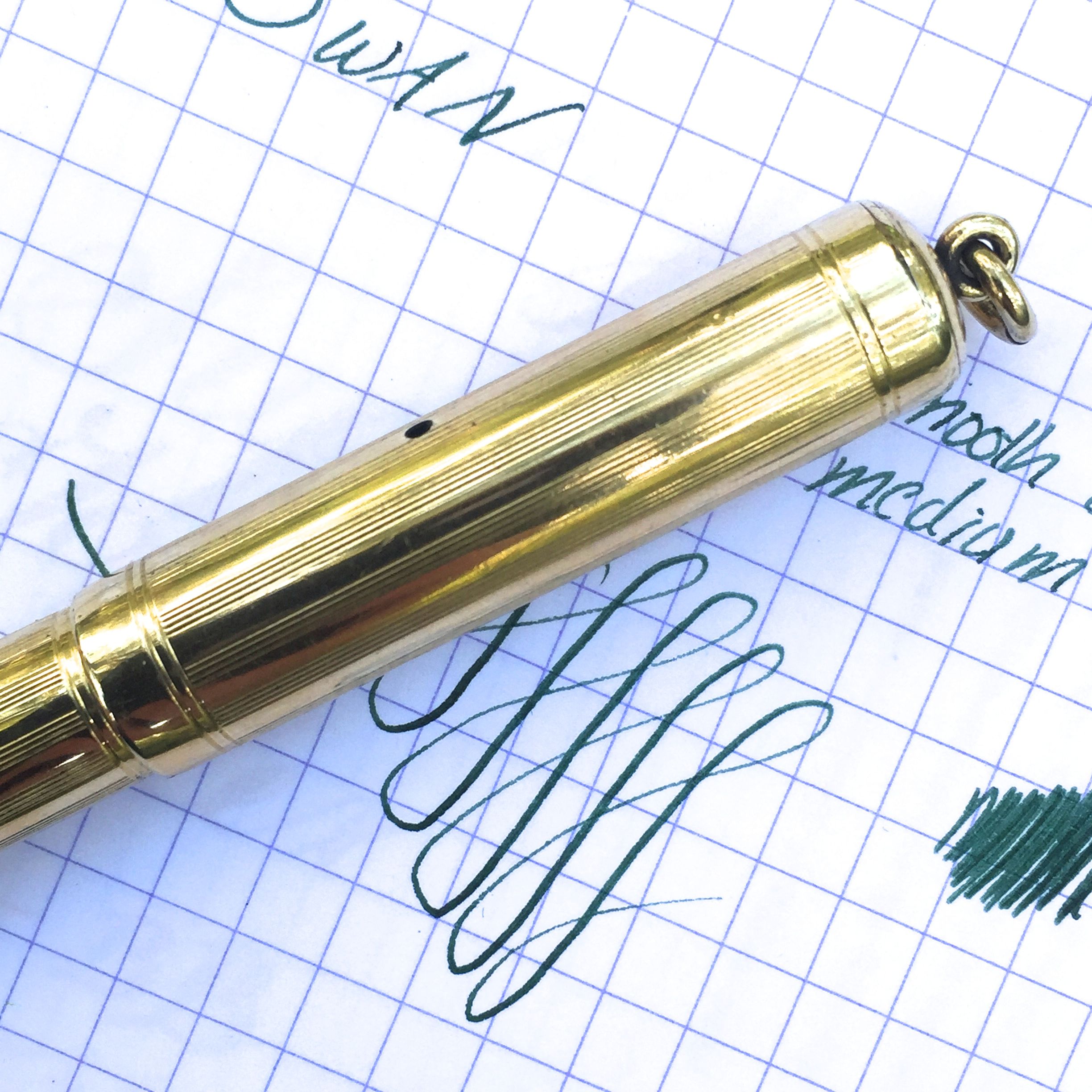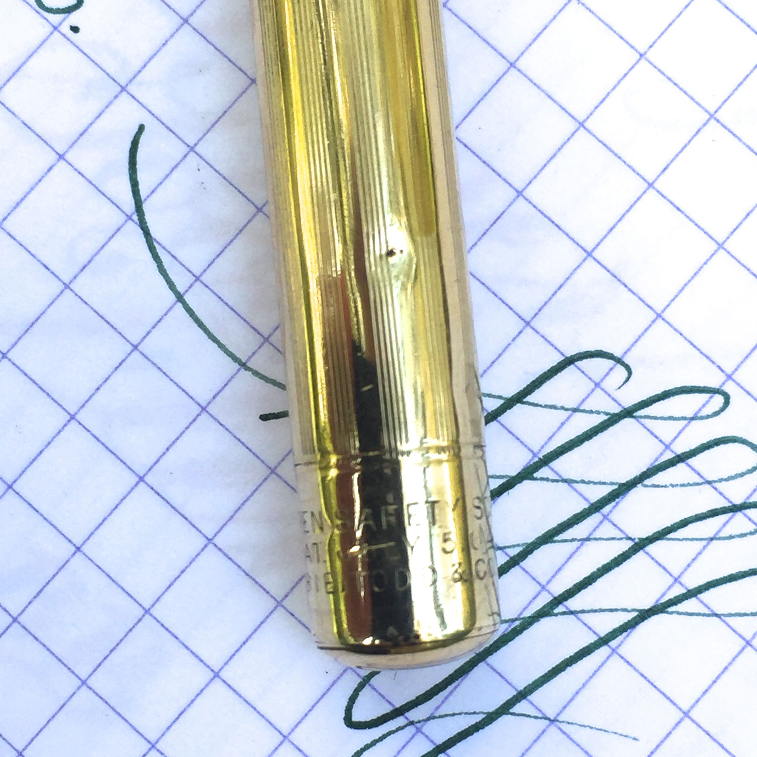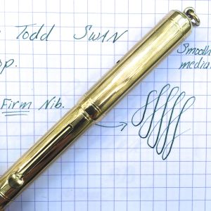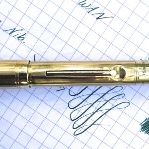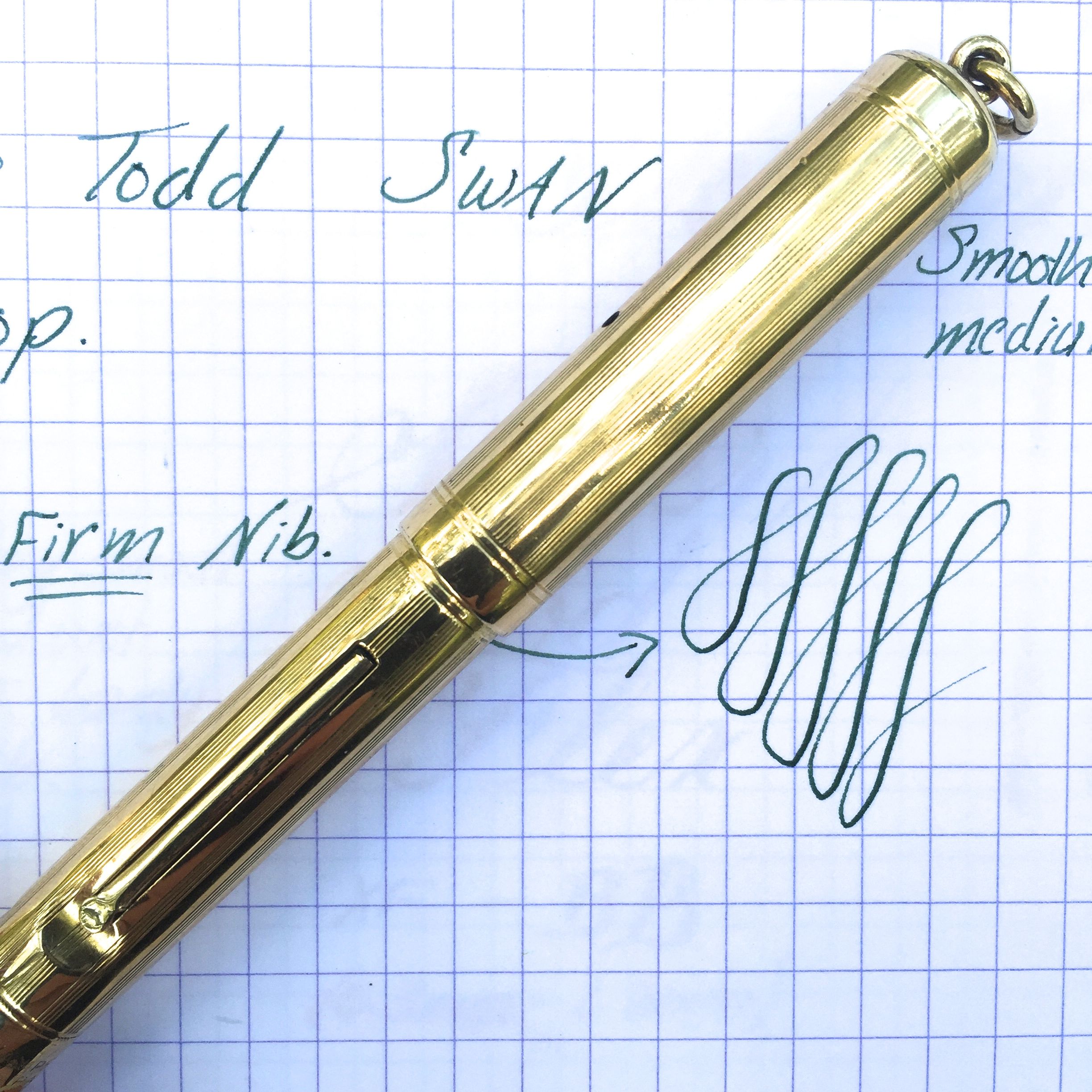 This gold filled ring top Swan was originally made in New York and has an 1904 patent date. I really like Mabie Todd ring tops as they just feel like high quality. It’s hard to describe without using them. Anyway, this Swan has four decent dings on the end of the barrel, and a few tiny scuffs on the lever. I don’t see any other brassing. There is some light scratching throughout the pen. The 14kt. #2 Swan nib is a firm and smooth XF. It has about a 4 out of 10 wetness. If you are looking for a vintage portable pen that will write on cheap paper, this might be for you.