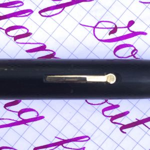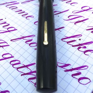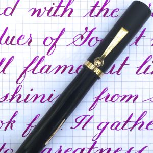 Oh I love these oversized Wahl Pens. To give you an idea of the girth of these pens, the barrel is a whopping 14mm in diameter. By way of comparison, the cap of Waterman 55 is only 13.5mm. A Pelikan M800 barrel is around 13.3mm. The hard rubber of this pen has faded to a dark black/brown. Chasing is a little worn but still pretty good. The gold filled trim looks pretty good with no brassing. There are a couple very tiny dings on the lever. A single mm or so has been cut off the lip of the cap (it probably had a small crack and was removed to stop the crack from spreading). The monstrous 14kt. Wahl “Signature” nib is an ultra, butter smooth M/ B (0.6mm) that writes juicy with just a bit of a stubbish quality to it. It is has a soft flex, which gives it a really soft feel when writing. Definitely a pen for long writing sessions. The flex ranges up to BB (1.7mm) and is pretty responsive. Just a great pen.
