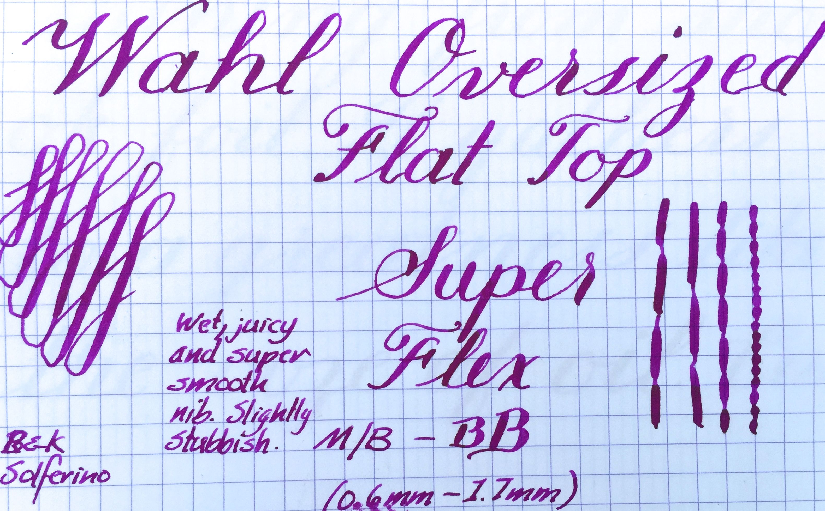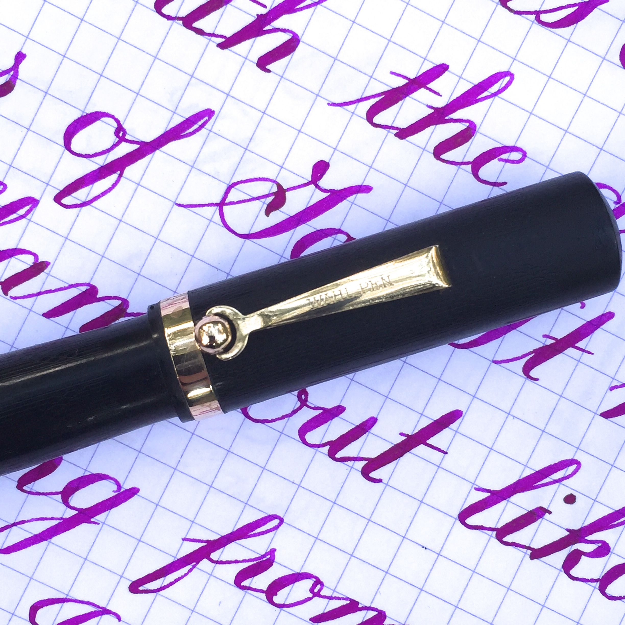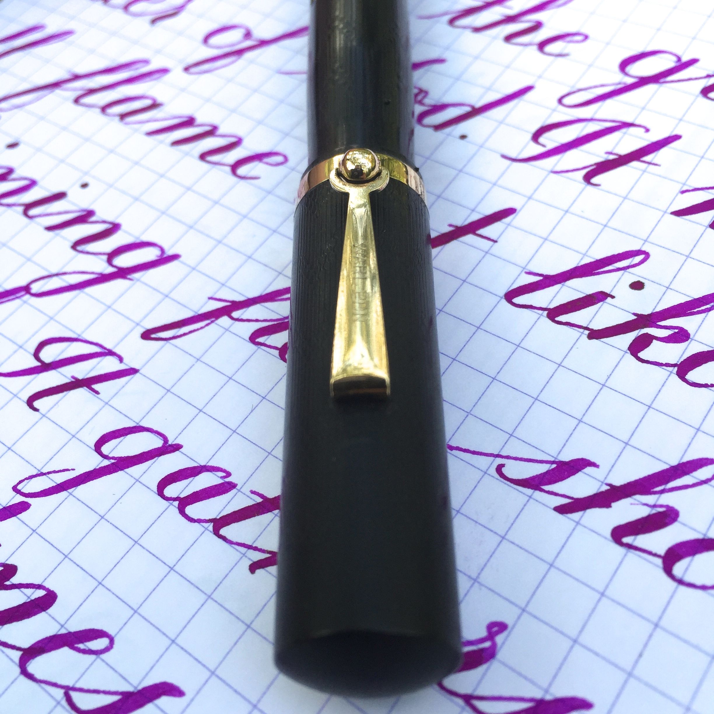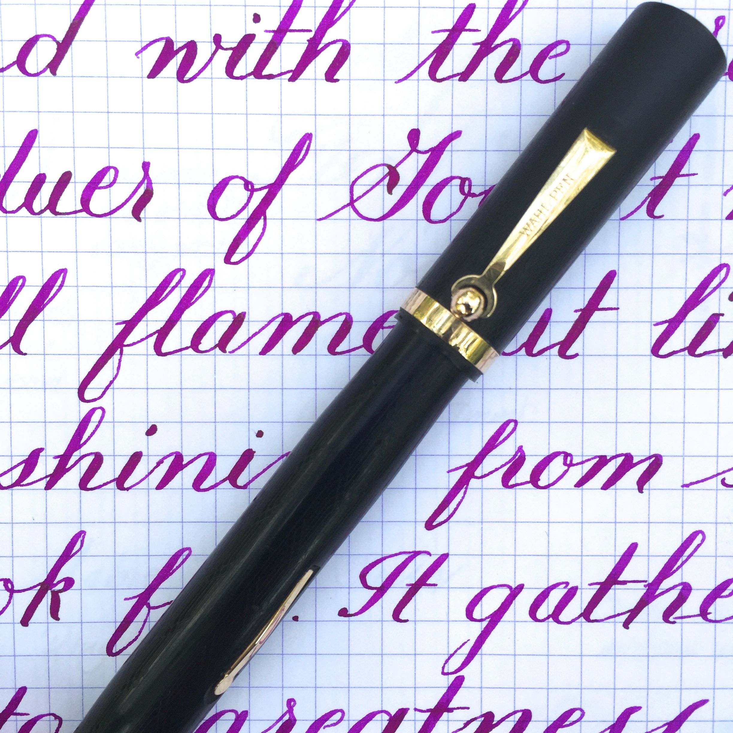 Oh I love these oversized Wahl Pens. To give you an idea of the girth of these pens, the barrel is a whopping 14mm in diameter. By way of comparison, the cap of Waterman 55 is only 13.5mm. A Pelikan M800 barrel is around 13.3mm. The hard rubber of this pen has faded to a dark black/brown. Chasing is a little worn but still pretty good. The gold filled trim looks pretty good with no brassing. There are a couple very tiny dings on the lever. A single mm or so has been cut off the lip of the cap (it probably had a small crack and was removed to stop the crack from spreading). The monstrous 14kt. Wahl “Signature” nib is an ultra, butter smooth M/ B (0.6mm) that writes juicy with just a bit of a stubbish quality to it. It is has a soft flex, which gives it a really soft feel when writing. Definitely a pen for long writing sessions. The flex ranges up to BB (1.7mm) and is pretty responsive. Just a great pen.