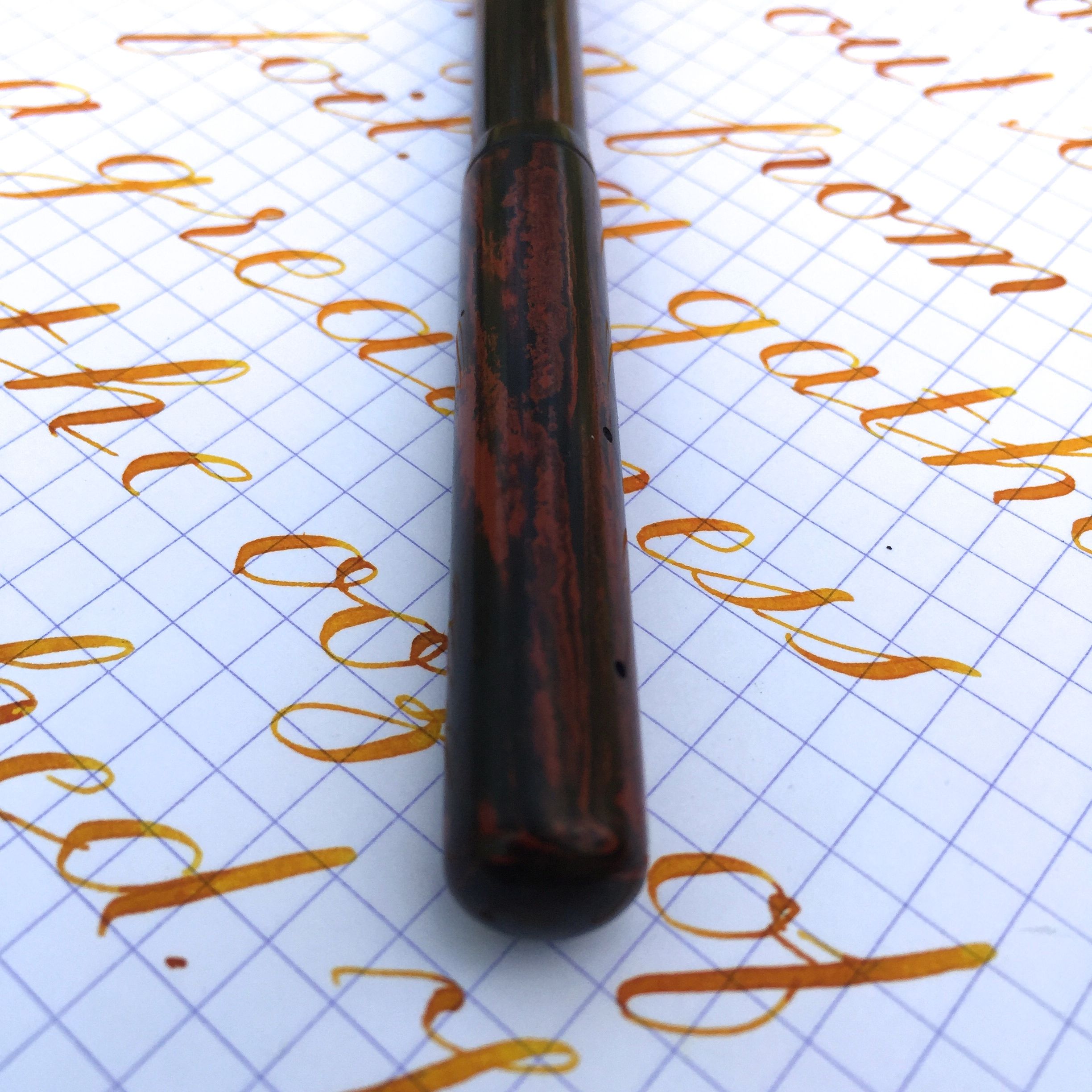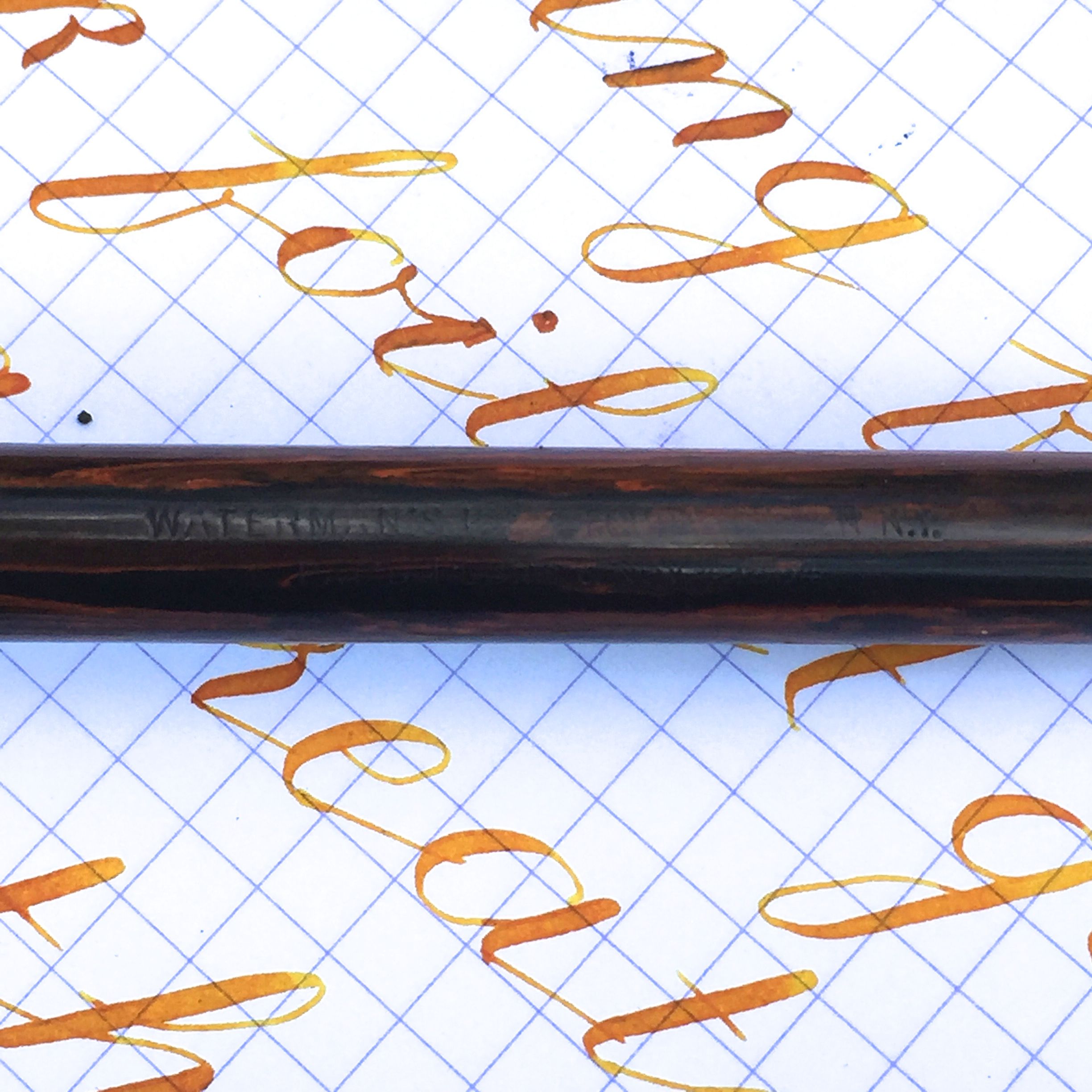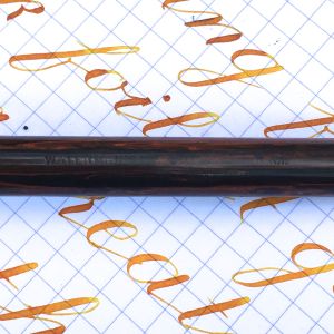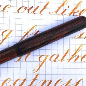 Here is a nice Waterman 14 eyedropper in red mottled hard rubber. Patent date on this Waterman is 1884. It’s likely over 120 years old, but still in very nice condition. There is a little fading to the hard rubber, but it still has very good color for it’s age and has even retained some of it’s original shine. Imprints are pretty good. A little faded, but certainly readable. The only real flaw is a tiny chip on the edge of the cap, but the there are no cracks. The 14kt. Waterman #4 is a perfect specimen of the joys of vintage nibs. It’s a juicy, soft, smooth F that is really a stub. Notice the line variation in the writing sample. It has some superb flex that ranges from 0.4mm to 1.7mm and has an ease of flex that is nearing wet noodle status. It also has very good responsiveness. It’s a beautiful, early Waterman.