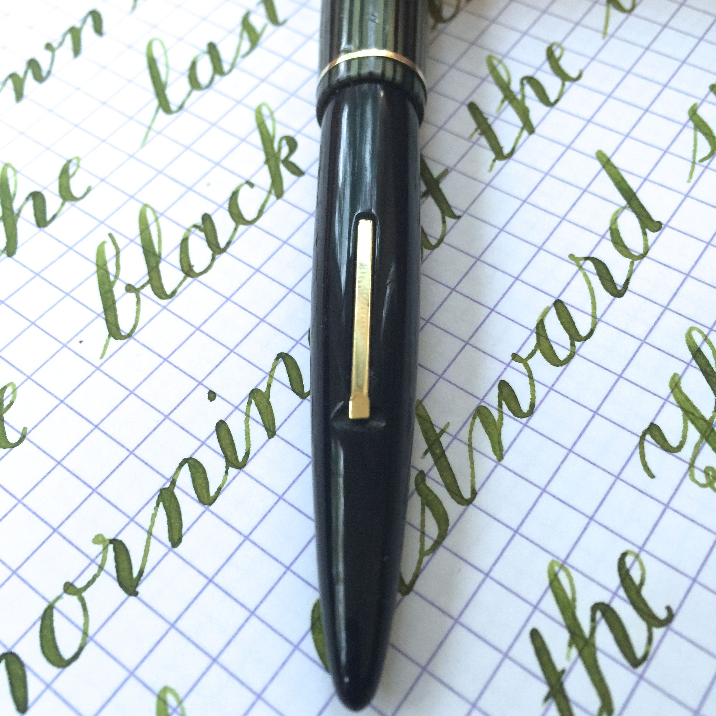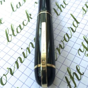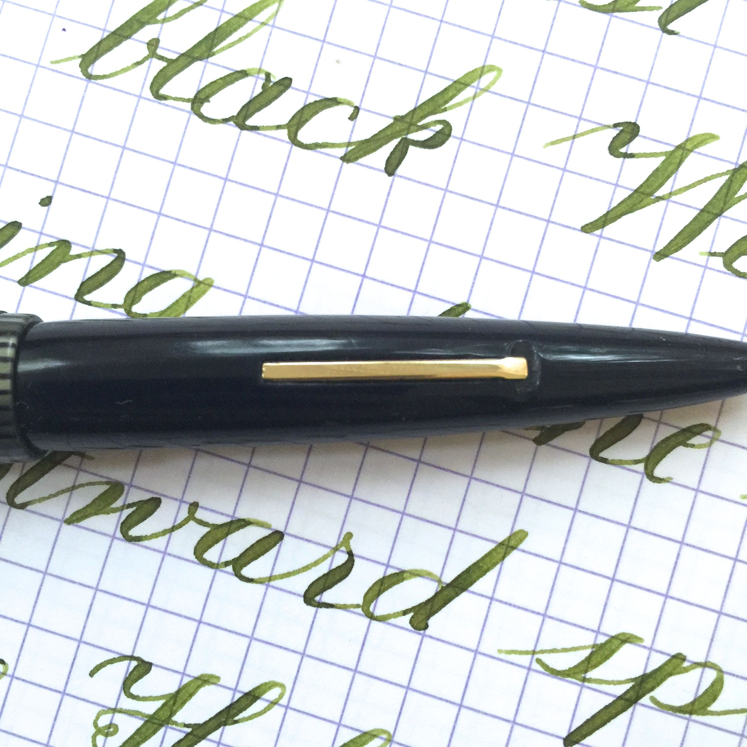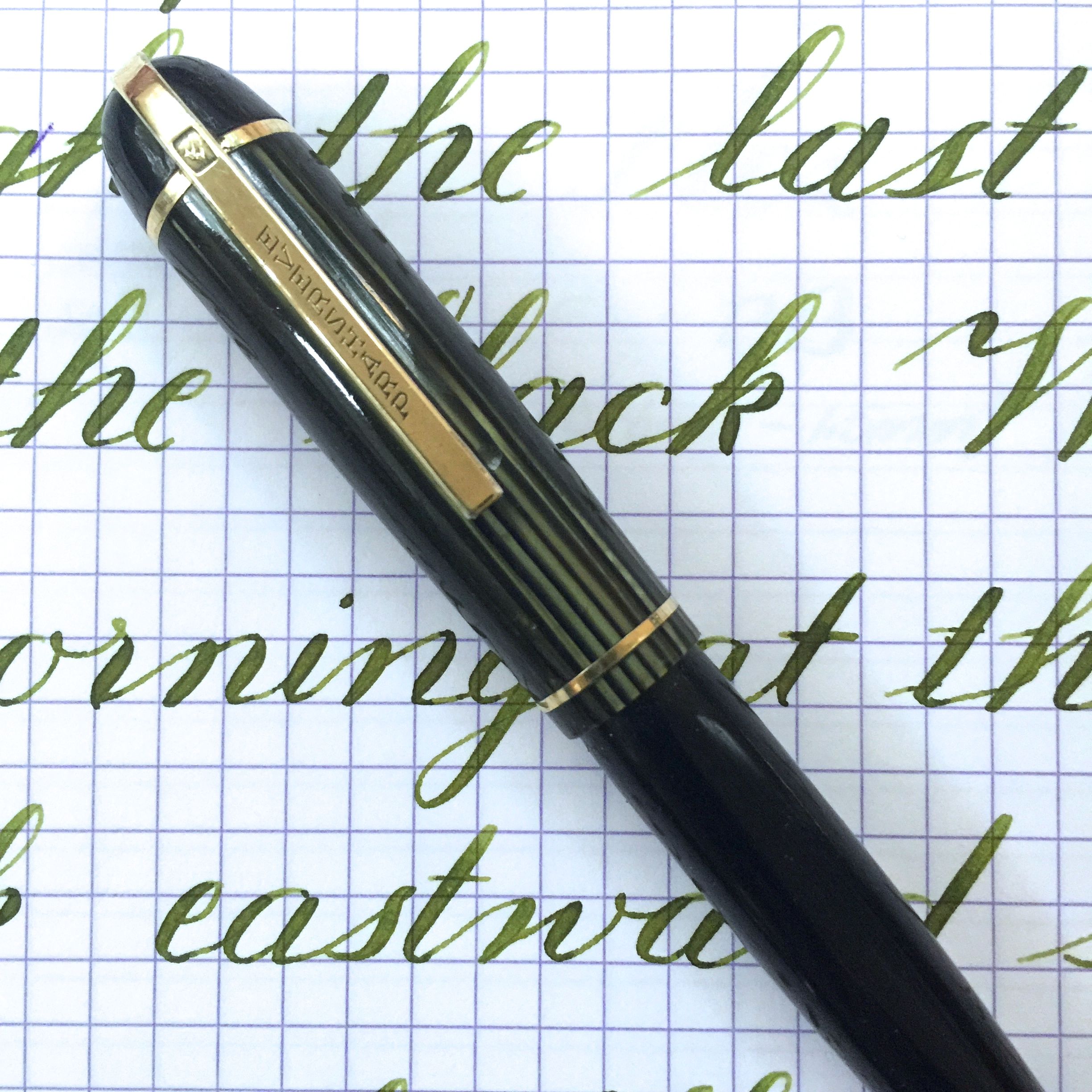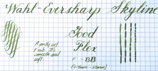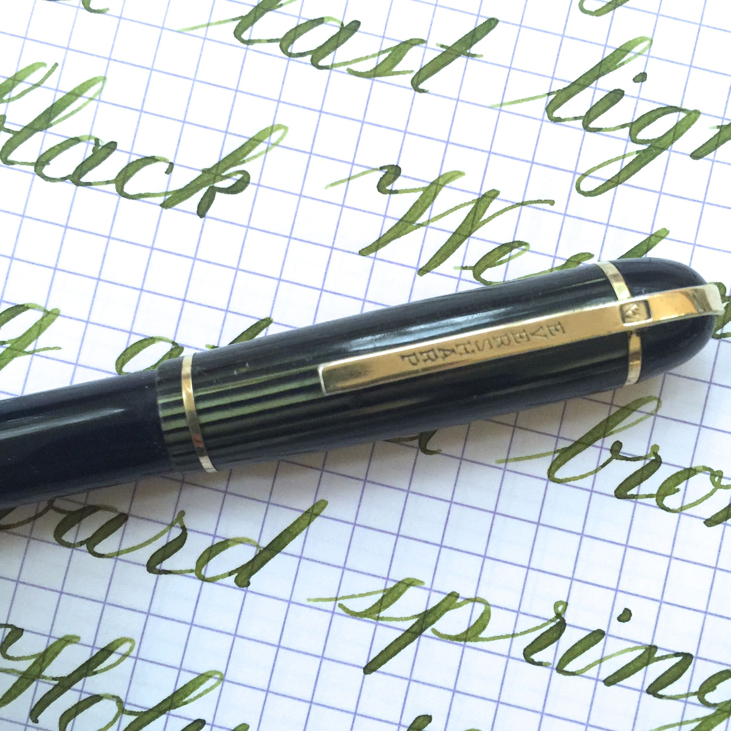 Here is a lovely Skyline in demi size. It comes in navy with green pin stripe cap. There is some scratching and scuffing on the body and cap. I was able to get some of it out with buffing and polishing. The most affected area is to the left of the clip where the pen looks to have been scuffed a bit. The gold-filled trim looks to be in good condition with no signs of brassing. The 14kt. Eversharp nib is a lovely smooth and wet writing fine. A very lovely nib for normal writing. It also has some flex that ranges from F to BB (1.5mm). The flex is a bit too stiff to be considered super flex in my opinion, but you can still do some decent work with it.