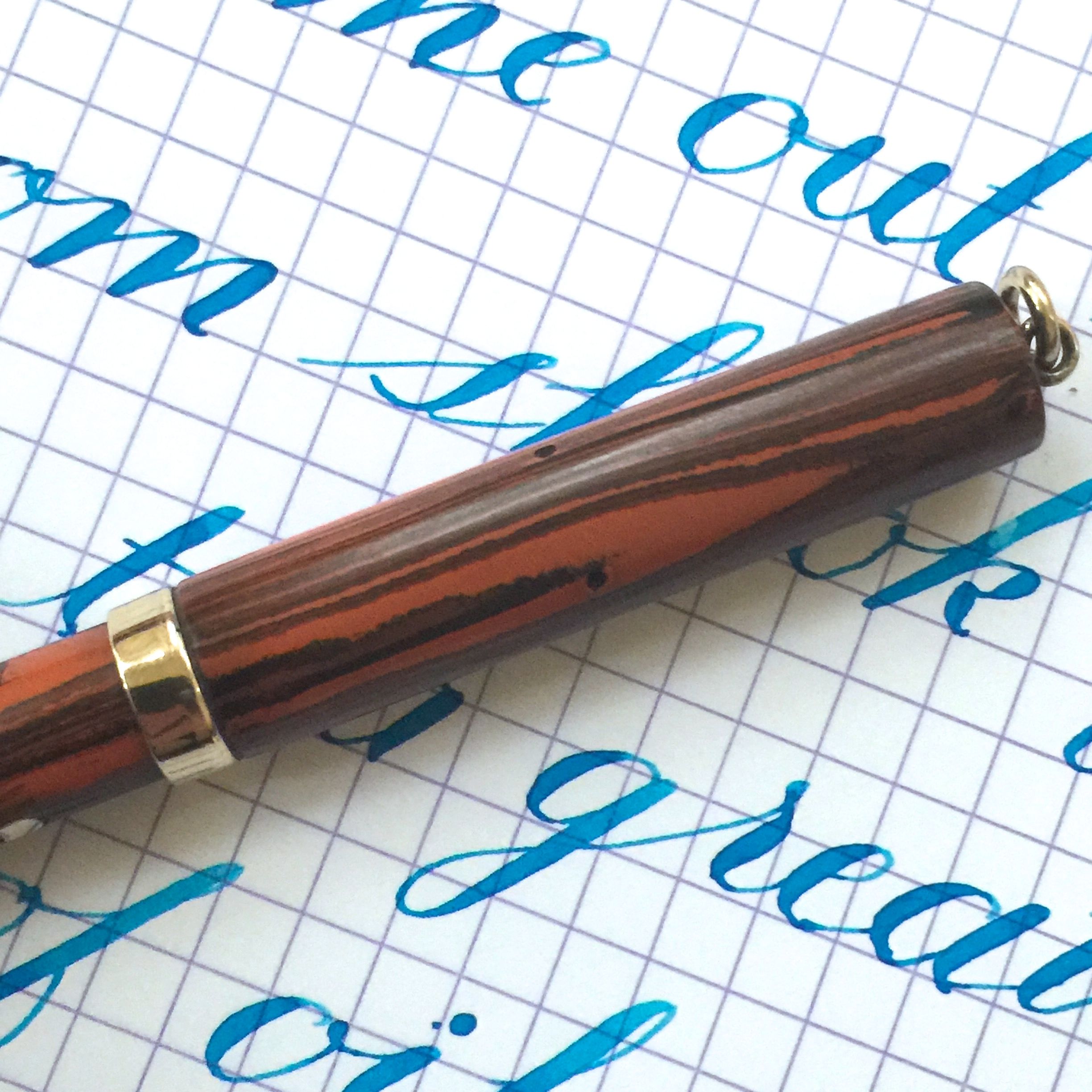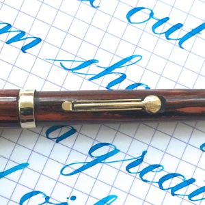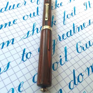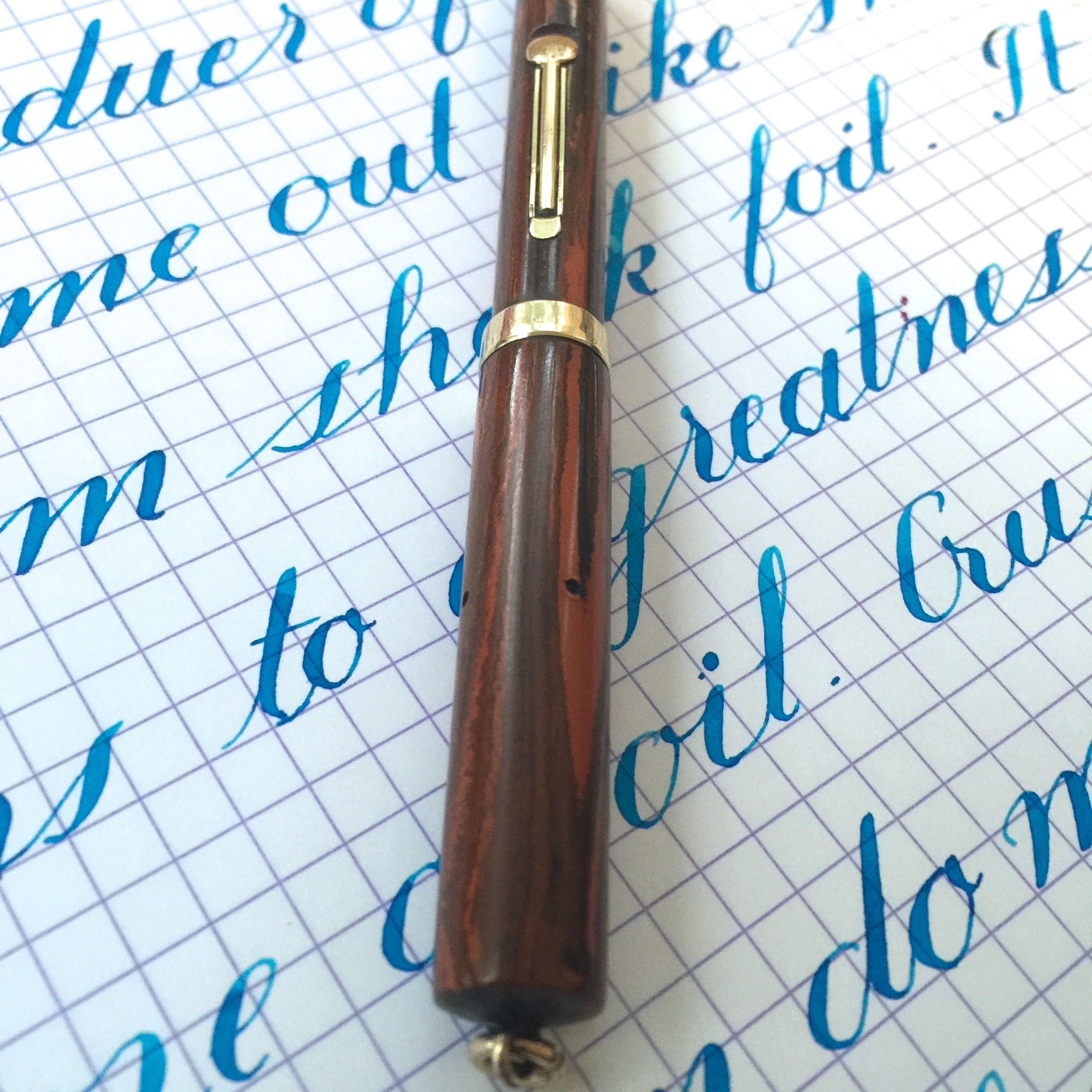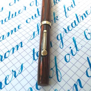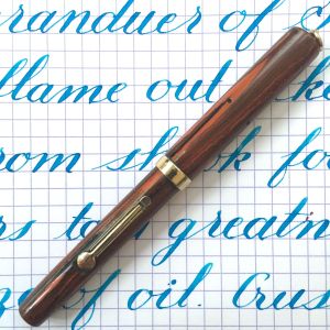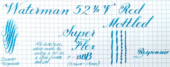Here is Waterman 52 1/2 V in red mottled hard rubber. The pen is in excellent condition. There is a little bit of fading to the hard rubber, but it still has pretty good color. The gold-filled trim is also in good shape. There is a tiny bit of brassing on part of an edge on the band, but that is all that I see. Imprints on the side of the barrel are a little faded but readable. The “52 1/2V” on the back is good and crisp. The beauty of this pen is it’s nib. It is a wet writing F that is oblique. The oblique tip makes normal writing look more stub like and it makes the flex writing more crisp. The nib has fantastic flex with a range from F (0.4mm) to BBB+ (1.9mm)! That is a pretty massive range. The nib is soft and nearing wet noodle in ease of flex, but it isn’t quite there. It also has a great springy feel to it with good responsiveness. It’s a fantastic, unique pen.