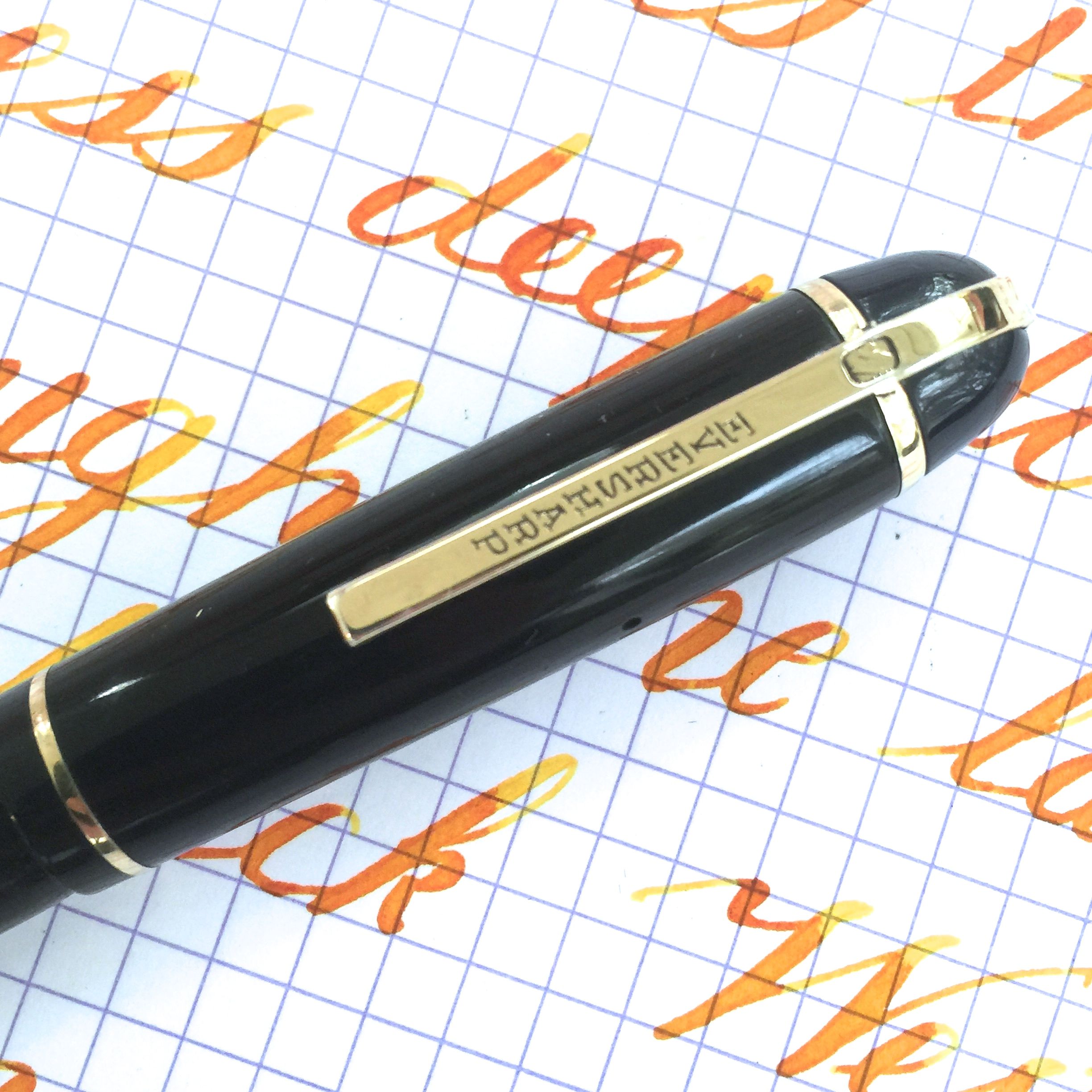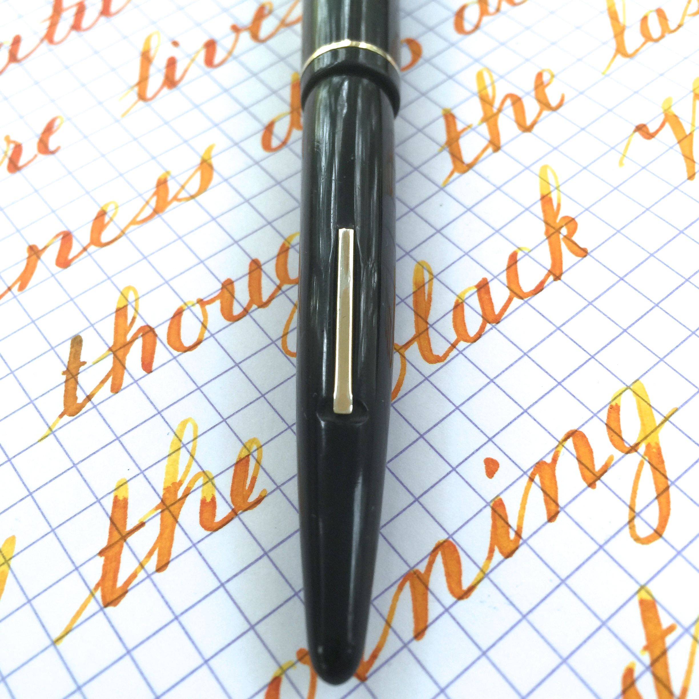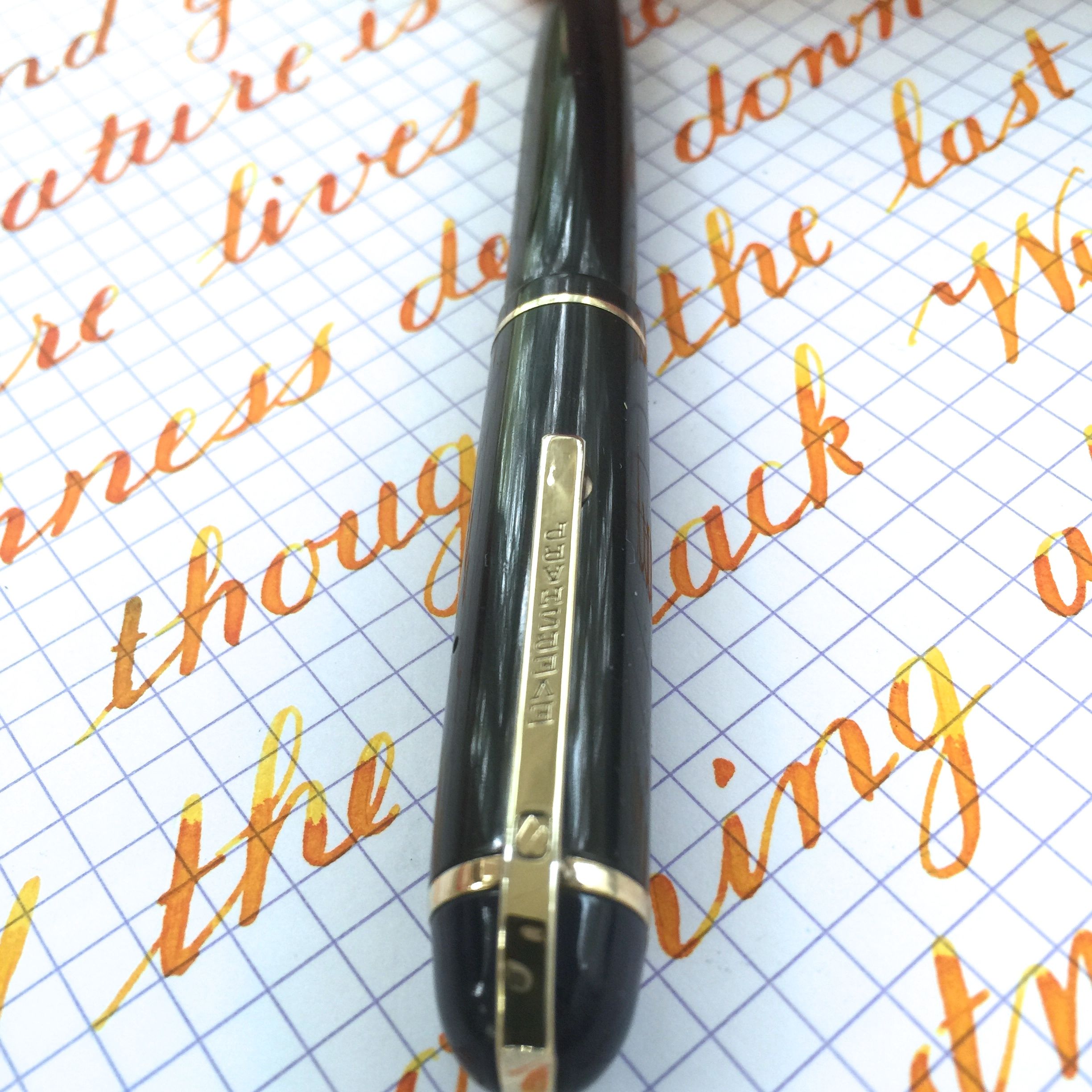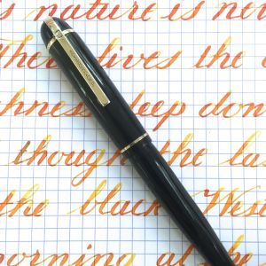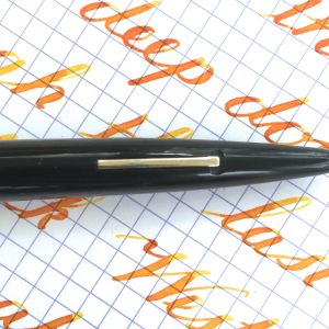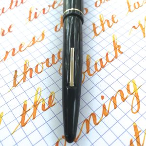 Here is a standard size Skyline in navy blue. There is some light scratching on the body and cap, but most of it has been buffed and polished out. There is a tiny nick on the body just below the cap. Actually it is more like a tiny flat spot. The gold filled trim looks to be in good condition with just a hint of plate loss on the crown of the lever from the cap rubbing it when posted. The 14kt. Eversharp nib is a very wet writing M (0.5mm) that has a nice range of flex going up to BBB (1.8mm). The flex is a bit too stiff to be graded higher. It’s a beauty of a Skyline, and if you like wet nibs this should be a hit.