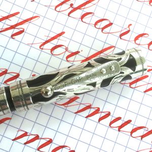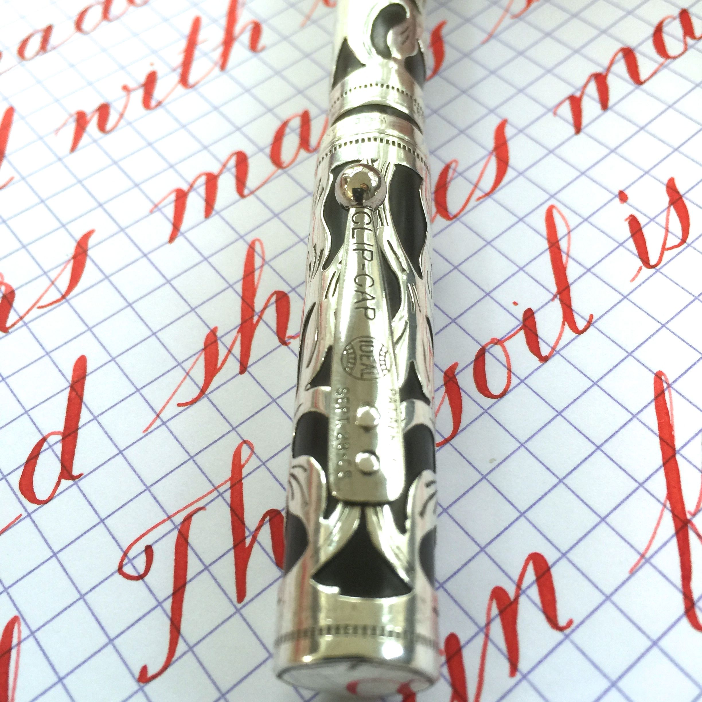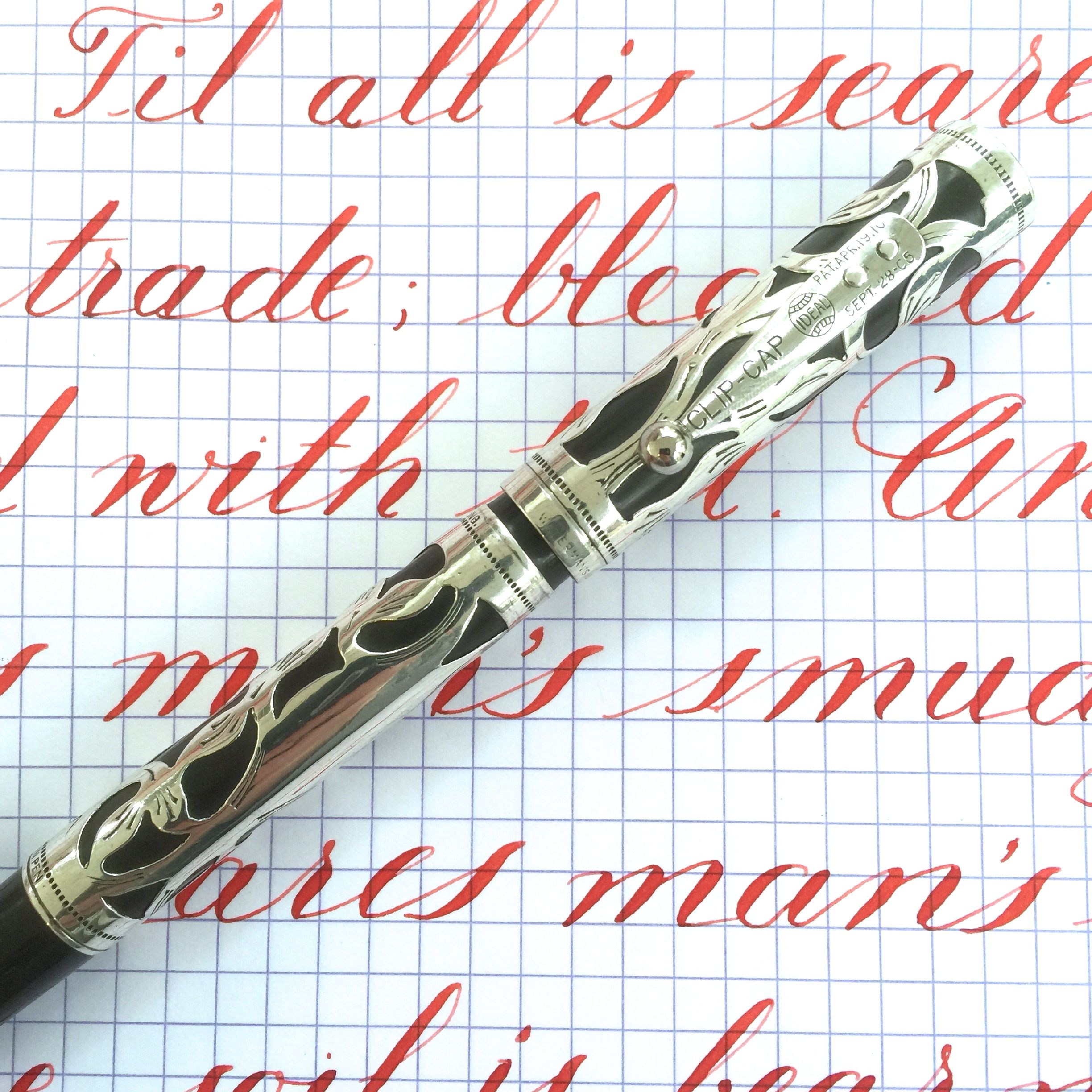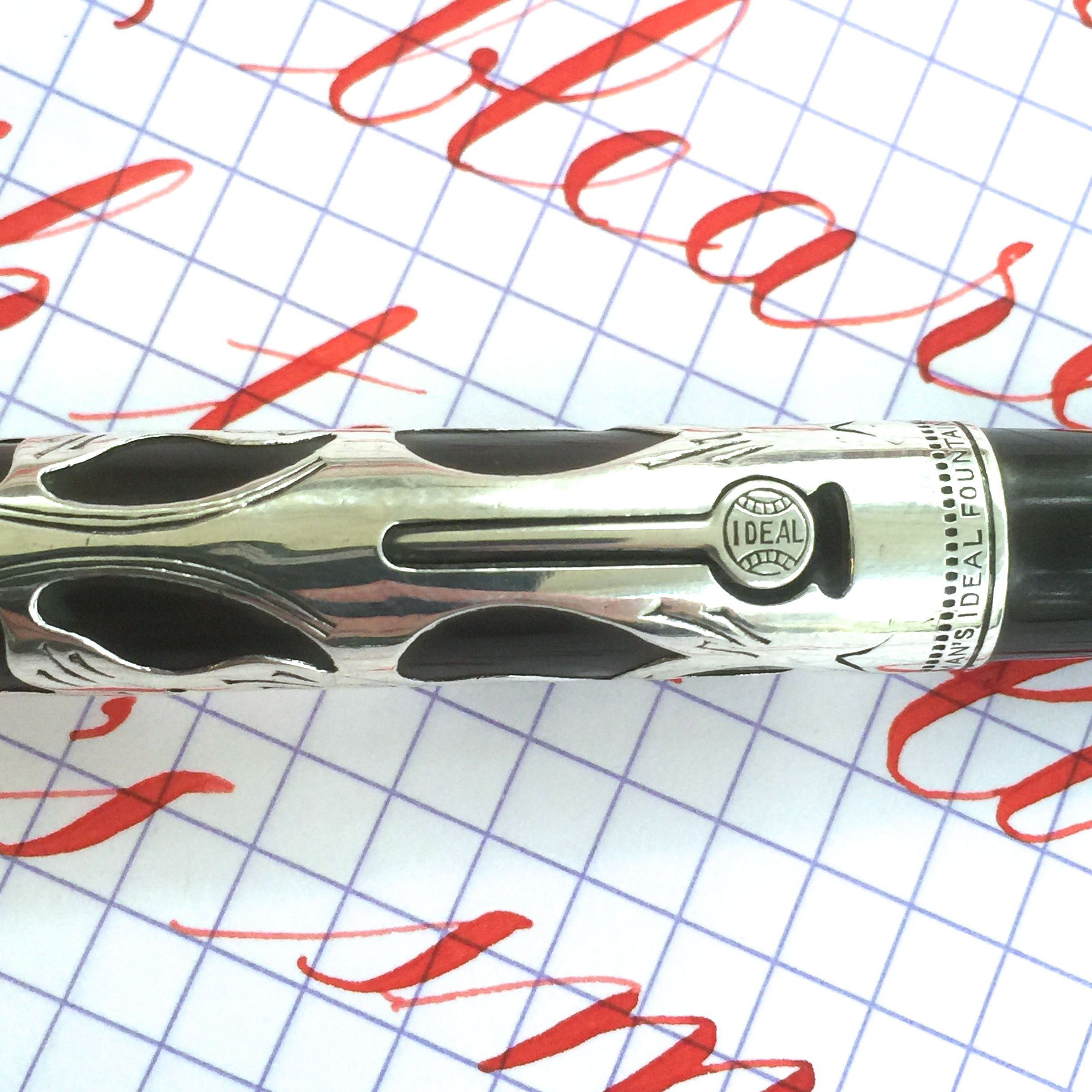 Here is a Waterman 452 with a nice Sterling Silver filigree overlay. The black hard rubber body under the overlay has faded to a dark blackish brown color. There is no longer any imprint on the end of the barrel. The lever is in good condition. The 14kt. Waterman #2 nib is smooth and soft writing XF that has medium flow in normal writing. The flex on this pen is quite nice. It comes quite easily and has a nice springy, responsive action to it. A great, high quality Waterman with some great flex.