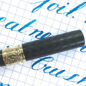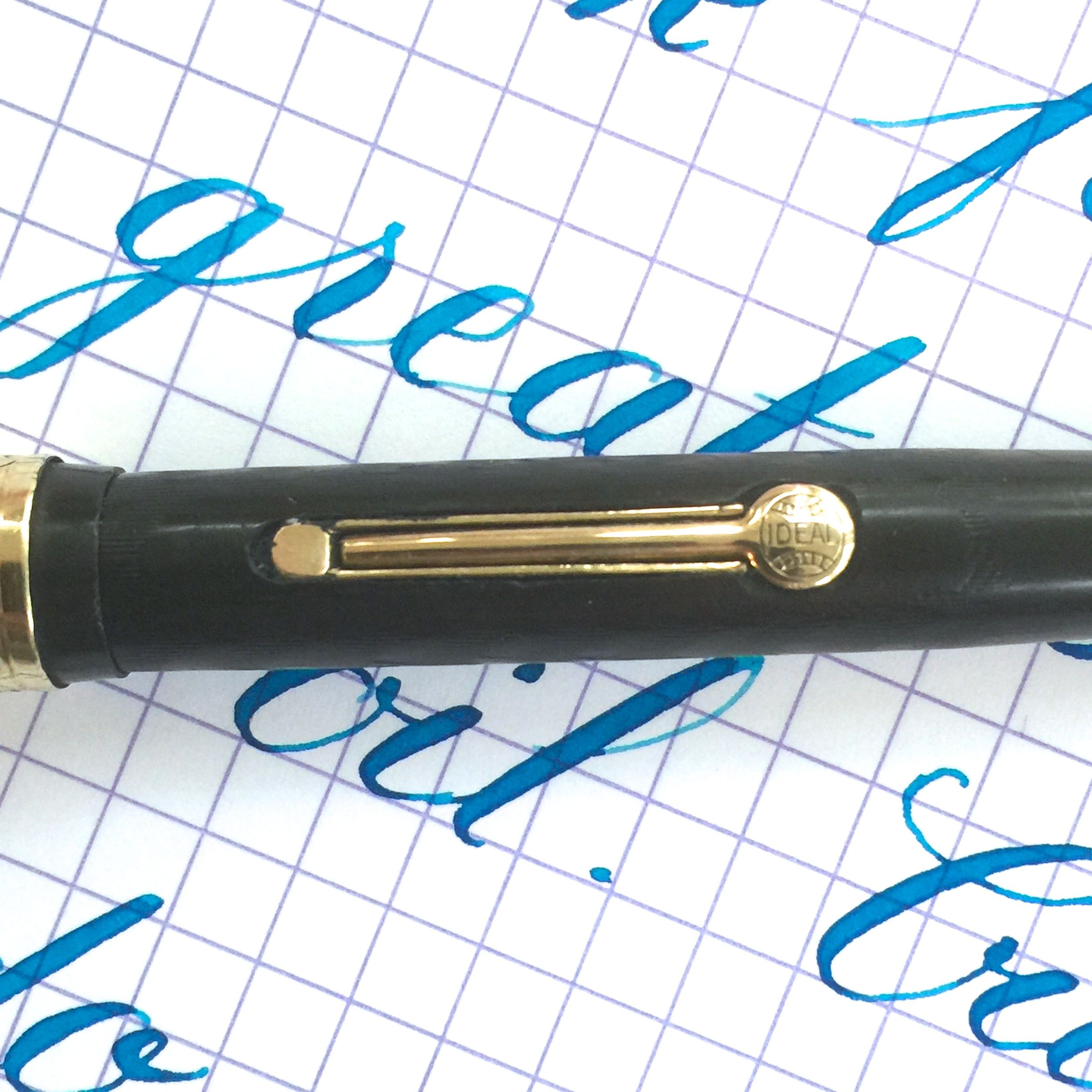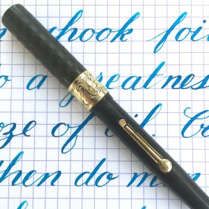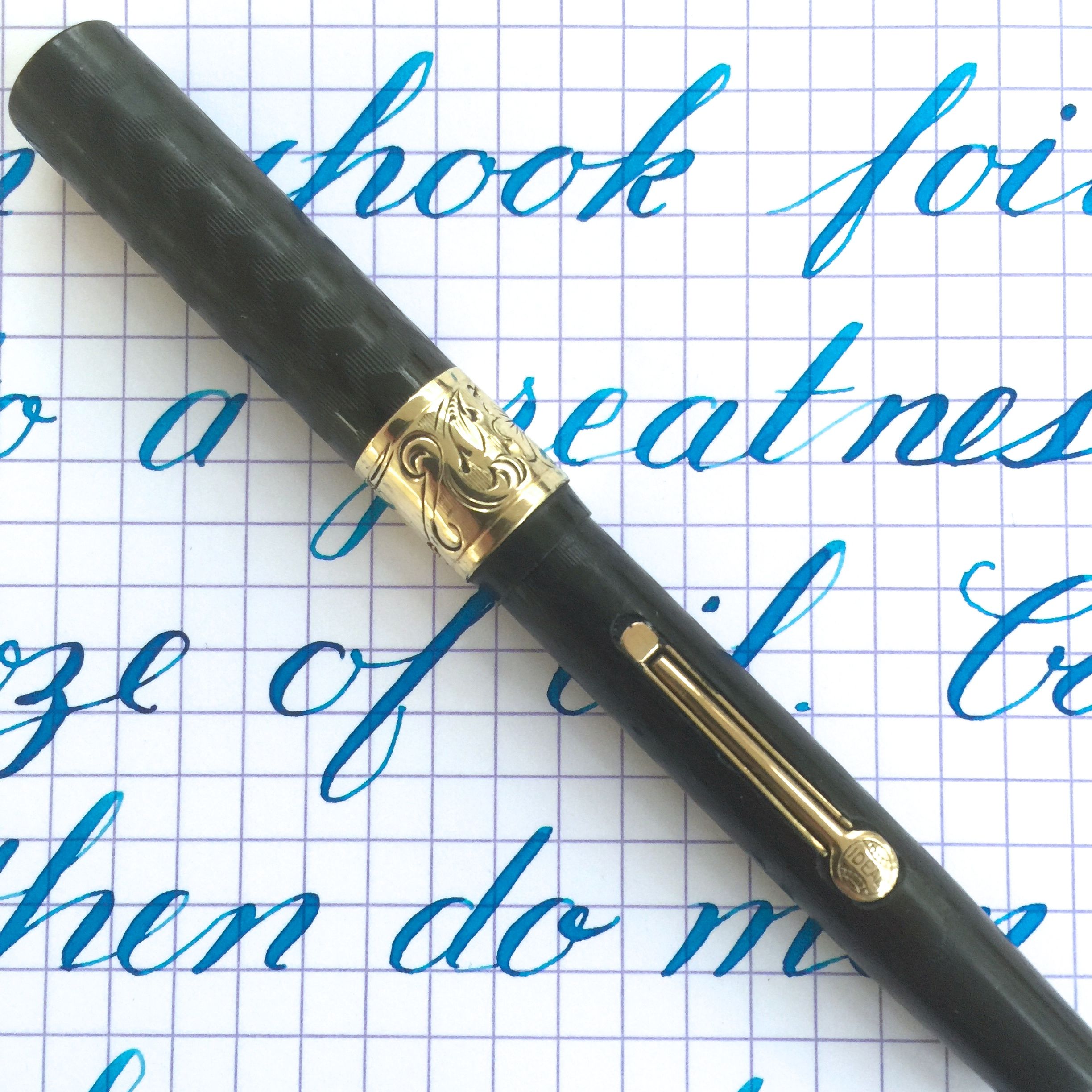 Here is Waterman 52 1/2 V in BCHR and gold-filled trim. The chasing on the pen is still quite good with just a little wear. The imprints are also all good and crisp. The hard rubber has faded some to a dark blackish brown. The large repousse band and lever are both in good condition with no brassing. This cap had neither a clip nor a ring top, which is fairly unusual for 52 1/2 Vs. The 14kt. Waterman #2 nib is a very wet writing F that writes soft and smooth. It has good ease of flex and a nice range going from F to BBB (0.4mm-1.8mm). It also has pretty good responsiveness for how wet the flow is. A great, portable Waterman in very nice condition.