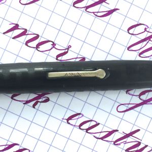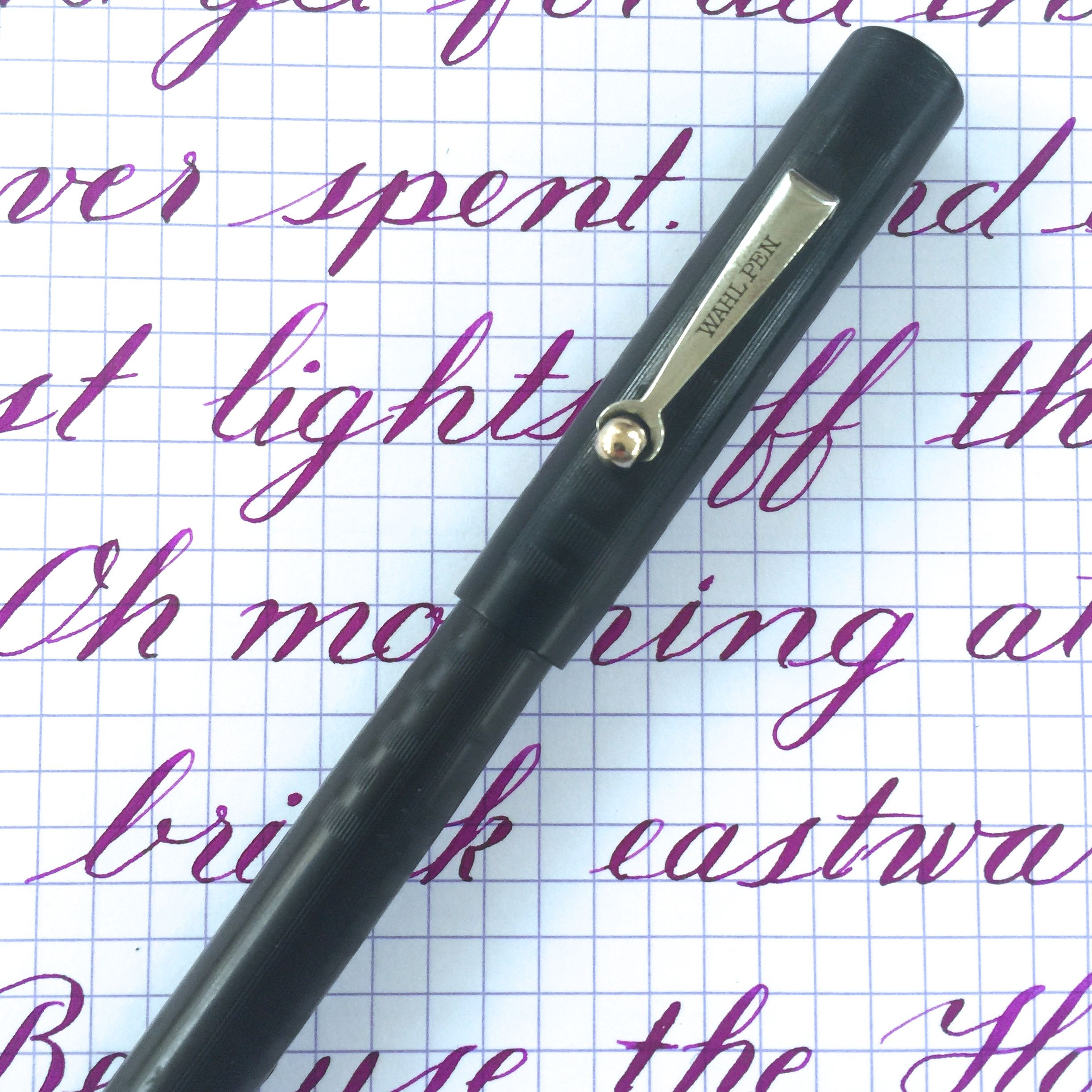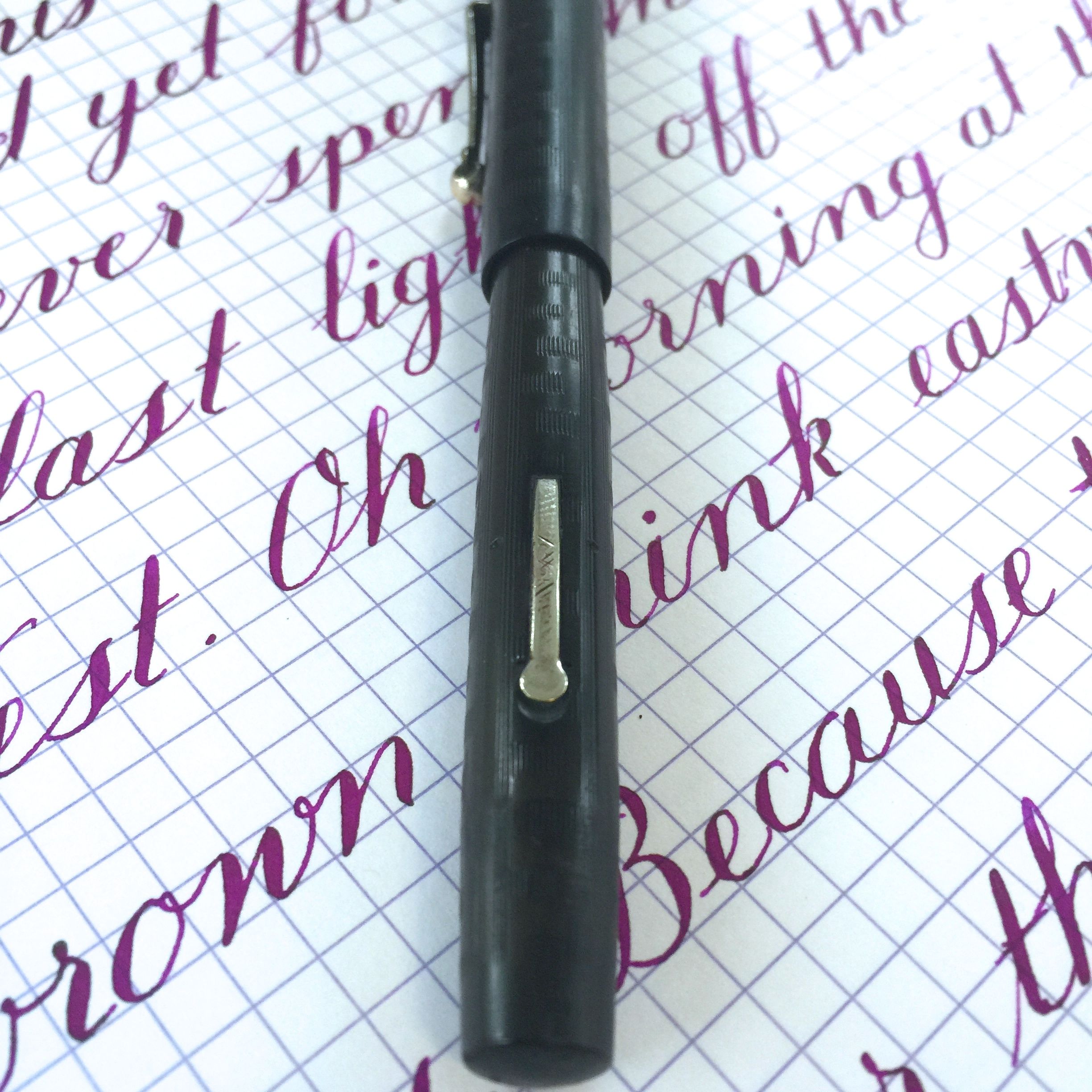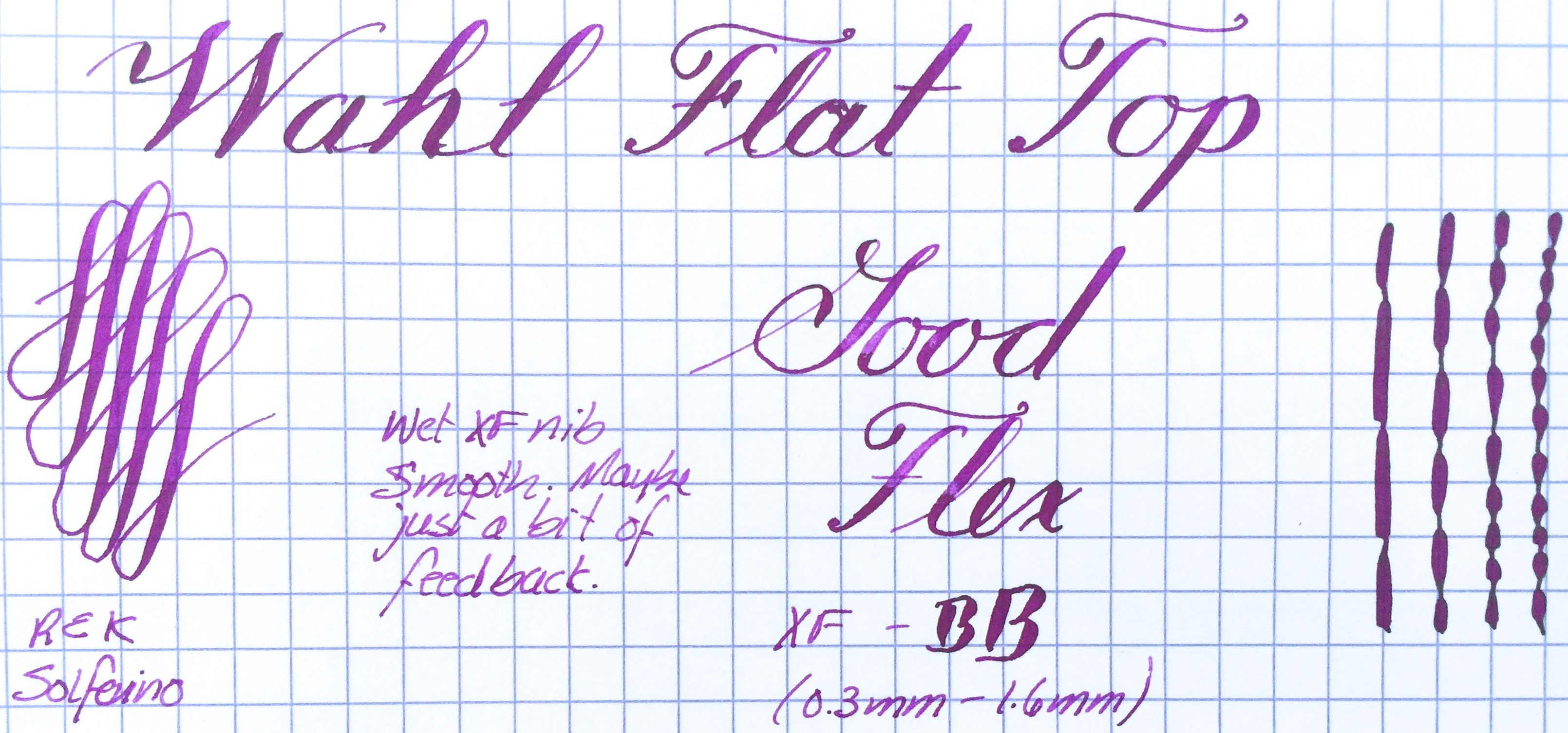 Here is a Wahl Flat Top in BCHR. The hard rubber is still quite dark. The cap is still black and the body is a dark brown. The chasing is still very good. There is some scratching on the back of the barrel (from being posted I assume). There are also two small cracks on the lip of the cap. They appear stable. The nickel plated lever has some scratches. The clip looks pretty good with some wear, but still looks pretty good. The 14kt. Wahl #2 is a smooth writing XF (0.3mm) that writes wet but not gushing. The flex on this pen goes up to 1.6mm (BB). The flex is a little too firm to be graded super flex, but it has pretty decent responsiveness. This pen still has plenty of life left in it.