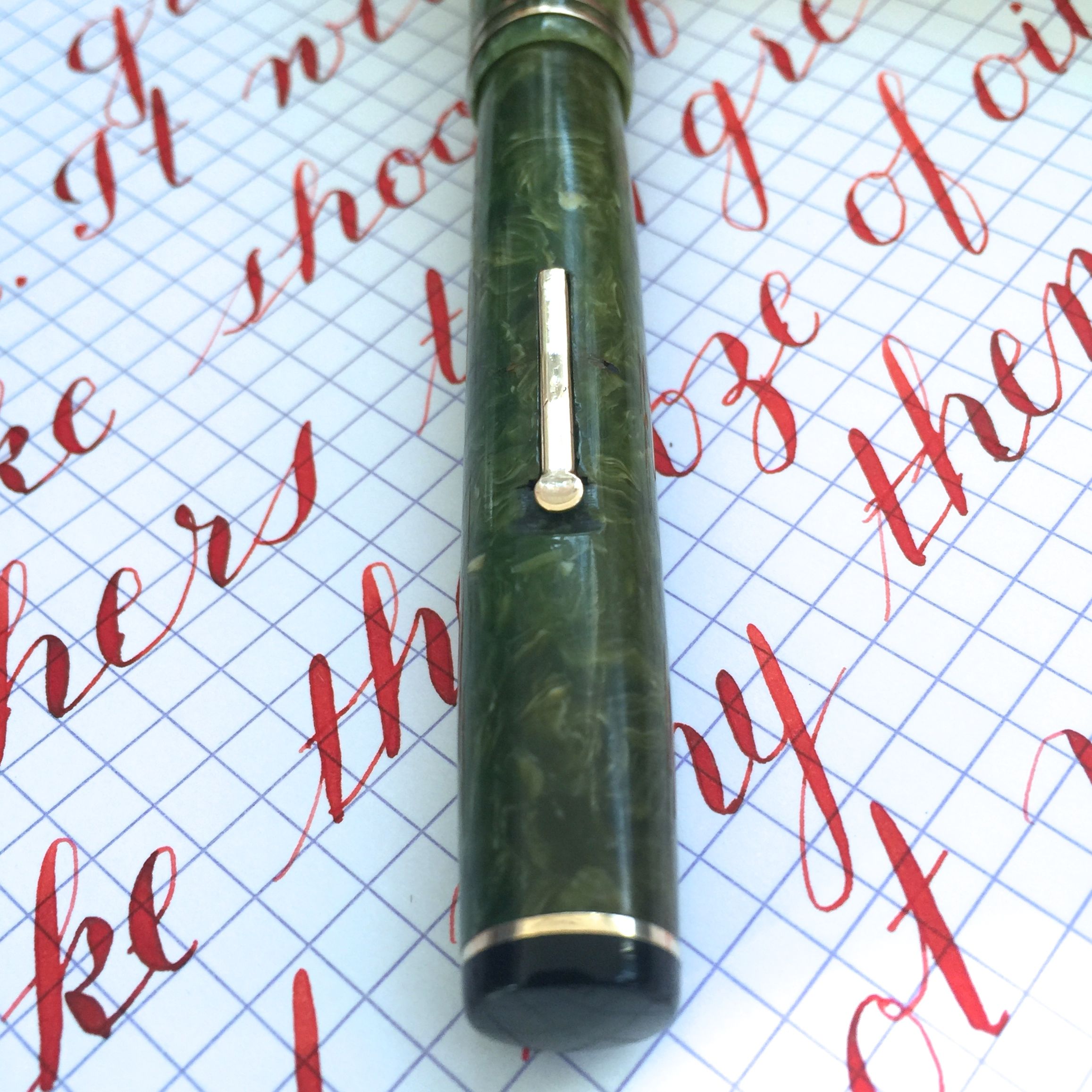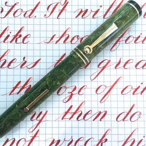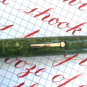 Here is a Wahl Flat Top Oversize pen in a green celluloid. The pen is in pretty good condition. The green has browned in spots on the cap (probably due to ink staining from inside the cap), and is a hair lighter in color on the cap than the body. But overall the color is quite good for this material which is generally much more altered. The black hard rubber ends are still jet black black and shiny. The gold filled trim all looks to be free of brassing. The one flaw the pen has is the lever is a little bent in the middle leaving the bottom and top of the lever sticking out from the body a little. There are also a few marks on the lever. The massive 14kt. Wahl-Eversharp nib is a factory made Gold Seal “FLEXIBLE” (The “flexible” imprint is hidden under the section). It writes normally as a XXF (0.2mm) and has a nice flex range up to BBB (1.8mm). The flex is on the stiff side for a super flex, but with that kind of range I felt that grade was warranted. If you like big pens and fine nibs, this is for you.