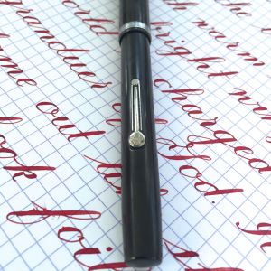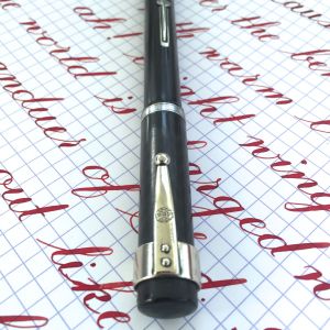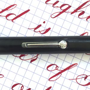 Here is a Waterman 52 in BCHR. The BCHR is browned to a dark brown and the chasing is worn and pretty smooth, though mostly visible. The nickel trim looks to be in good condition. I’m guessing this pen is from a French market with an after factory nickel band that is quite distinctive. The original lever was either lost or removed and instead replaced with a made in France Waterman “Ideal” accommodation clip. These clips are rather valuable in and of themselves and are gorgeous in my opinion. If you look close you can see a black stripe on the body just below the cap likely because this cap was a replacement. It is still a genuine 52 cap and threads beautifully. The 14kt. Waterman #2 nib is a very wet writing F (0.4mm) that has some nice springy flex up to near BBB (1.7mm). Very classy looking vintage Waterman with some nice flex.