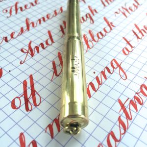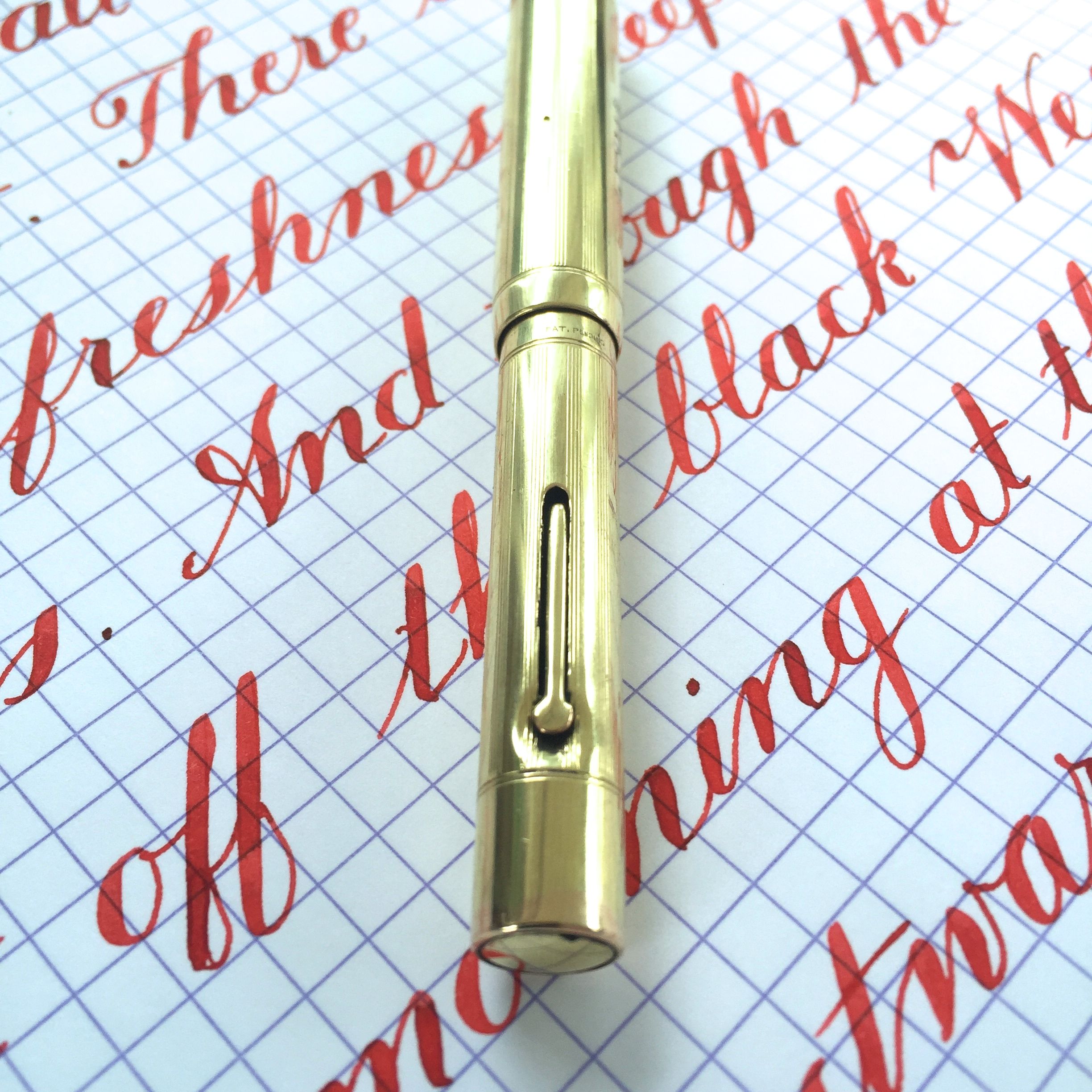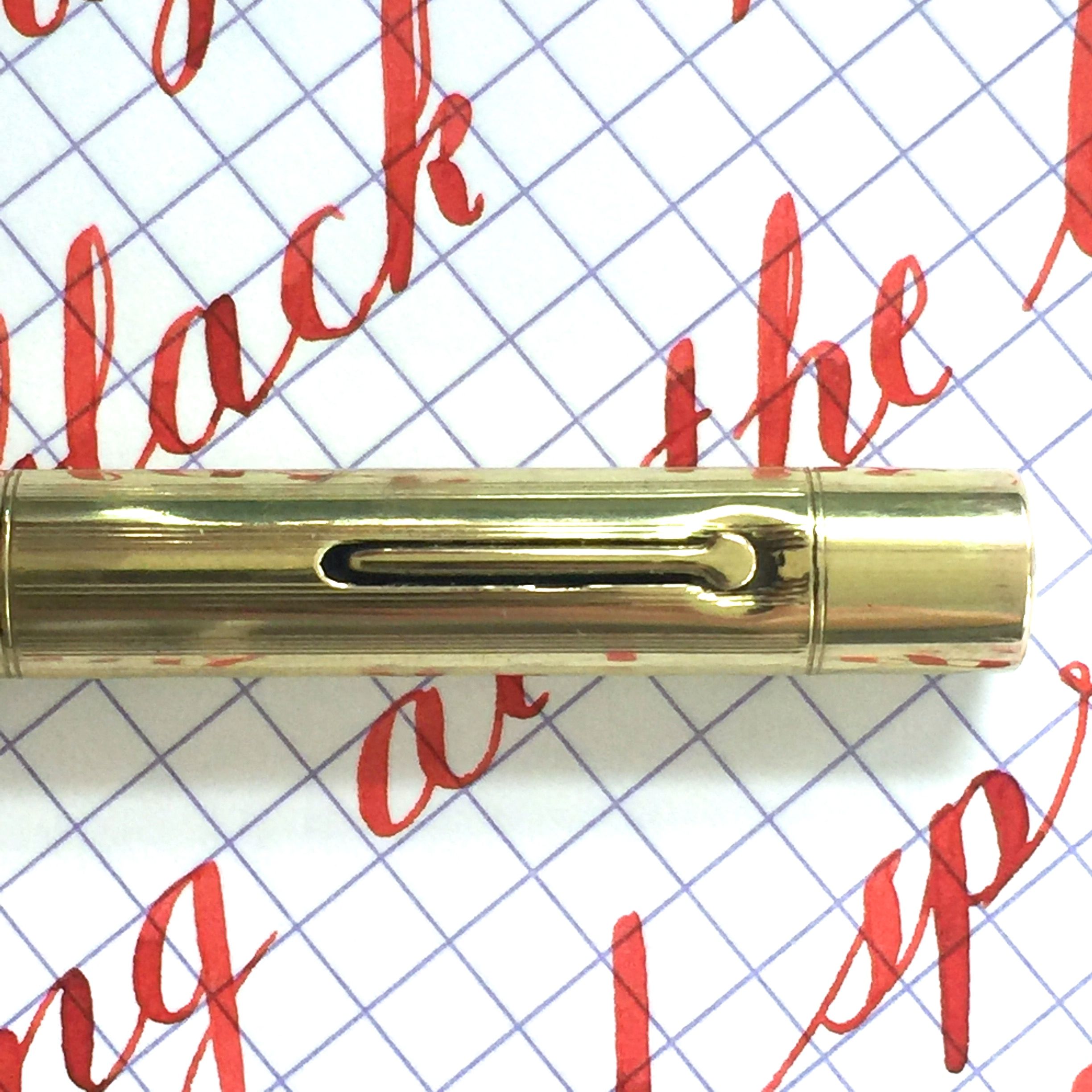 Here is a pretty little gold filled ring top by Moore. I like ring tops by Moore ring as they have a good quality feel to them. There are a nice weight and the caps always thread nicely. There is no brassing that I could find on this pen. There is one small ding on the body, but other than that the pen seems pretty clean other than the usual light scratching that comes with normal use. The initials “F.W.” are inscribed in the side of the cap. The 14kt #2 Moore nib is a very wet writing F that is smooth and soft, and it is has some fantastic flex. It ranges from a wet 0.4mm (F) to a large 1.8mm (BBB). It is very soft and smooth and has some nice responsiveness. A great, durable and portable noodle.