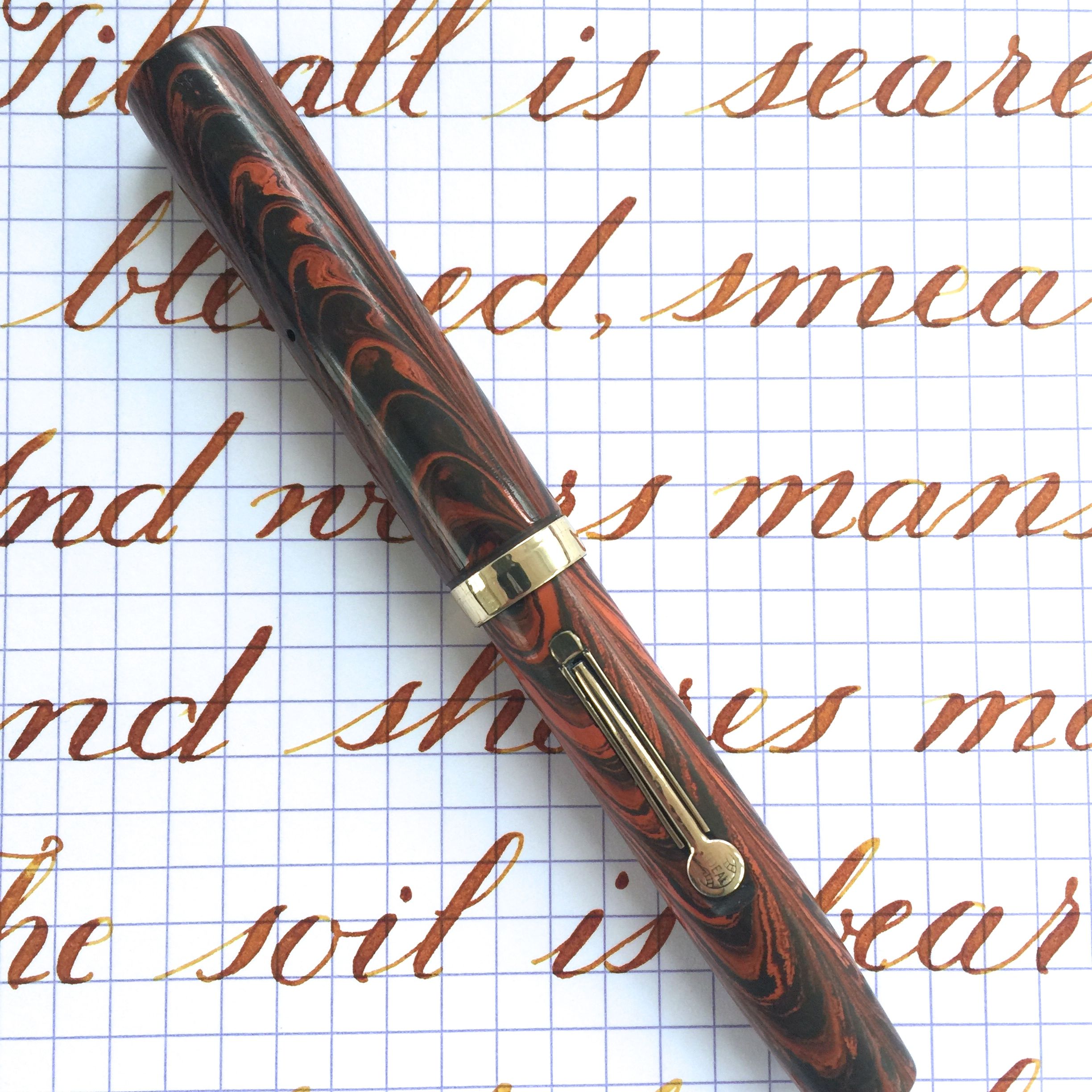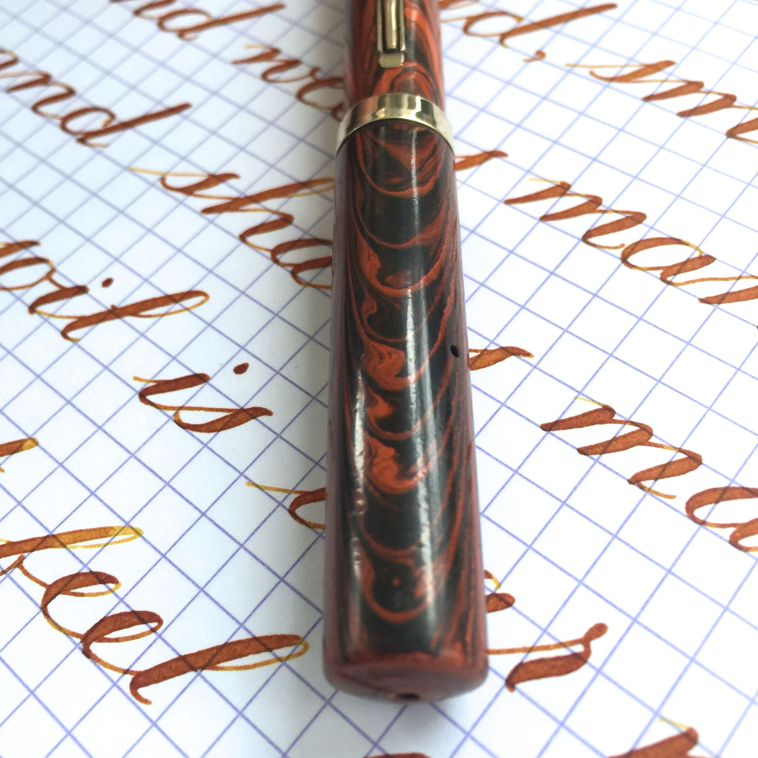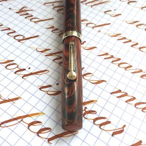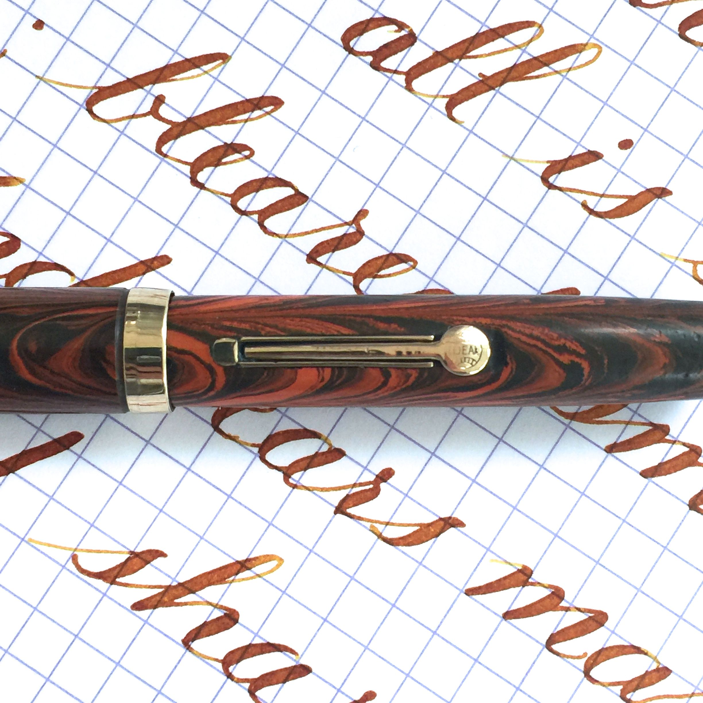 Here is a nice Waterman 52V in Red Ripple. The 52 is the vest pen version (thus “V”) of the 52. It’s same bulk as the 52 but shorter. Posted it’s meant to feel like a 52 unposted, and I think it succeeds. It’s one my favorite vintage Waterman sizes. The hard rubber is a bit faded, though not bad at all. The gold filled trim looks good with no brassing. There are some small impressions in the lever, but no plate wear. Imprints are faded and barely readable. It is missing the ring at the top. The 14kt. Waterman #2 is a gorgeous wet writing XF (0.3mm) that has some nice wet flex going up to BBB (1.8mm). Normally, it writes wet and springy like many Waterman’s of this era. The flex comes pretty easy, has plenty of flow to keep up, and pretty decent responsivess. It’s a great all around pen in beautiful Red Ripple.