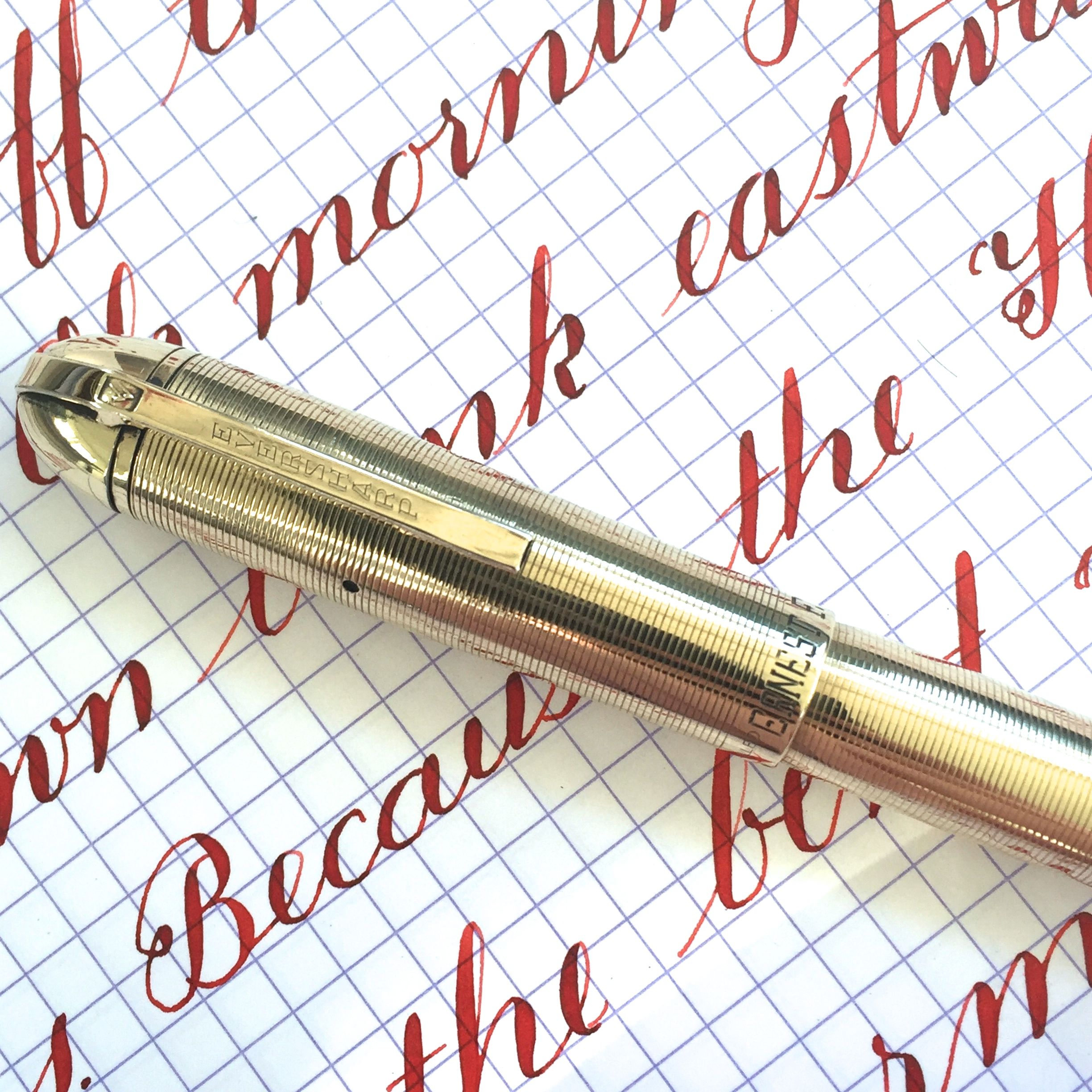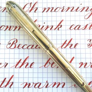 Here is a Skyline that was made to have a completely gold-filled body. There are almost no signs of brassing on this pen. There is a little plate loss on the middle of the lever from years of posting the pen. The pen has an inscription on the lip of the cap that reads “Ernest F. Gaul.” The pen does have two small dings. The first is very small, perhaps 2mm or so, in the cap. It’s more like a scratch. The second is a bit larger on the barrel. Most of the pen is ding free, however. The Eversahrp 14kt. nib is a beauty. It’s a wet writing, smooth F. And it has great flex going pretty easily up to BBB (1.8mm). Plus, it has some really nice responsiveness. Fantastic Skyline that isn’t easy to find.