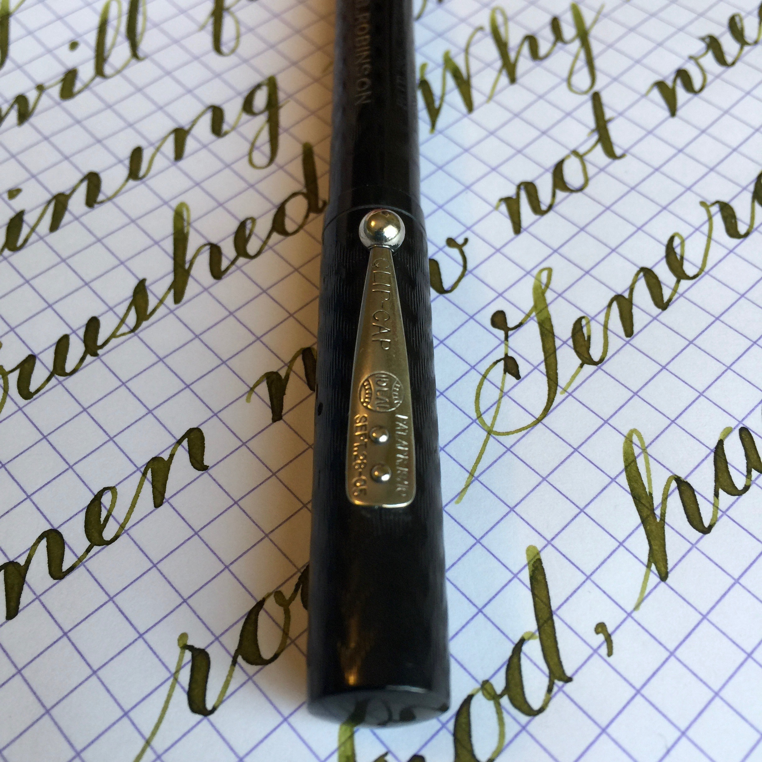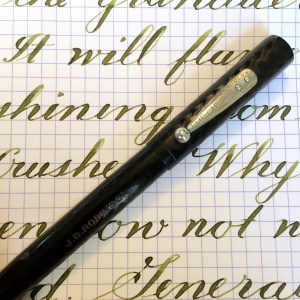 The Waterman 72 is the rarer eye dropper cousin to the 52. They are basically a 52 made as an eye dropper. It is bigger than the 12 and has a threaded cap rather than the old slip cap. This 72 is in beautiful condition nearing mint condition. There is minimal fading to the BCHR. It is still very black and the chasing and imprints are good and crisp. There is the name “J.B. Robinson” inscribed in the side. The nickel clip is in great condition as well. The 14kt. Waterman #2 is a very smooth writing F (0.5mm). This is a nice quality flex nib. It has a nice ease of flex going all the way up to 1.9mm with good responsiveness. It’s really approaching wet noodle status. Plus, it’s an eye dropper, so plenty of ink capacity. A great pen for the user and collector alike.