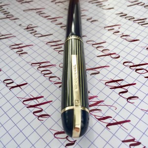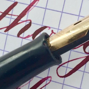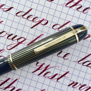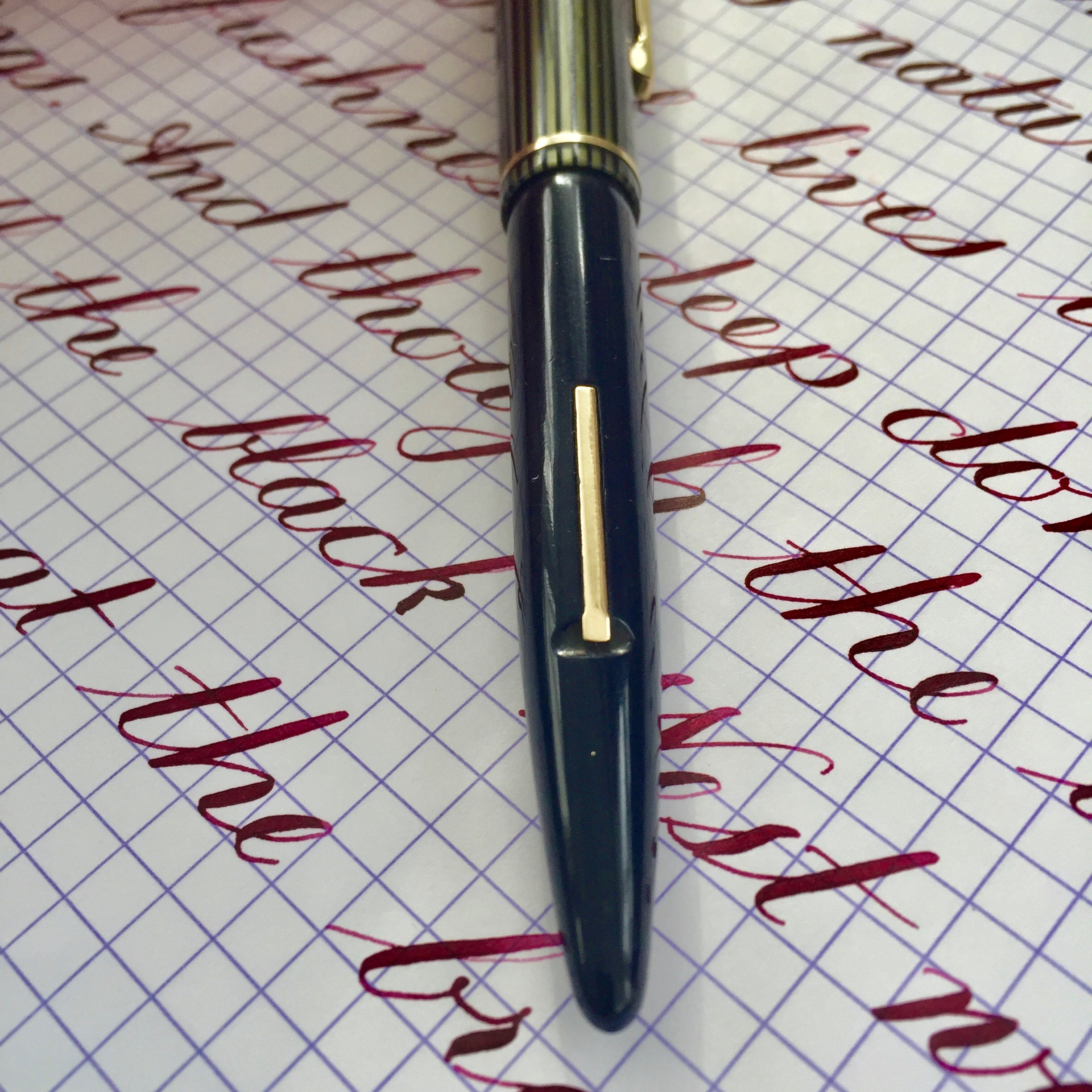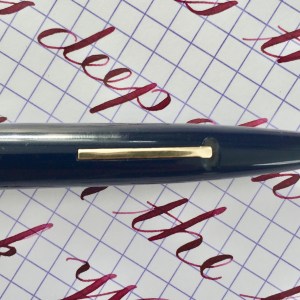 This Skyline come in nave with the green and navy pinstripe cap. The trim on this pen is in good condition with little to no signs of plate loss. The name “Max W. Reedy” is imprinted on the cap. There does appear that the pen was exposed to a little heat at some point. There are two small spots on the edge of the section near the nib where it seems a little a piece of ash or something fell. Otherwise, it looks to be in pretty decent condition. The 14kt. Eversharp nib is a nice writing XF. Unlike many Skylines it isn’t super wet but does have a good flow. I’ve graded the flex as a “super flex” which may be a bit generous. It’s a bit stiff for super flex, but it does have a nice responsiveness and great flow making nice flex writing pretty easy.