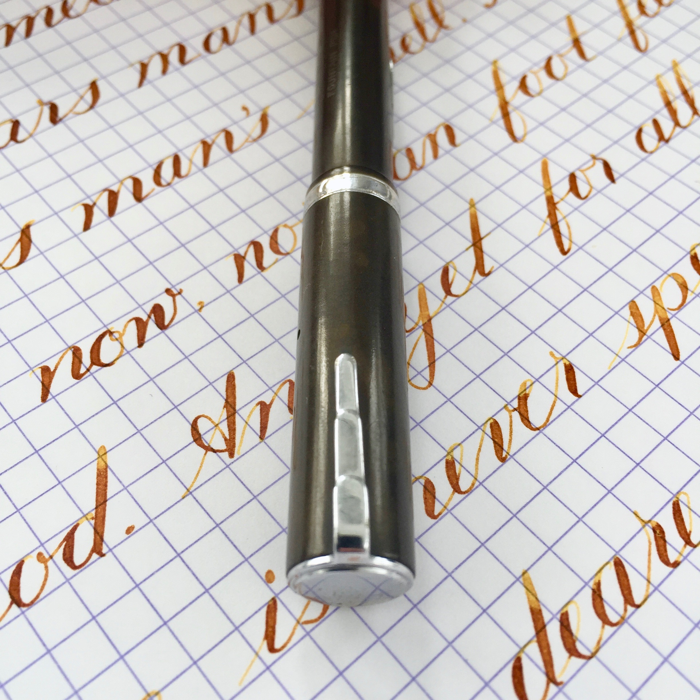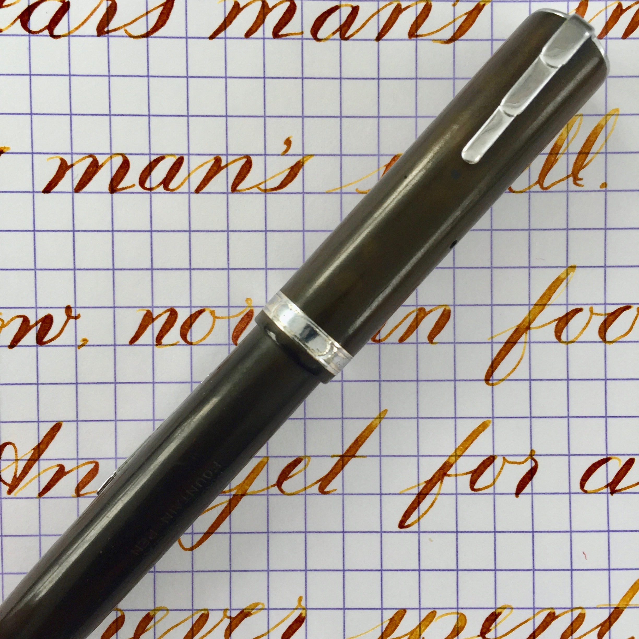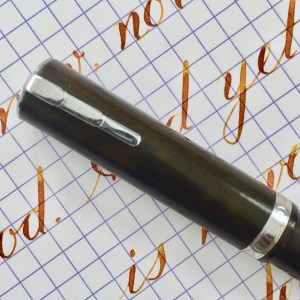 Here is a Waterman 3V in black hard rubber. The hard rubber has faded to a dark brown. The chrome trim has some scratching on the clip and the band. The lever looks pretty clean. Side imprint is readable, but the imprint on the end of the barrel is worn off. This pen did not have any chasing on the hard rubber originally. The 14kt. Waterman #2 nib is a nice, smooth writing XF (0.3mm) that has good flow but is not overly wet. It has some pretty good flex that ranges up to 1.6mm (BB+). The flow keeps up well and the nib has some pretty nice responsiveness. A nice vintage pen in “vest” size.