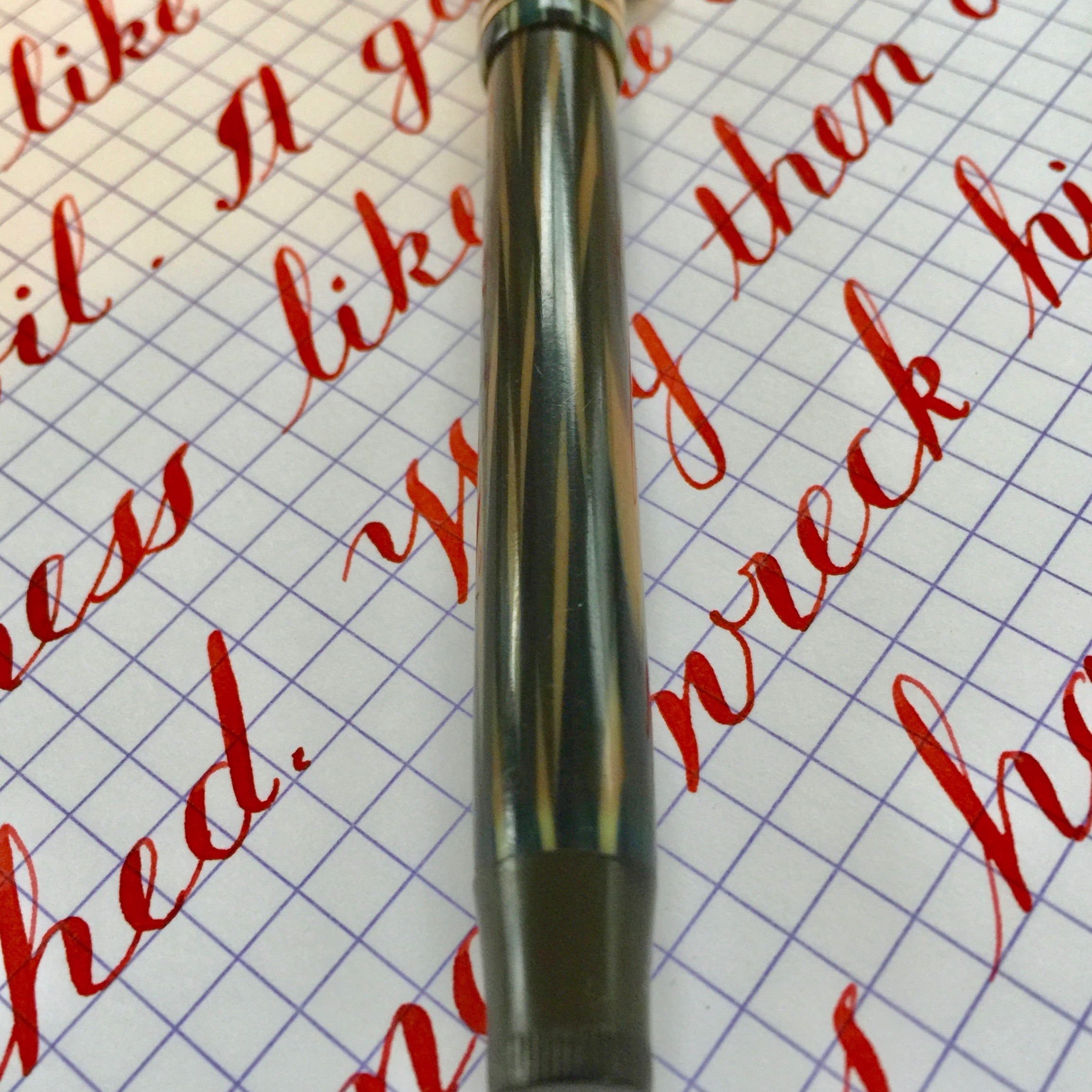 Here is a fine example of Parker Lucky Curve in the desirable “true blue” style. There is some color change as is common with these early Parker. The white on the barrel has tanned some and the blue has darkened. The color change (as is common) is less on the cap with the white being more creme and the blue a bit lighter. The black hard rubber ends have faded to a dark brown brown. The imprints are great with the original white paint still present. The gold filled trim is also in excellent condition with no brassing. A new pressure bar has been installed and the button is looking good as well. The 14kt. Parker Lucky Curve nib is a smooth writing F (0.4mm) with medium wetness, and it has some very nice flex. This “super flex” nib goes from 0.4mm to a large 1.8mm without much effort. The responsiveness is nice and crisp, and the flow keeps up easily. The true blues are not terribly easy to acquire and even more difficult to find one with a quality flex nib.