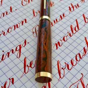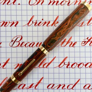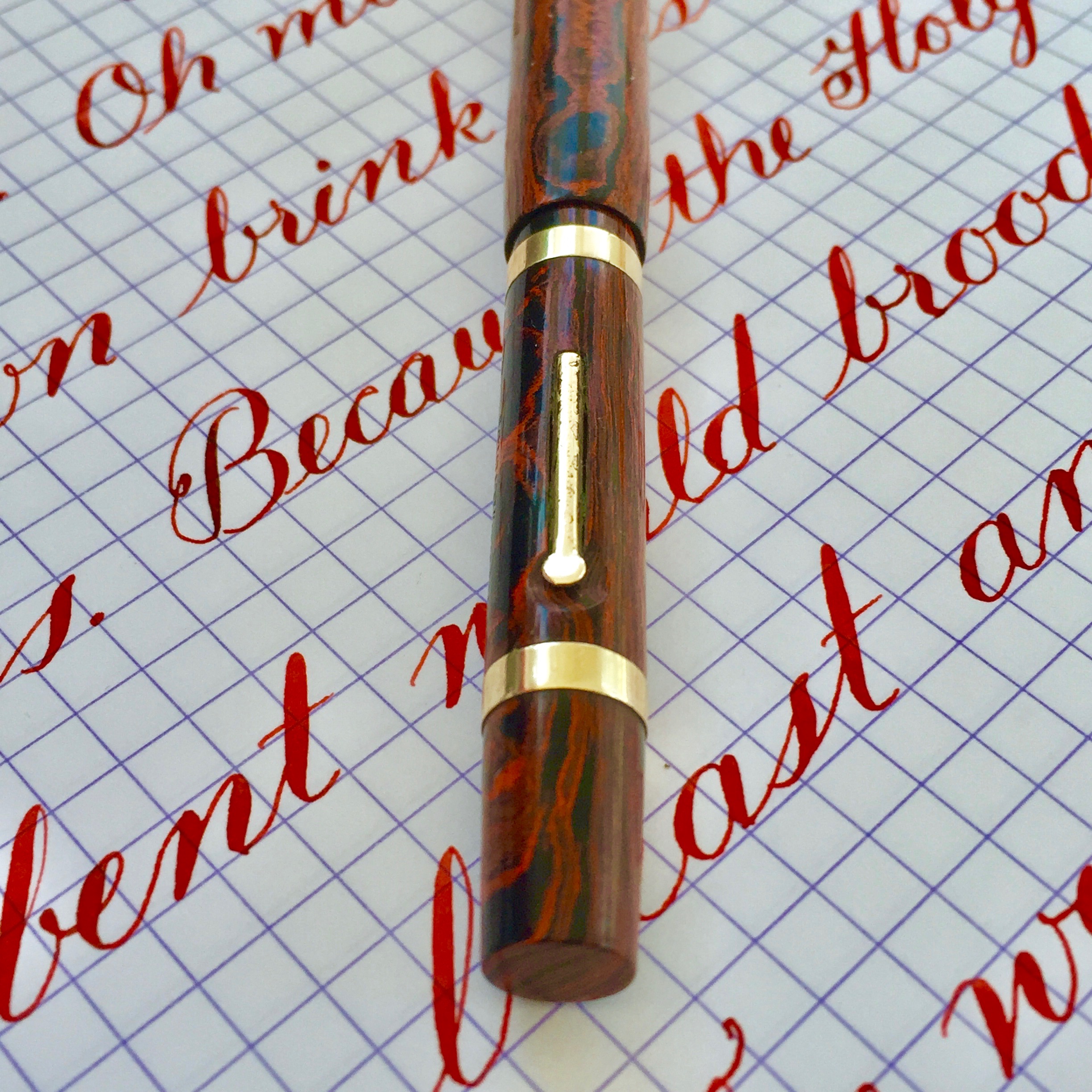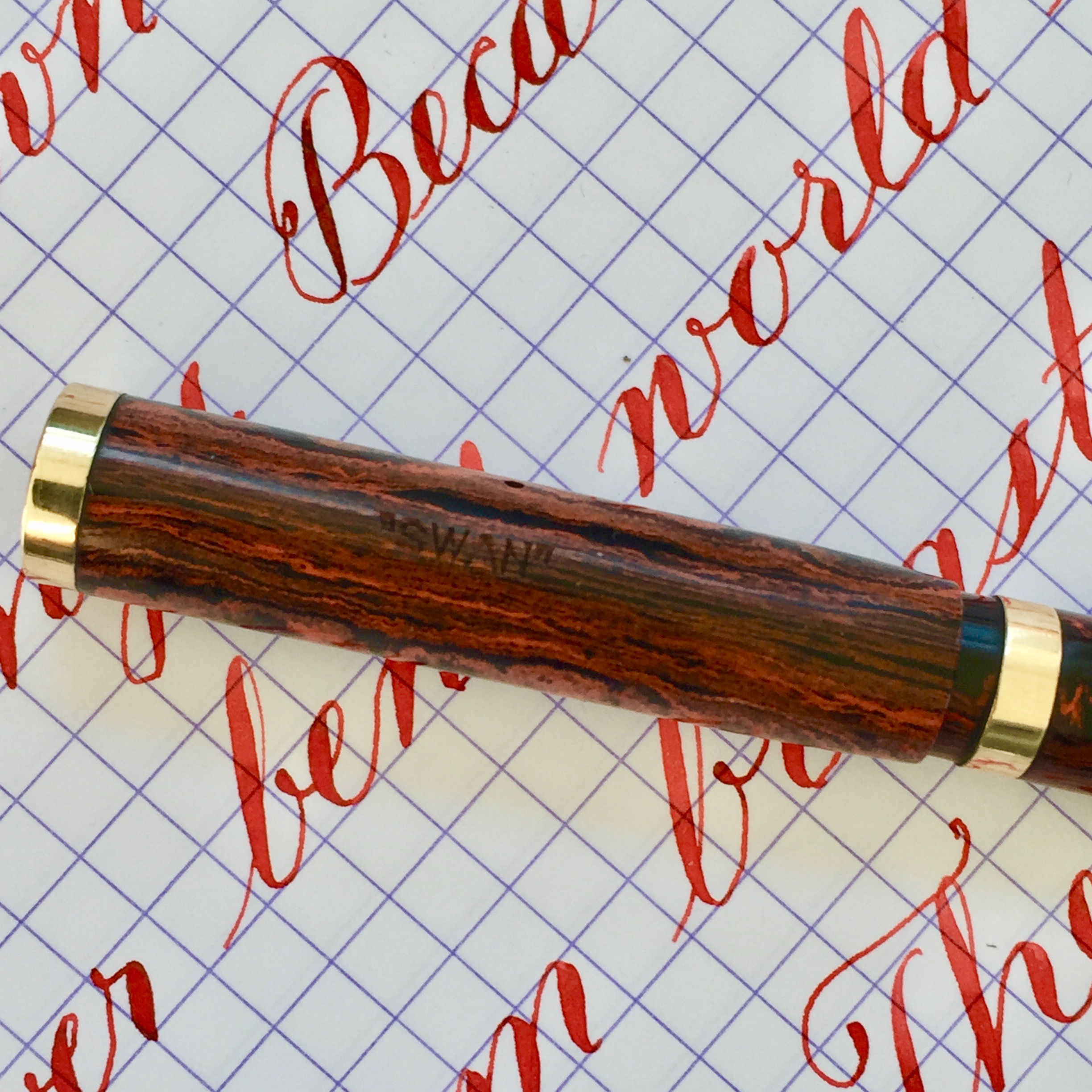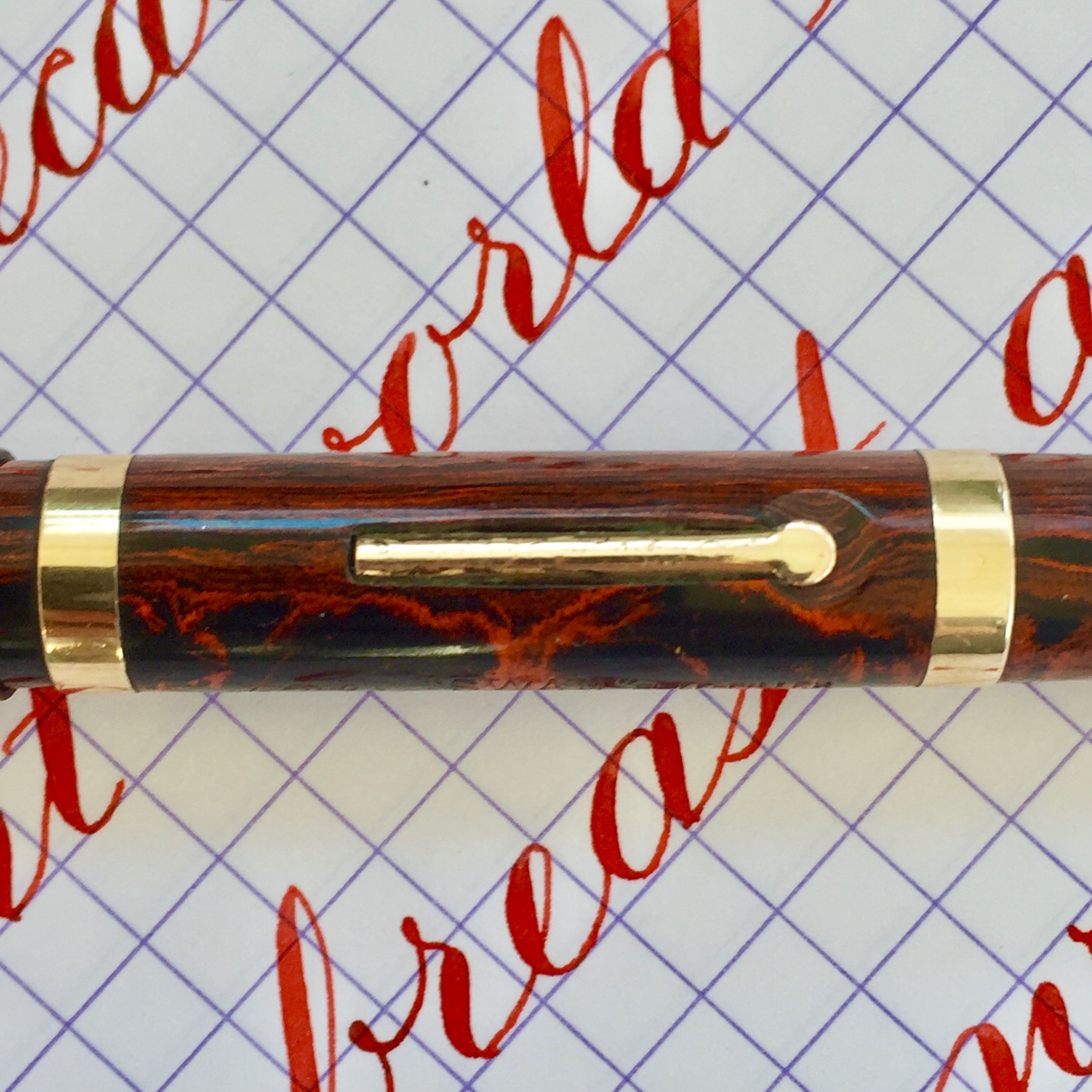 Here is a gorgeous Mabie Todd Swan Self Filler (numbered 130 B.S.F.) in red mottled hard rubber. It’s about the size of a Waterman 52 1/2V. The condition on this is superb. The red mottled hard rubber has very, very little fading. The body still has the original shine. It’s matted a bit on the cap, but it still has good color. The imprints are all very crisp and looking new. The exception is the imprint of the white swan on the top of the cap which is faded a little. The gold-filled trim also looks nice overall. The lever does have some wear and scraping. The 14kt. Swan nib is a long, slender tine beauty. It writes smooth normally as an XF (0.3mm). The flow is about medium wetness. Not too wet and not too dry. The flex on this is beautifully soft and really on the border between a “super flex” and a “wet noodle.” I conservatively graded it a “super flex.” It ranges up to BB+ (1.7mm) from XF, and it has good responsiveness. This is a fantastic vintage Swan in stunning condition.