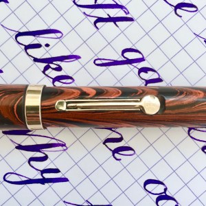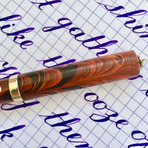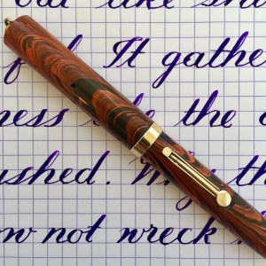 Here is a nice Waterman 52V in red ripple hard rubber. The red ripple has faded some, but not a lot. It still has pretty good color. The imprints are all present and readable. A little faded but also not a lot. The gold filled trim is also in good condition. The one blemish is on the lever where at the base there is a small scrape. The 14kt. Waterman #2 is a soft and smooth F (0.5mm). It has a springy feel to it and is a lovely writer, especially if you enjoy wet nibs. The flex comes easily on this nib and ranges up to near BBB (1.7mm). The responsiveness of the flex is average. Overall, this is a beauty of a pen in very nice condition.