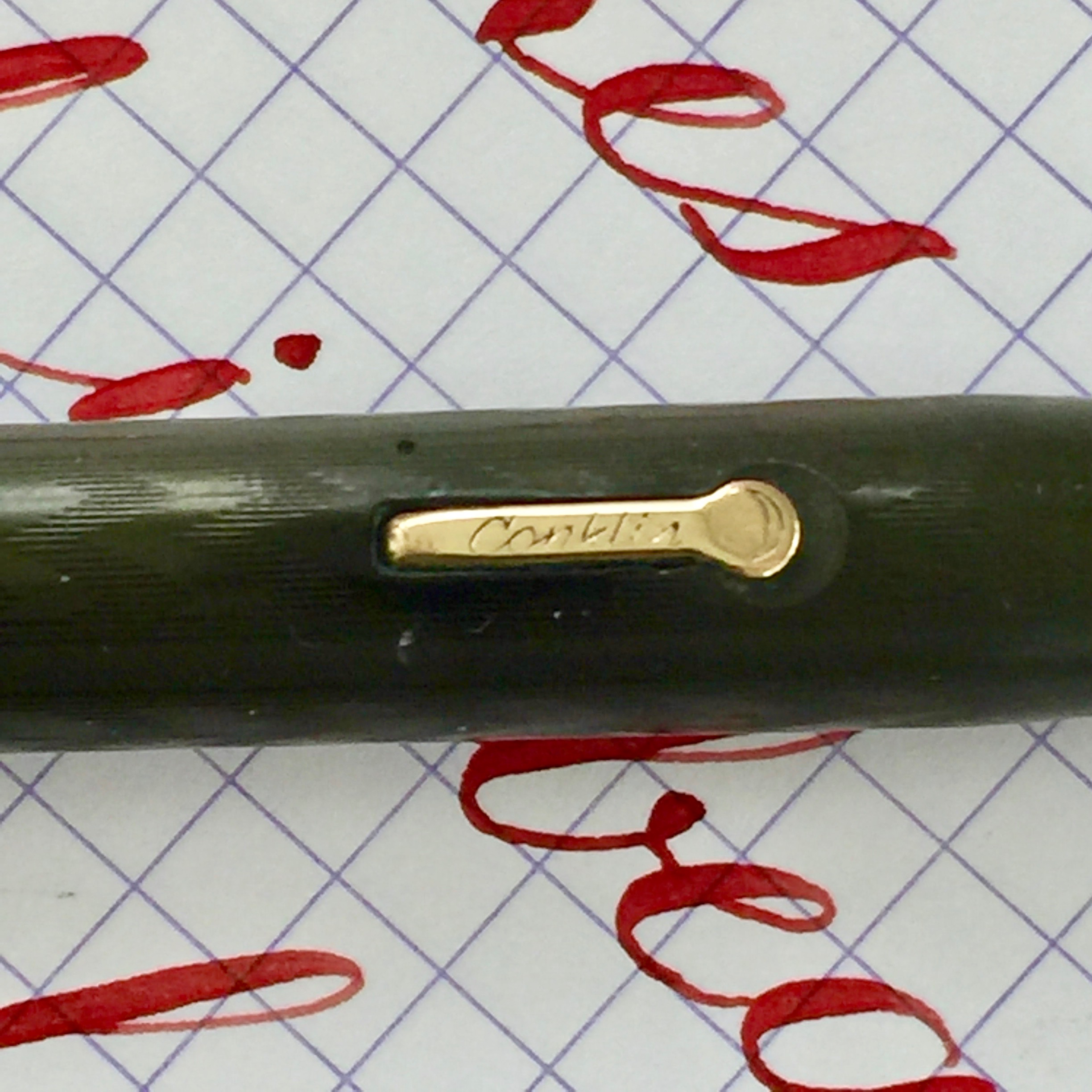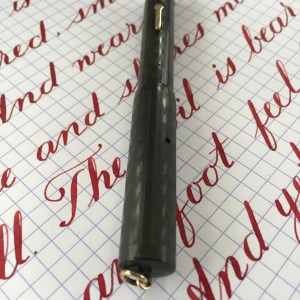 Here is a Conklin vest pen in BCHR. The hard rubber has faded some to a dark brown. The chasing is slightly worn but still pretty good. The imprints are also a little worn but easily read. The gold filled trim is in good condition without any brassing. The 14kt. Conklin #2 is a ultra smooth writing F (0.45mm) that flexes up to BBB (1.8mm). This nib is right on the border between “good” and “super” flex. It has the range of a super flex nib, but is a bit on the stiff side for super flex. Still, a nice flex nib.