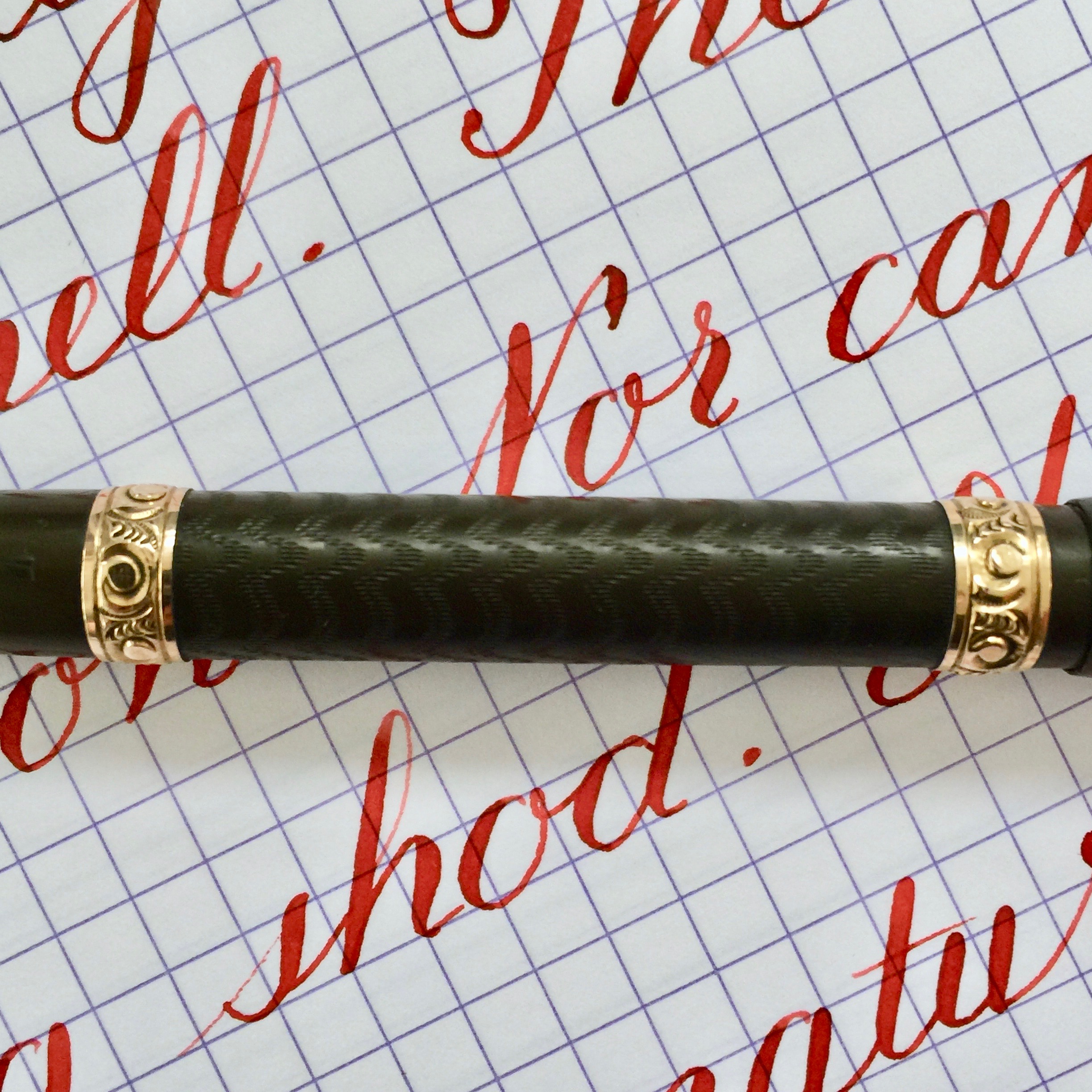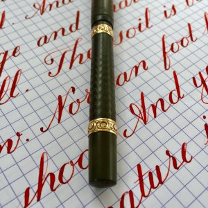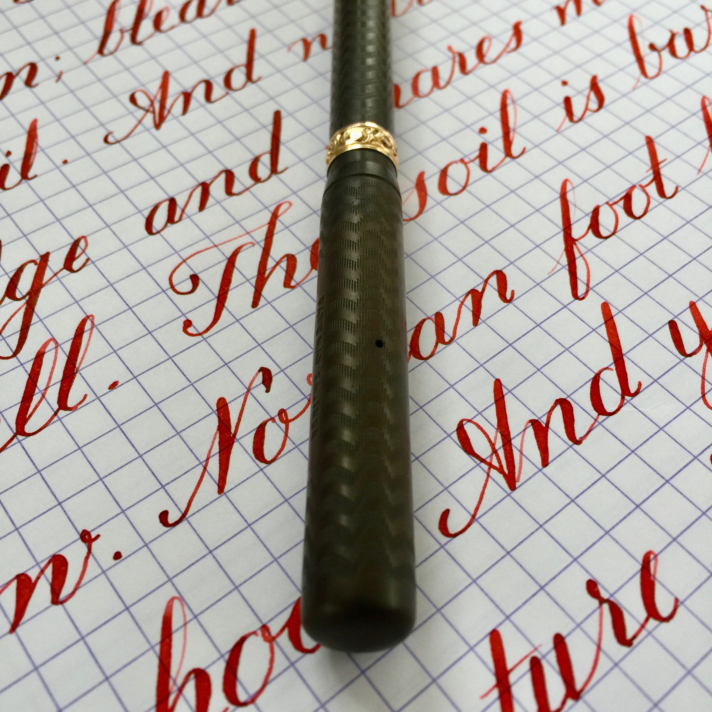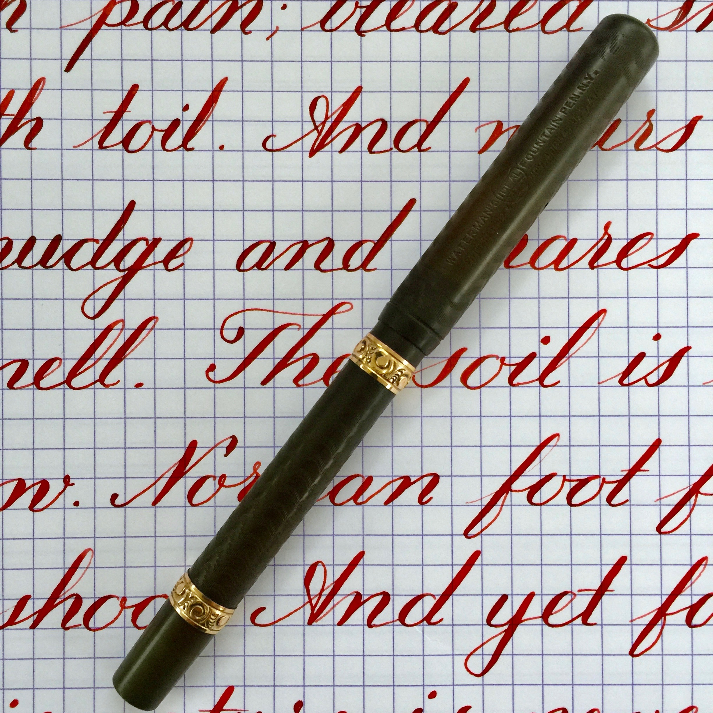 This is a nice Waterman 12 in BCHR. It’s an early 12. The imprints are on the cap (generally they are on the barrel) and the latest patent date is 1898 which would precede the Waterman’s later 1904 patent date. That dates this pen to sometime between 1898 and 1904. It’s in superb condition for it’s age. It has faded to a dark brownish color, but the chasing and imprints (even the “12” on the barrel end) appear about as crisp as original. This pen has seen a lot of action. The gold filled bands look to be in good condition as well. The 14kt. Waterman #2 nib is an early version which would match the dating of the pen. It’s a nice, smooth writing XF/ F (0.35mm) with medium wetness. It has some nice flex going up to 1.6mm. It has decant responsiveness. Overall, this is a very fine example a very old pen.