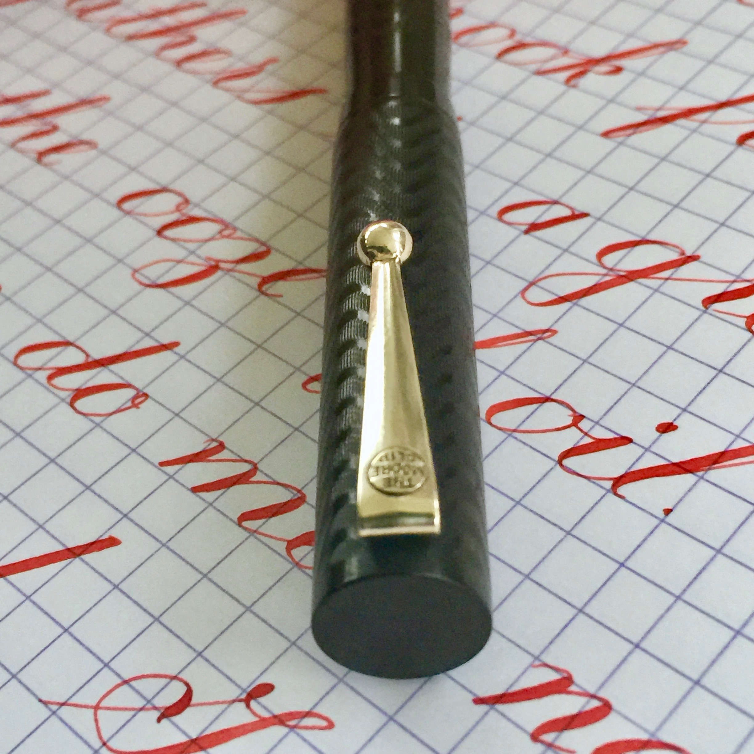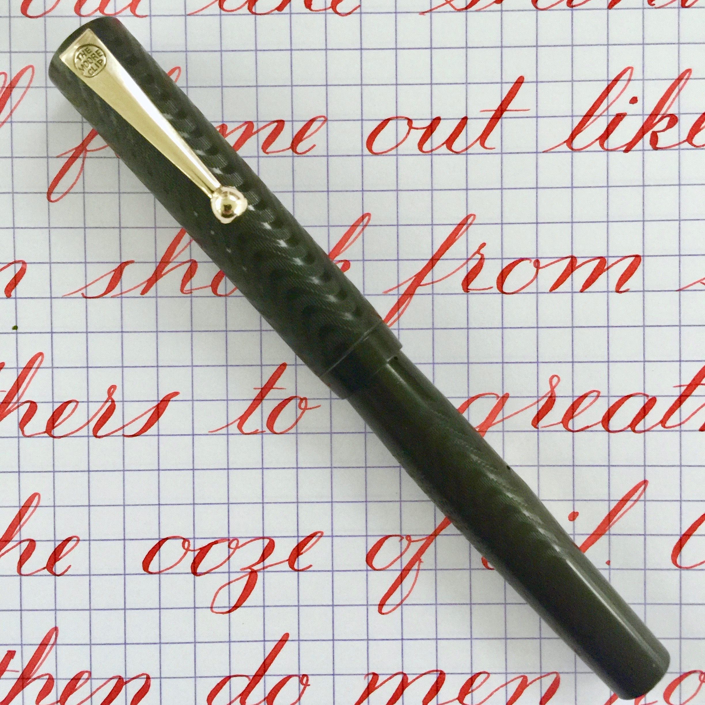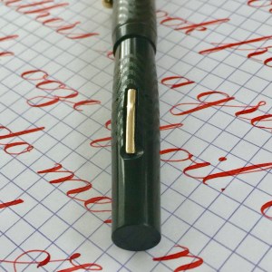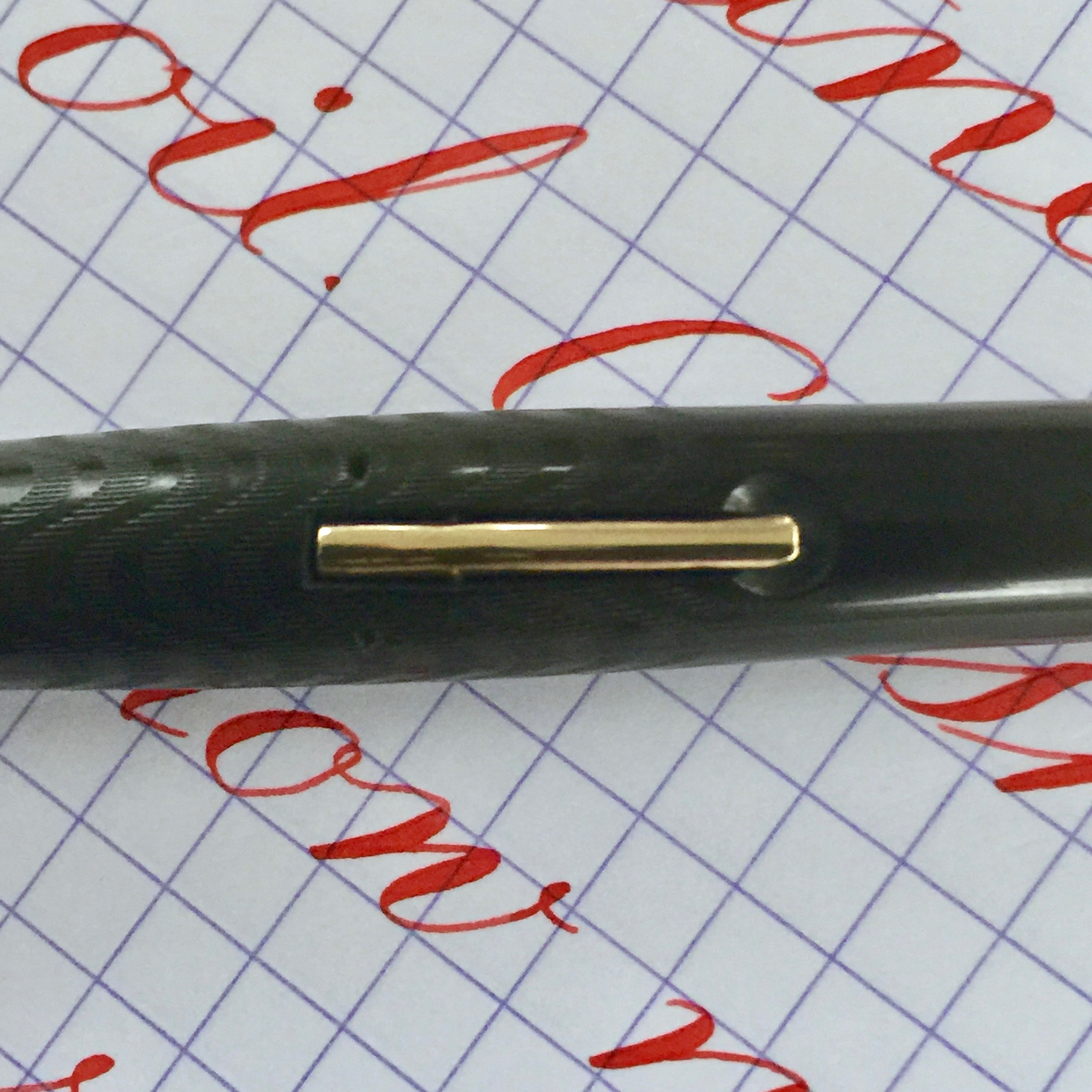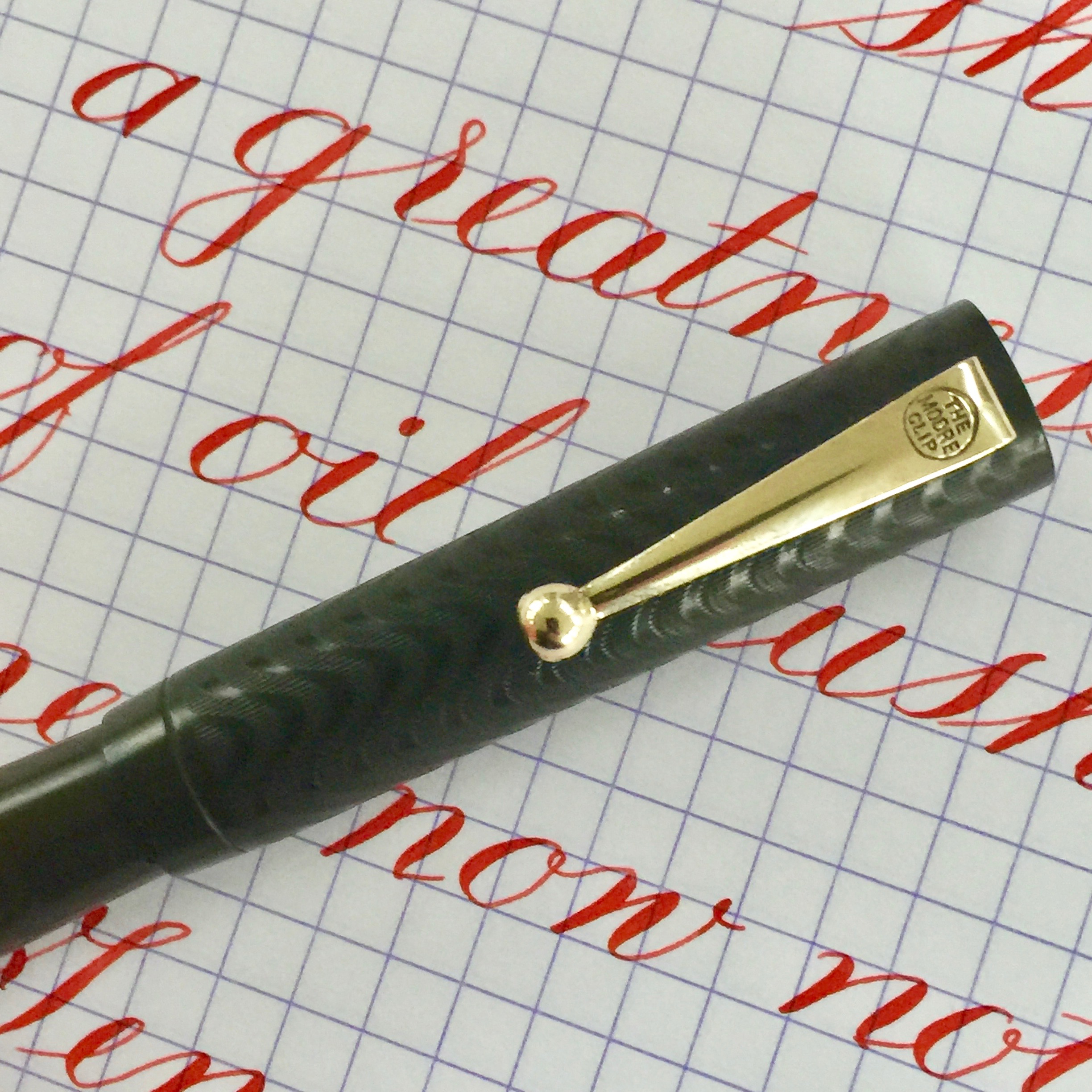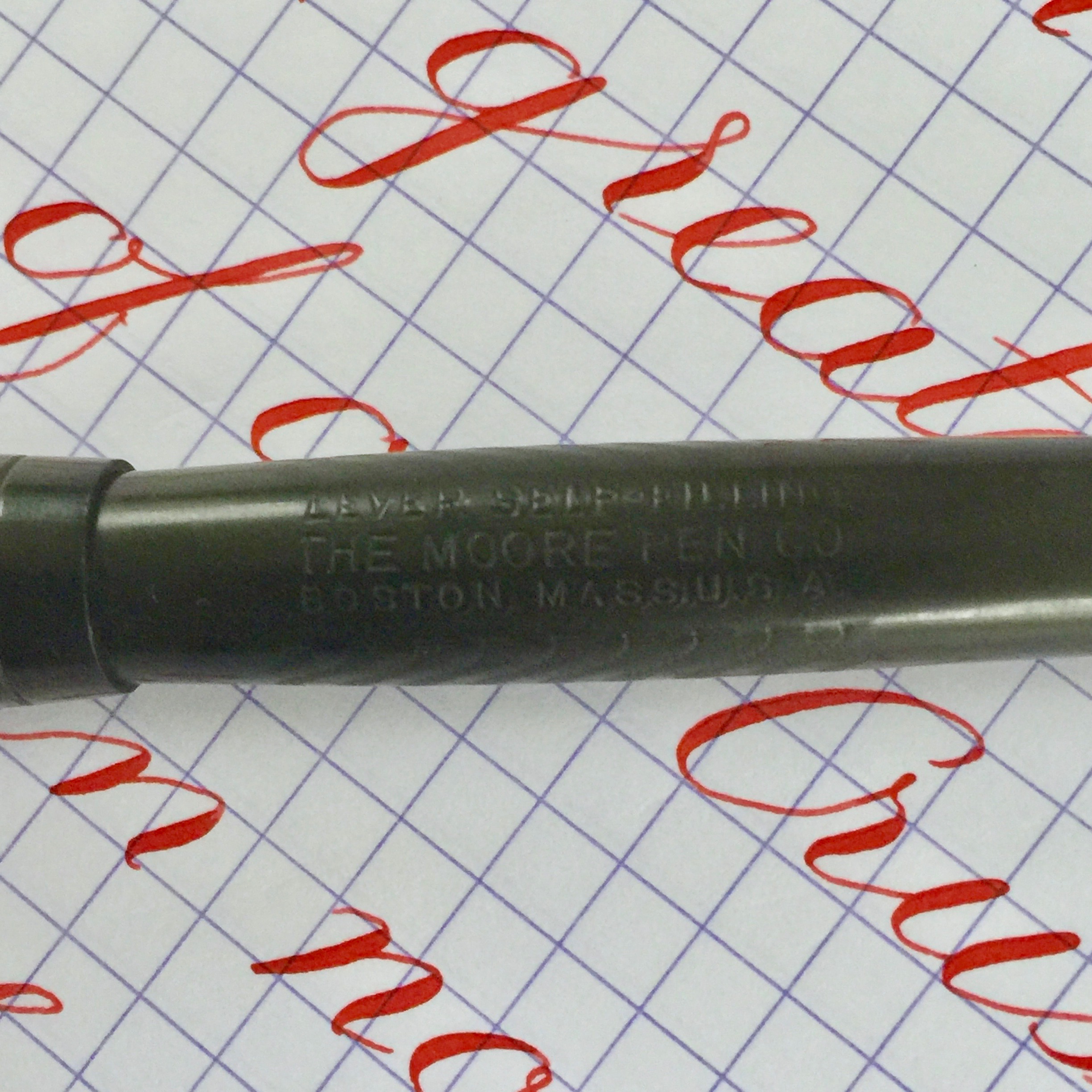 Here is a Moore L-82 ring top vest pen. This model is similar in size and style to the Waterman 52V. The BCHR on this pen has faded dark grayish brown. The chasing is worn but still visible. The imprints are also worn and only partially readable. The ring top is missing, but the gold-filled lever has no brassing. This pen, however, houses a superb flex nib. The 14kt. Moore #2 is a wet writing XF (0.3mm) that flexes with ease up to a nice BB (1.6mm) line. The feed is plenty wet as well. This nib really borders between super flex and wet noodle. What really sets it off is the superb responsiveness. This is a great nib for artists and calligraphic work such as copperplate style.