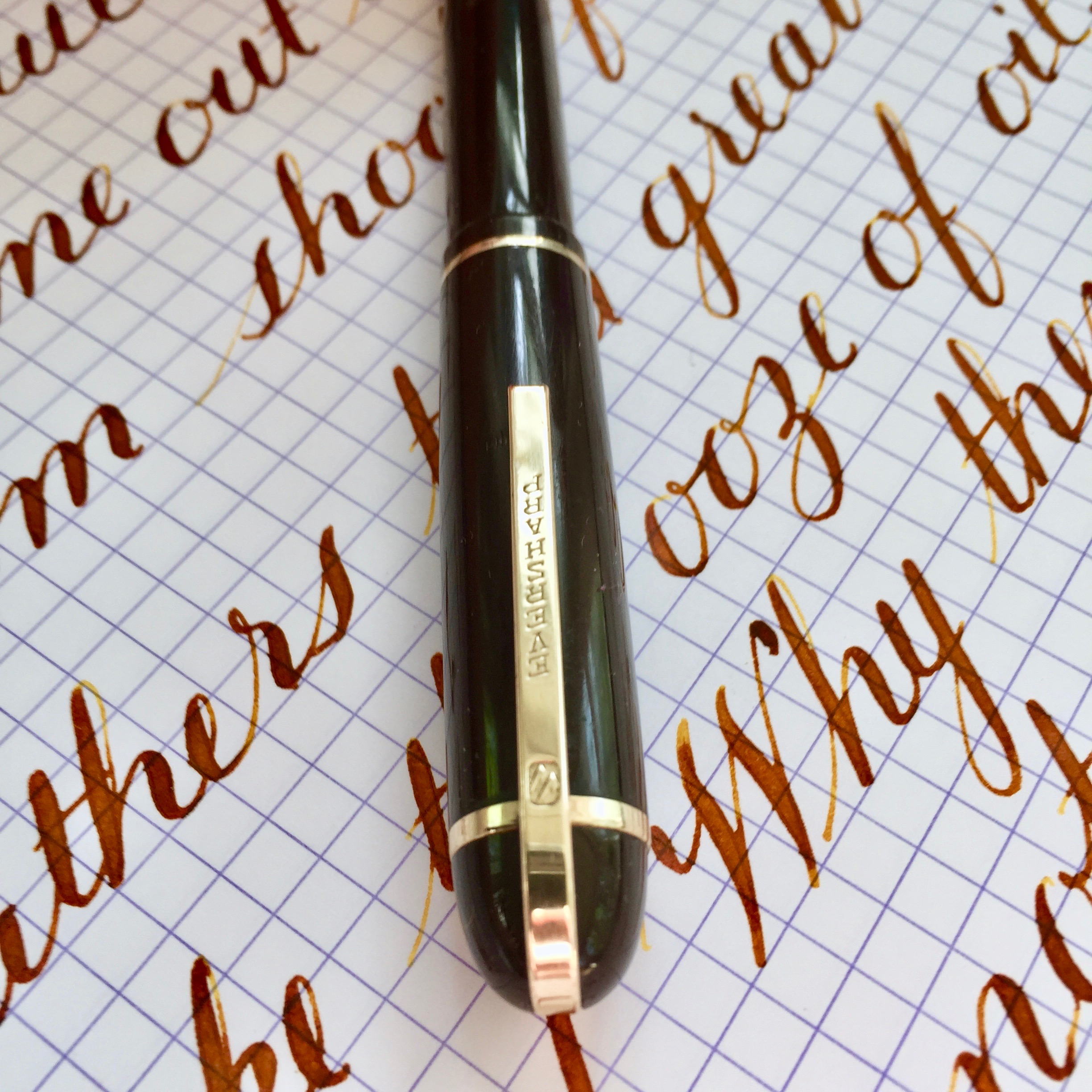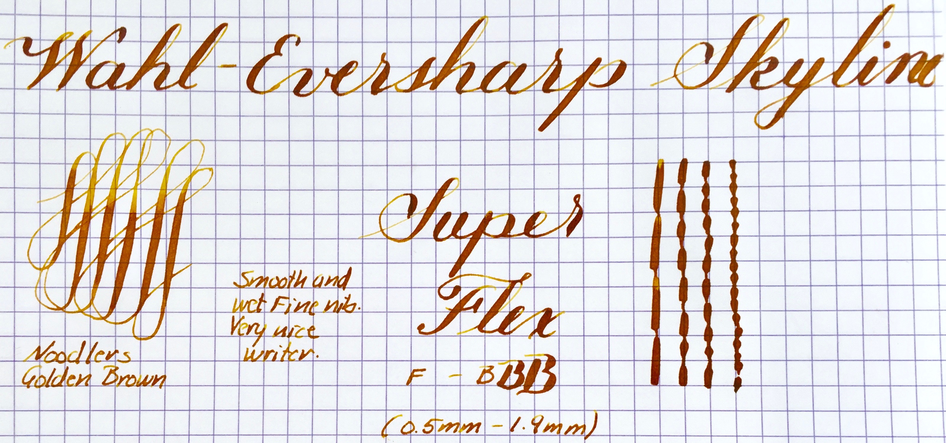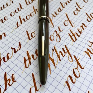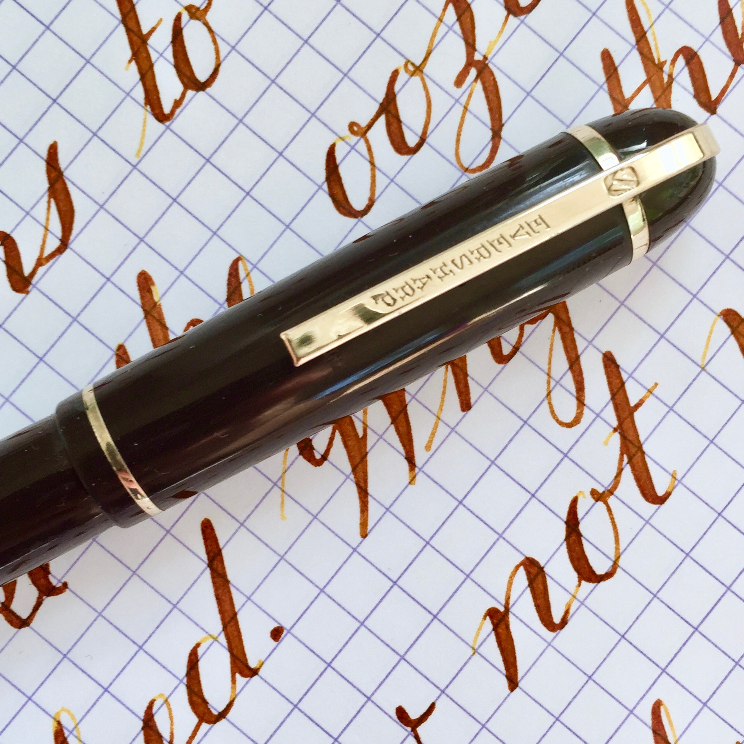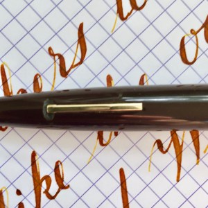 This is a standard size Skyline in brown with gold-filled trim. The body of the pen is in nice condition. There is some very light scratching throughout, but most of it disappeared when I buffed and polished the pen. There are a two or three scratches near the cap that are still minor but wouldn’t buff out. The trim looks very good. There is just a hint of plate loss on the sides of the middle of the lever from where the cap rubs when posted. The 14kt Eversharp nib is a wet writing F (0.45mm). I’d call it a true Fine, and it is a smooth and a very lovely writer. The nib also has some nice flex going up to a large 1.9mm (BBB). The flow is very wet and has no problems keeping up. It has average responsiveness. It’s a nice all around Skyline that won’t disappoint.