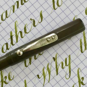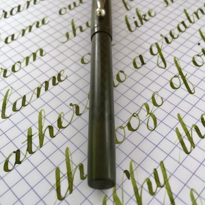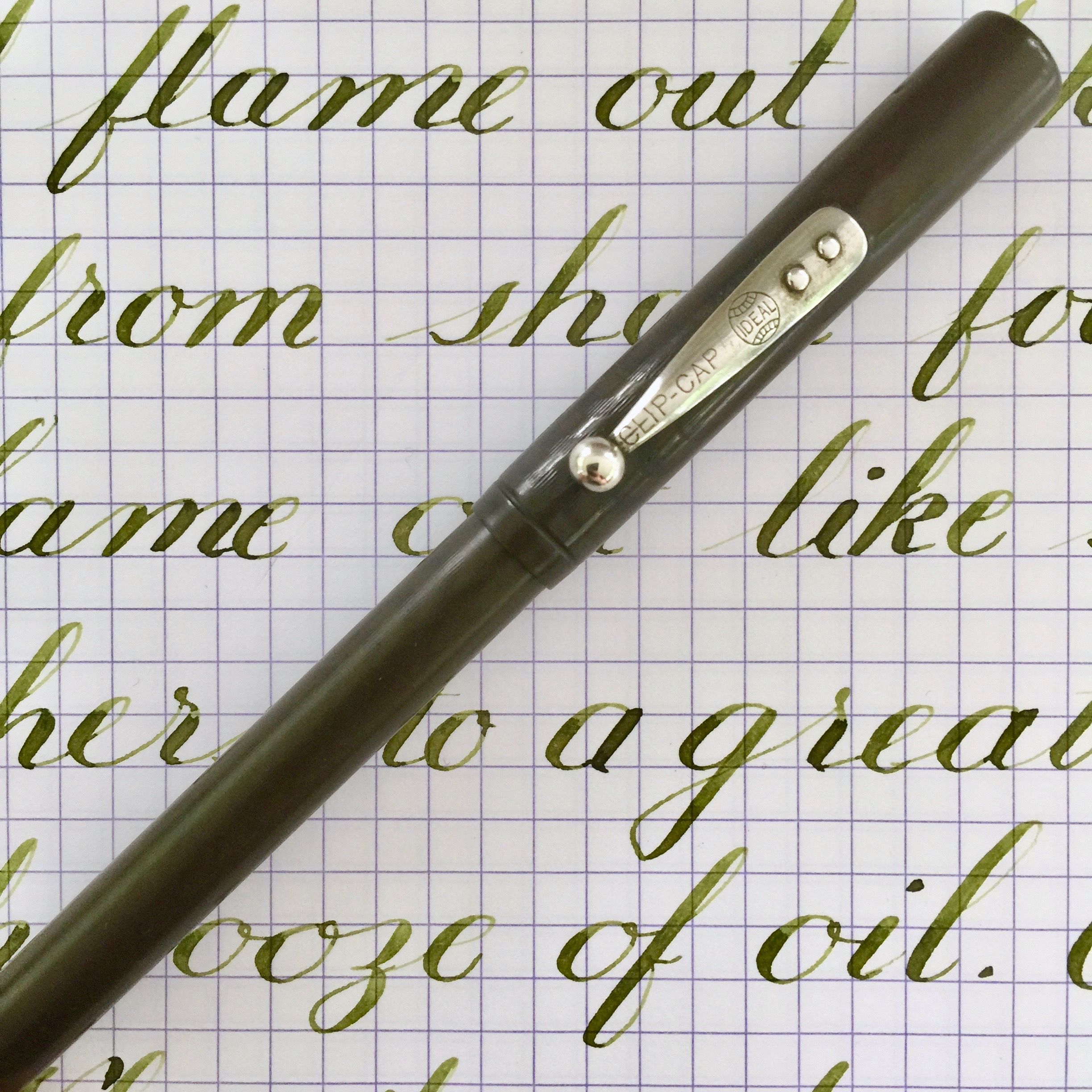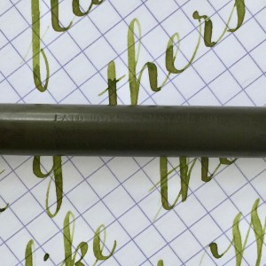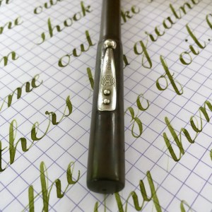 This is a Waterman 14 eyedropper in BCHR. The hard rubber has faded to a dark brown. The chasing has also worn. It is visible but has lost most of its texture. The imprints are also worn, but it is most readable. You do have to look close to read them, though. The “14” on the back is nice and crisp. The nickel clip is in good shape. There is a little bit of wear but no brassing. The 14kt. Waterman #4 is a superb nib. It is a slightly oblique F (0.5mm) that is a bit stubbish. It writes a bit on the wet side, but it’s not a gusher. It’s also a little stubbish. The flex on the pen is beautiful. It has a great range going up to 1.8mm (BBB). It also has some excellent responsiveness, and that combined with the oblique, stubbish nib allows for some for crisp flex writing. Overall, an excellent Waterman 14 with fantastic writing abilities.