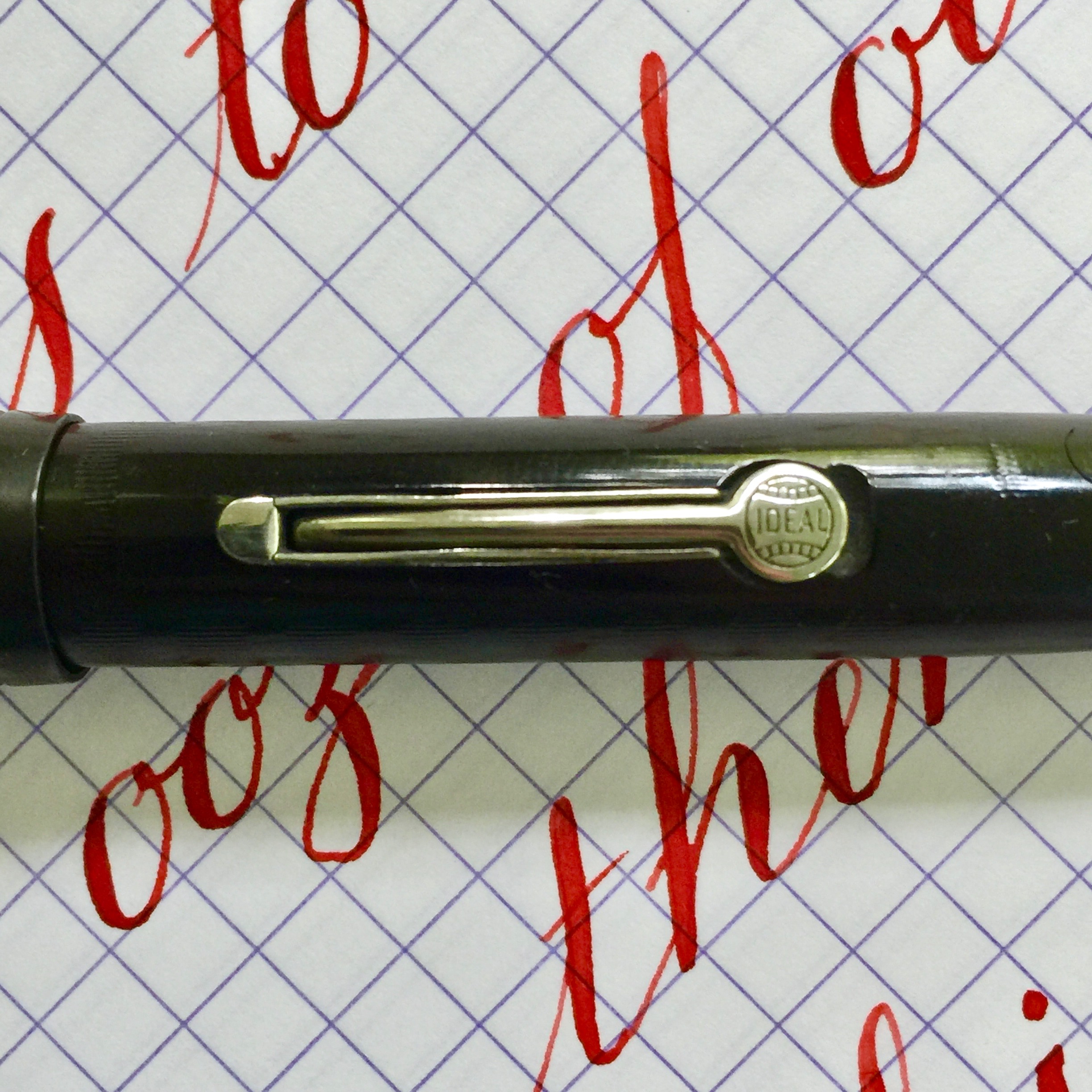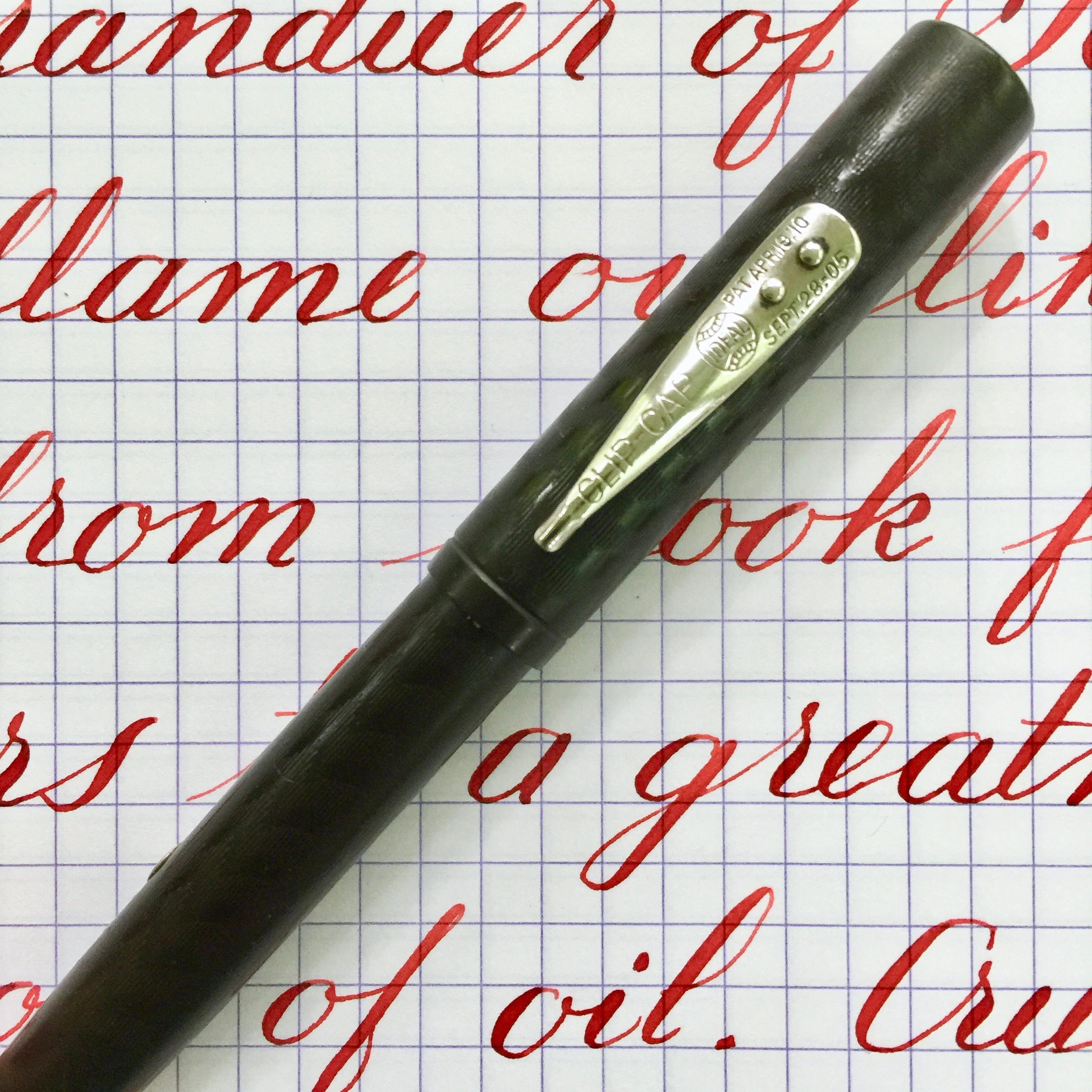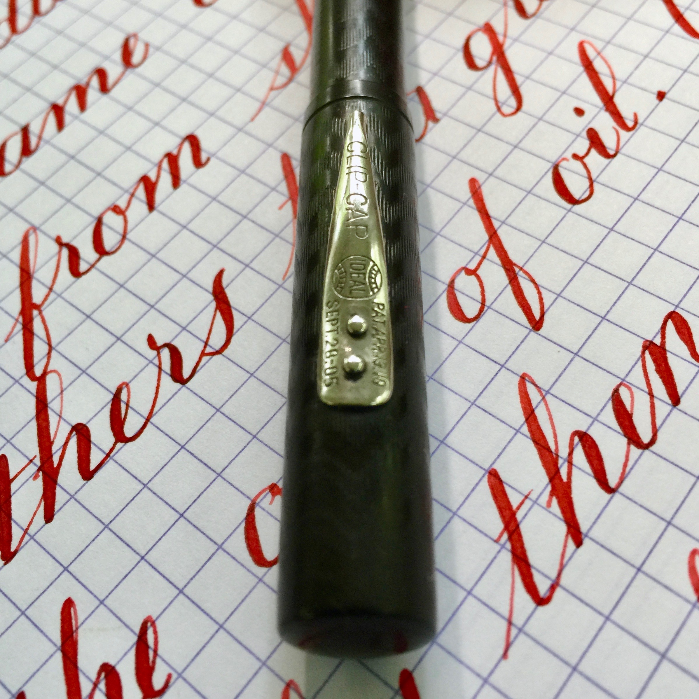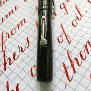 This is a Waterman 52V in BCHR in nice condition. The black hard rubber has faded a little to a very dark brown. It sill looks black in some light. The chasing is still visible and has some texture to it. The imprints on the side are worn, but they are mostly readable. The “52V” on the end of the barrel is good and crisp. The nickel filled trim looks great with very little signs of wear to them. The clip, however, is missing the ball. You probably wouldn’t know that unless you knew it was supposed to be there as it still works great as a clip and looks normal as well. The 14kt. Waterman #2 is a F with medium flow and just a hint of feedback. It’s definitely not scratchy but it’s not slippery either. The nib has some nice flex as well. It was a hard nib to grade. Ease of flex is in the super flex range but it doesn’t have a huge range of flex. But it does have some very nice responsiveness as well. I’d say this is right on the border between “good” and “super” on my scale. It’s a great Waterman in nice condition.