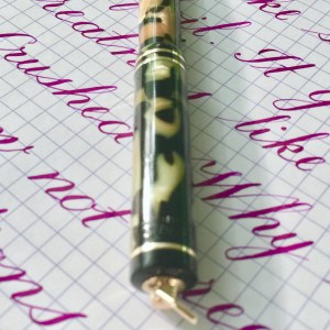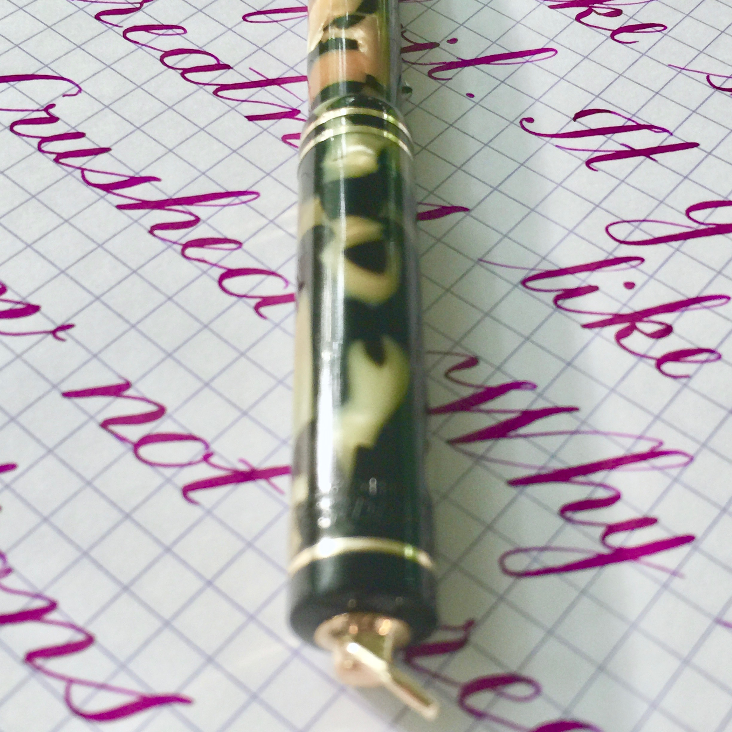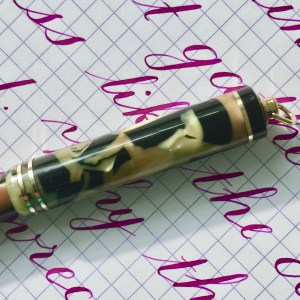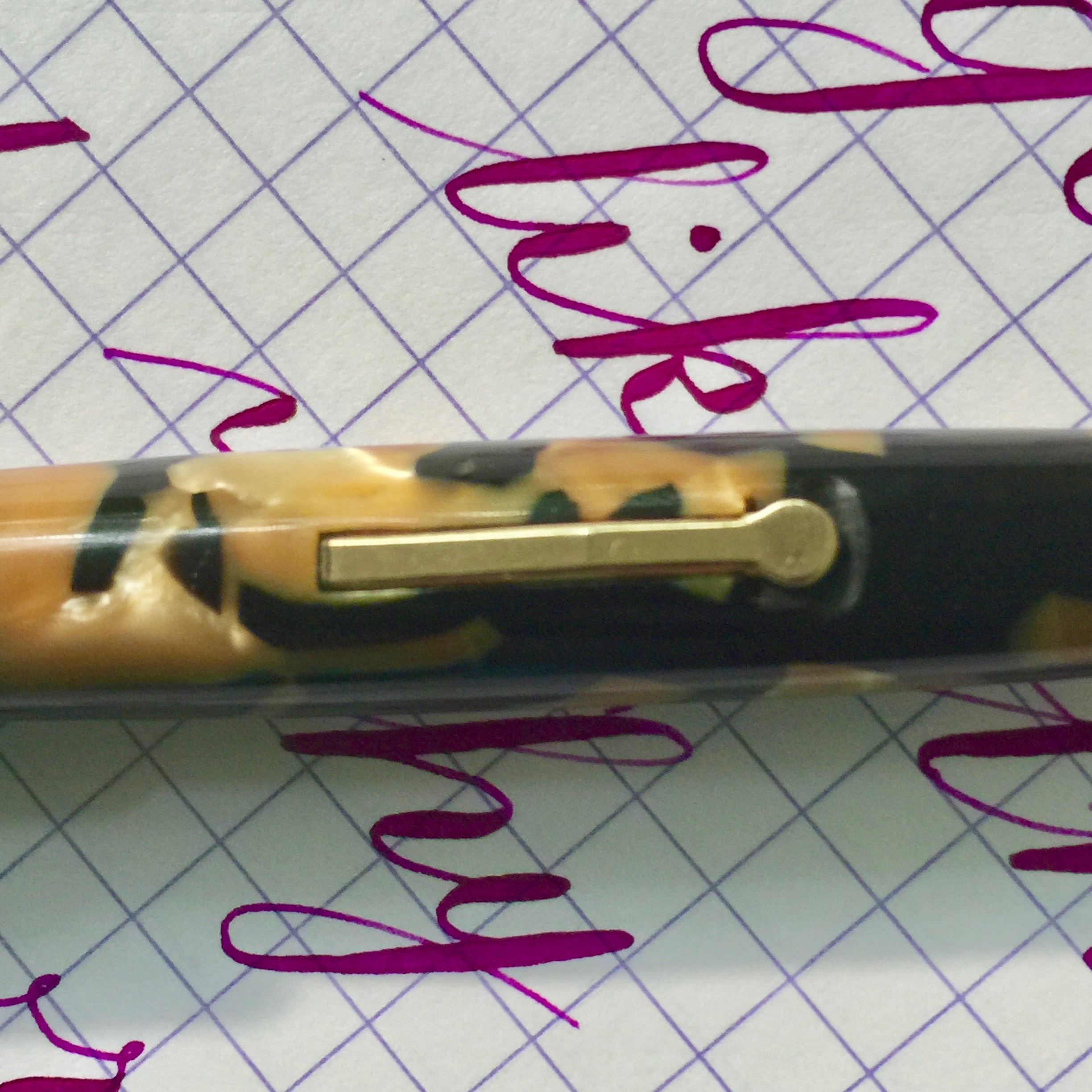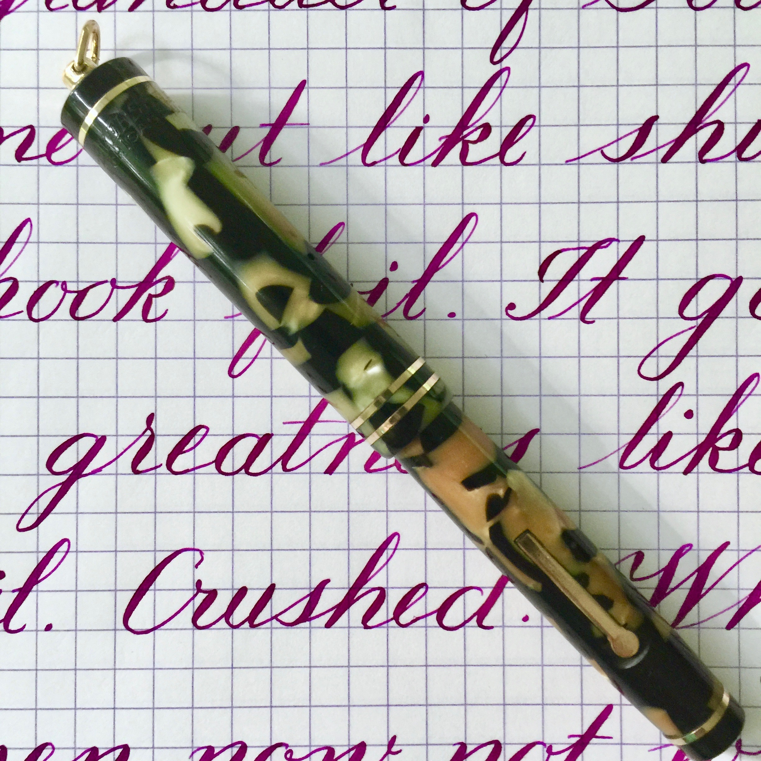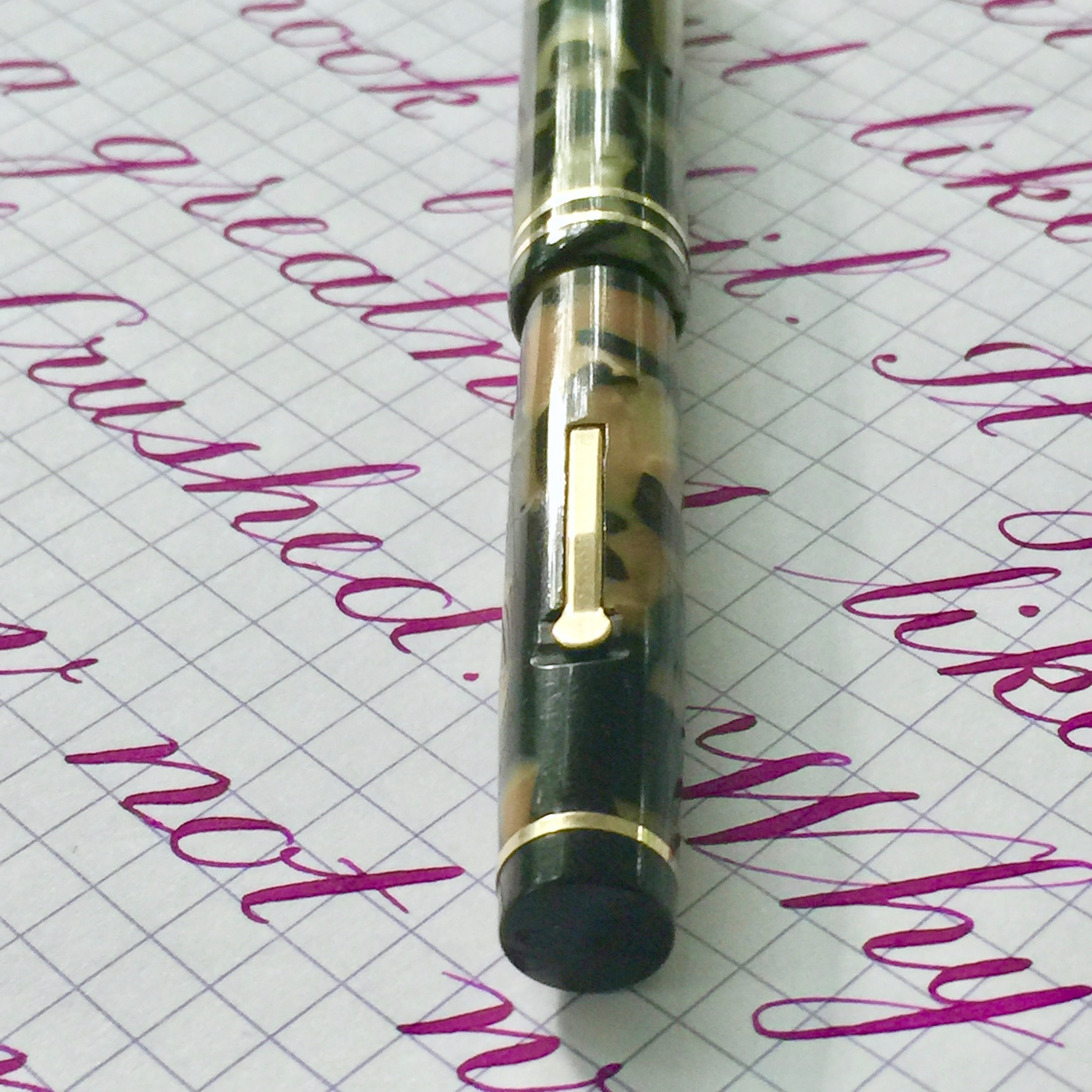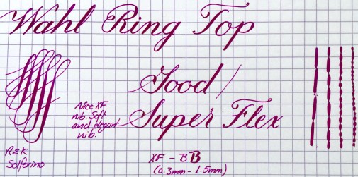 Here is a Wahl ring top in beautiful celluloid pattern. There is some color change, particularly on the body, where the original greenish pearl pattern has browned. The gold filled trim is in beautiful condition with no brassing, and even every little scratching or indications of it’s age. The imprint still looks good as new. The 14kt. Wahl #2 is a beauty. It’s a wonderful writing XF that is smooth, soft and elegant. It also has some very nice flex. I have graded it “Good/ Super” only because the ease of flex is a bit stiffer than what I’d like for a “Super Flex”. However, the responsiveness and ink flow still make this a very nice flex nib capable of some very nice work. And the range (0.3mm to 1.5mm) is good enough especially considering it’s responsiveness. This is still a beautiful pen with a lot of years left in it.
