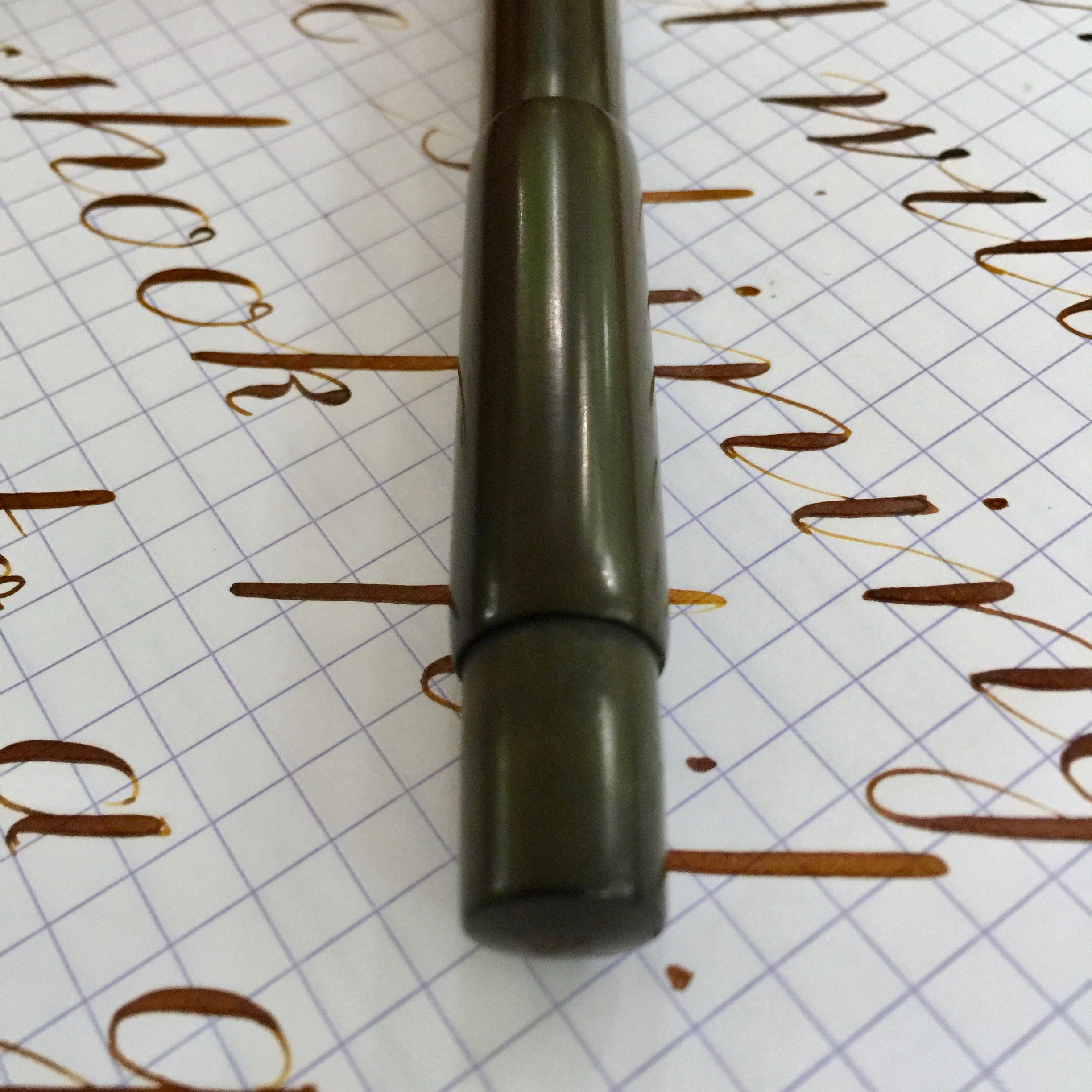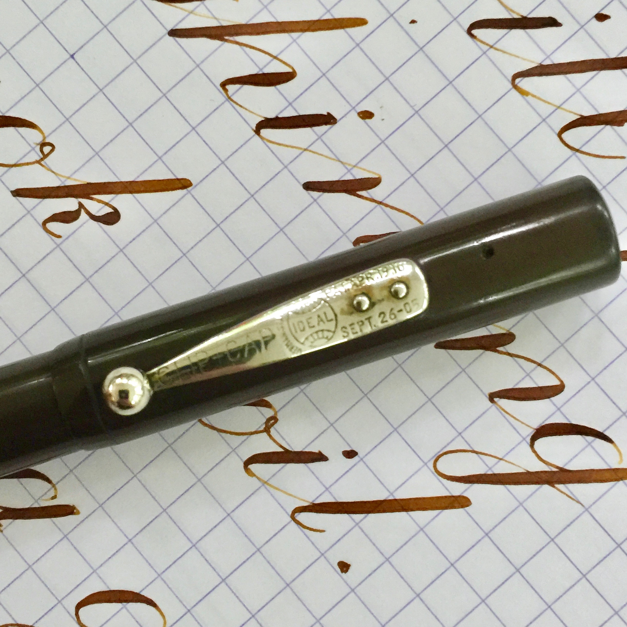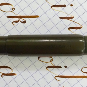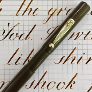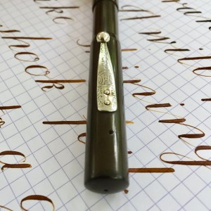 Here is a rare Waterman 14 S.F. (Sleeve Filler) in black hard rubber (smooth with no original chasing). For this model you slide up the sleeve on the barrel to expose of pressure bar that you depress with your thumb to fill the sac with ink. The pen’s hard rubber has faded to a dark brown, and the imprints are worn but readable with some texture remaining to them. The nickel clip is in great condition with no signs of brassing. The internal filling bar is in good condition. It has some wear from being inside a pen for a 100 years, but I’ve cleaned it up. The lip of the cap is really the only major flaw. First, there is a chip in the lip. It isn’t a very wide chip, but it is long enough that it covers about a third of the lip edge. Also, there is a very small crack under the clip running through the lip edge (see pic). It looks to be plenty stable though. The 14kt. Waterman #4 is a lovely writing XF. It writes quite smoothly and has a good flow to it. It is wet enough to allow for some nice shading. The nib also has some nice flex going quite easily from 0.3mm to BBB (1.7mm). The XF nib also allows for some nice responsive and snappy flex action. Overall, a rare pen with some great qualities.