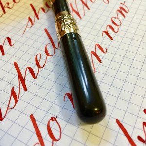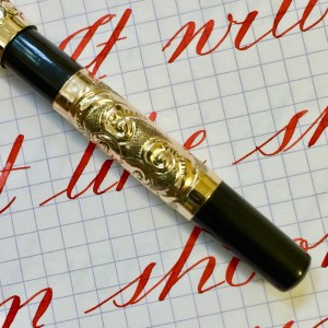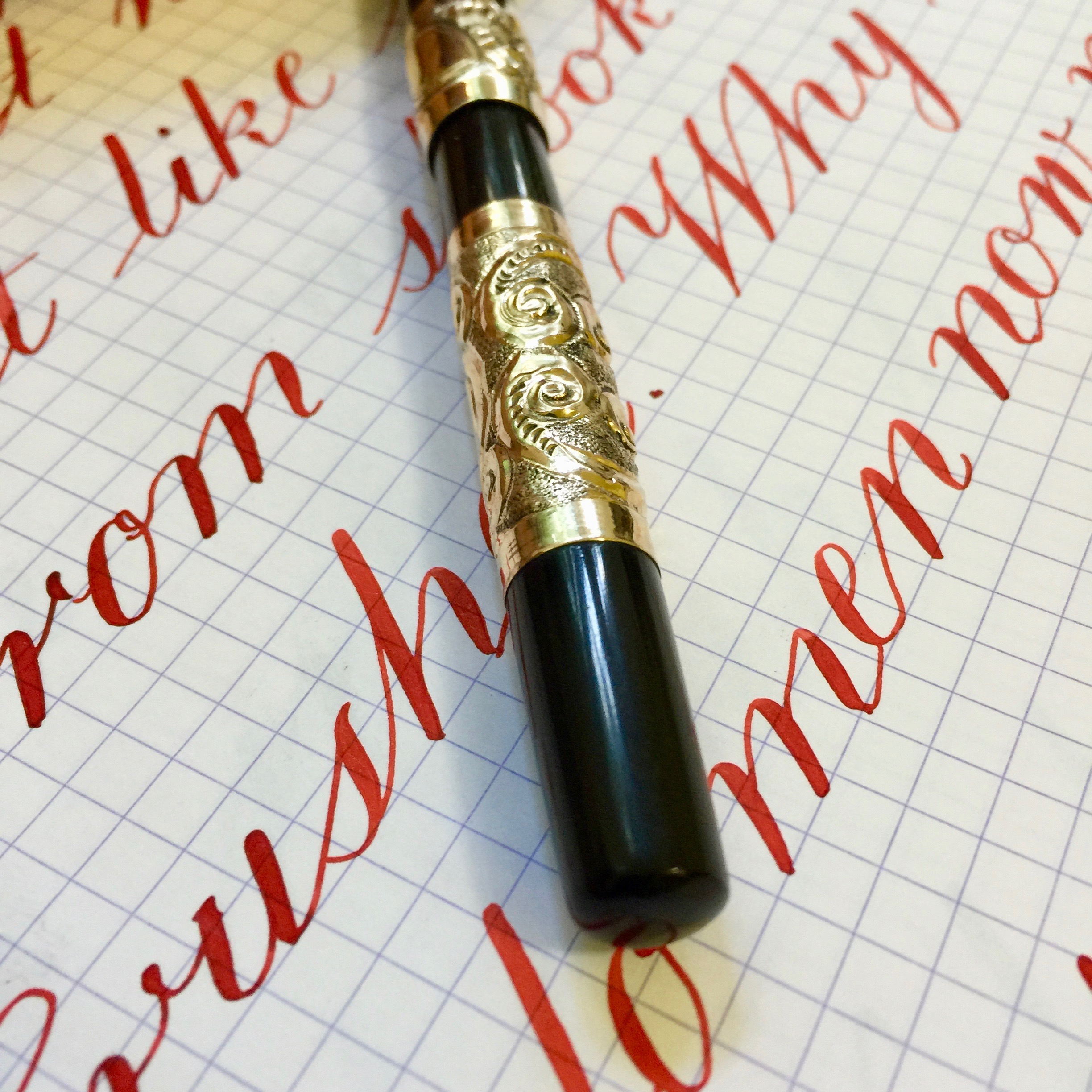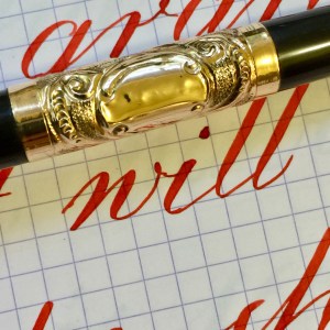 Here is a beautiful vintage, unbranded eyedropper fountain with stunning gold-filled repousse bands. Being unbranded there is no sure way to tell exactly what the date of it’s production. But these types of pens, especially in this repousse style, were made primarily in the 1880s-1910s, so it is highly likely that it comes from that span. The smooth hard rubber (no original chasing) has faded a little bit. I would say it’s grayed a bit more than it has browned. It’s still pretty much black though. The gold-filled repousse bands are in great condition with no braising. There are a few tiny dings in the blank area of the barrel meant for inscriptions (there are none on this pen). The 14kt. nib is also unbranded. It is a long-tined and elegant nib. It writes very lovely, very soft. It is a wet writing F (0.4mm) that is smooth. The flex on this nib is also very nice. I would say it’s a pretty solid “super flex.” It’s ranges from 0.4mm (F) to a large 1.8mm (BBB). That’s 1.4mm of range, so pretty good. It has average responsiveness (many of these old eyedroppers do due to how wet they write). It’s a stunning vintage pen that will fit well into any vintage pen collection.