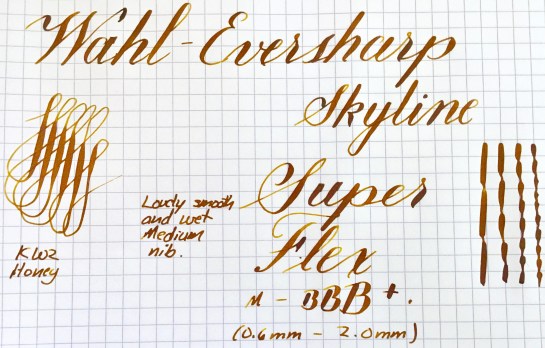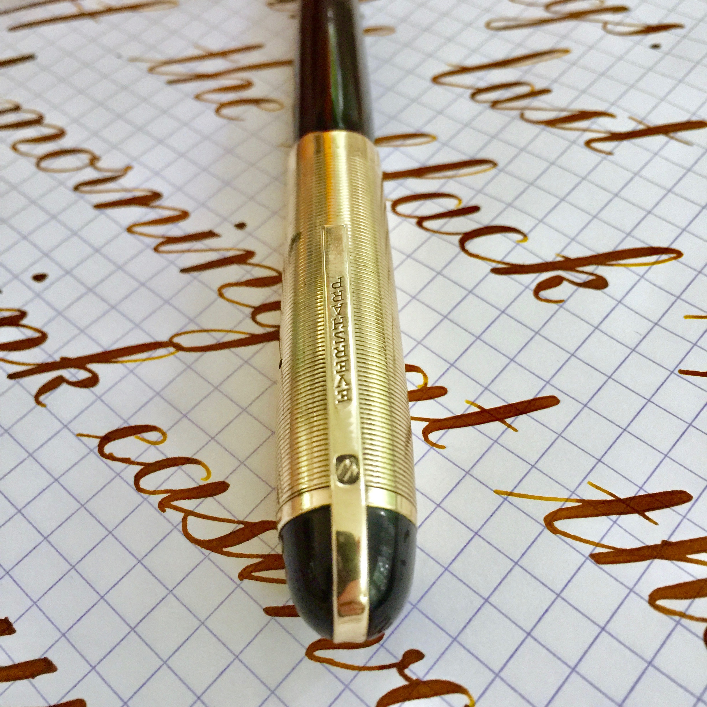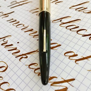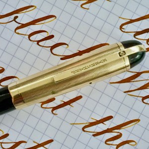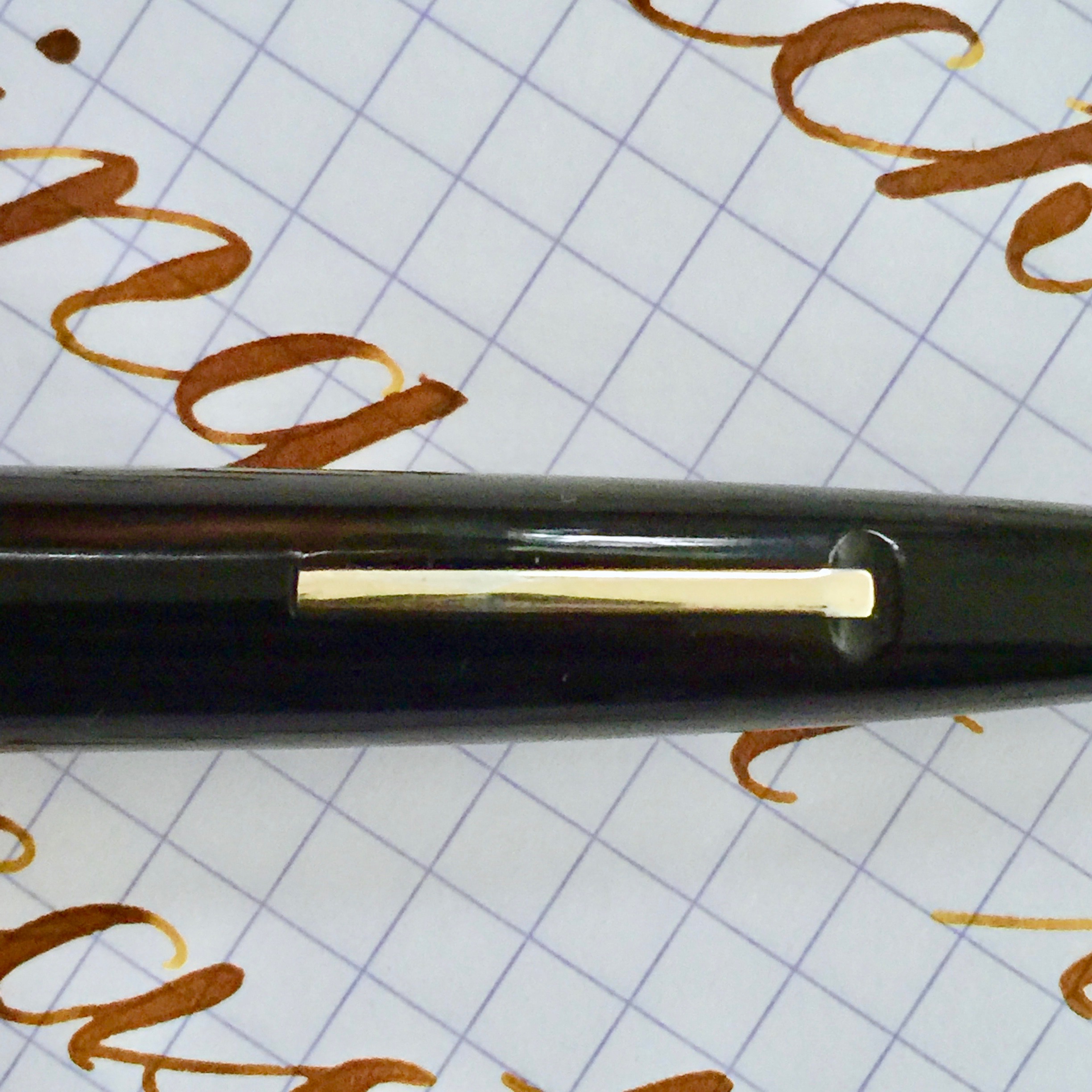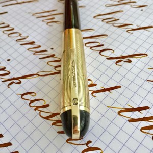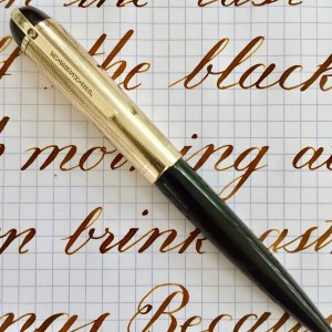 This is a beautiful standard size Skyline in black with the gold-filled cap and trim. There is some light scratching throughout the body of the pen, but most of it I have buffed and polished out. The gold-filled trim is in excellent condition. There is a bit of plate loss on the crown of the lever, but it isn’t very noticeable. The cap is in good condition as well. There is a small ding in the lip of the cap but otherwise it is pretty clean. The 14kt. Eversharp nib is a very wet writing M nib that is buttery smooth. The flex on this nib is superb. The flex comes with ease, and it is smooth and very wet. No railroading here. It’s one of the better Skyline flex nibs that I have come across recently. This is a top notch Skyline.