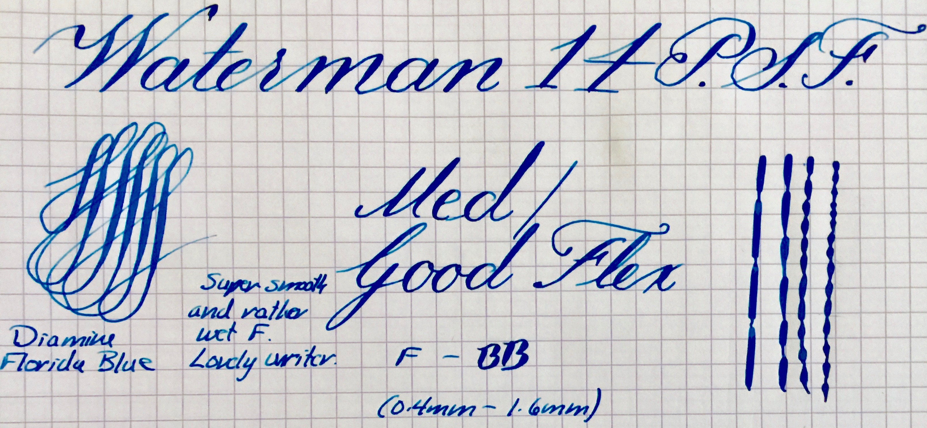NIB: 14kt. Waterman #4, F to BB (0.4mm-1.6mm), MEDIUM / GOOD FLEX (See “Grading Flex Nibs” for How I Grade)