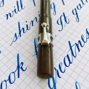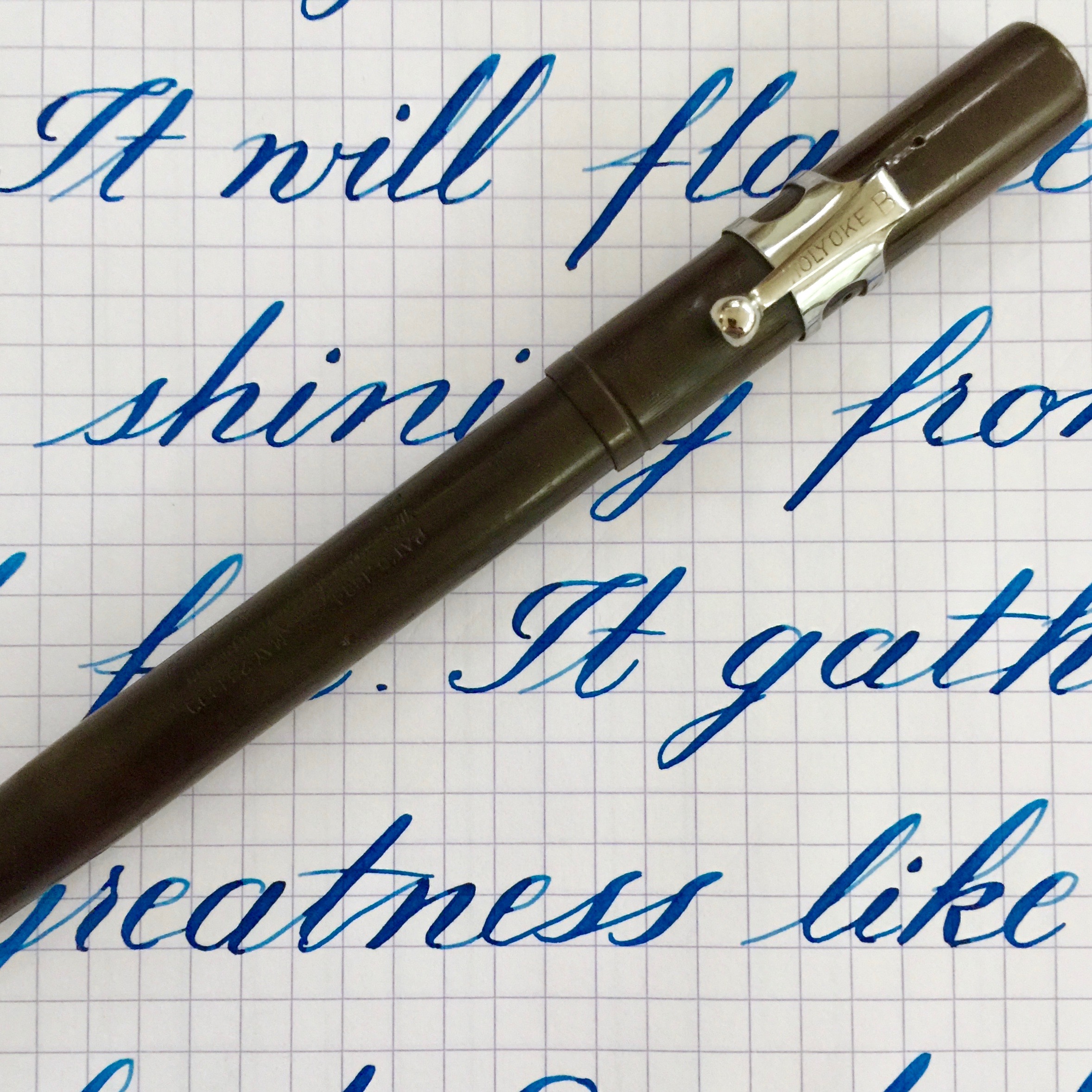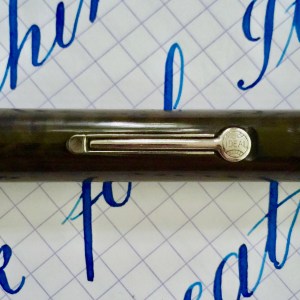 The Waterman 14 P.S.F. (Pocket Self Filler) is the early version of a “54.” This is made of BCHR. The color has faded some to a dark brown. The chasing is worn but still visible. Imprints are a bit worn also, but still easily readable. The original clip is no longer present, but it does have a nice, clean accommodation clip. The nickel lever is in good shape with no brassing. The biggest flaw in the pen is that the 14kt. Waterman #4 has a crack at the base. It runs from the back of the nib up to the “IDEAL” imprint. The crack is not nearly as problematic as it would be if it were on the tines. The section holds the nib (and crack) tight and stable. The nib is a gorgeous writer. It is a soft and ultra smooth F (0.4mm). It also has some flex. This feed isn’t going to ever railroad and that also makes the range of flex higher going up to BB+ (1.6mm). Ease of flex is a bit on the stiff side, and so the “Medium/ Good Flex” grade.