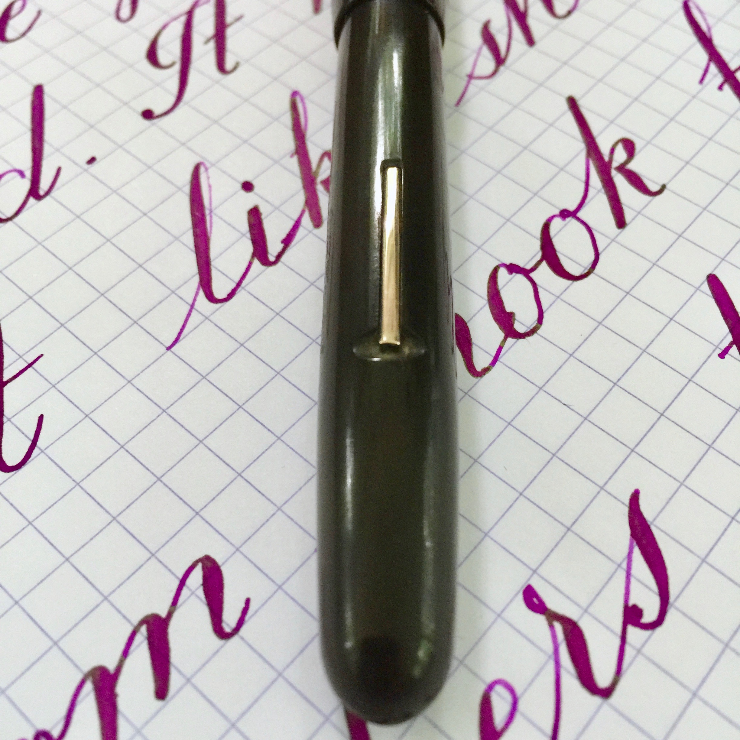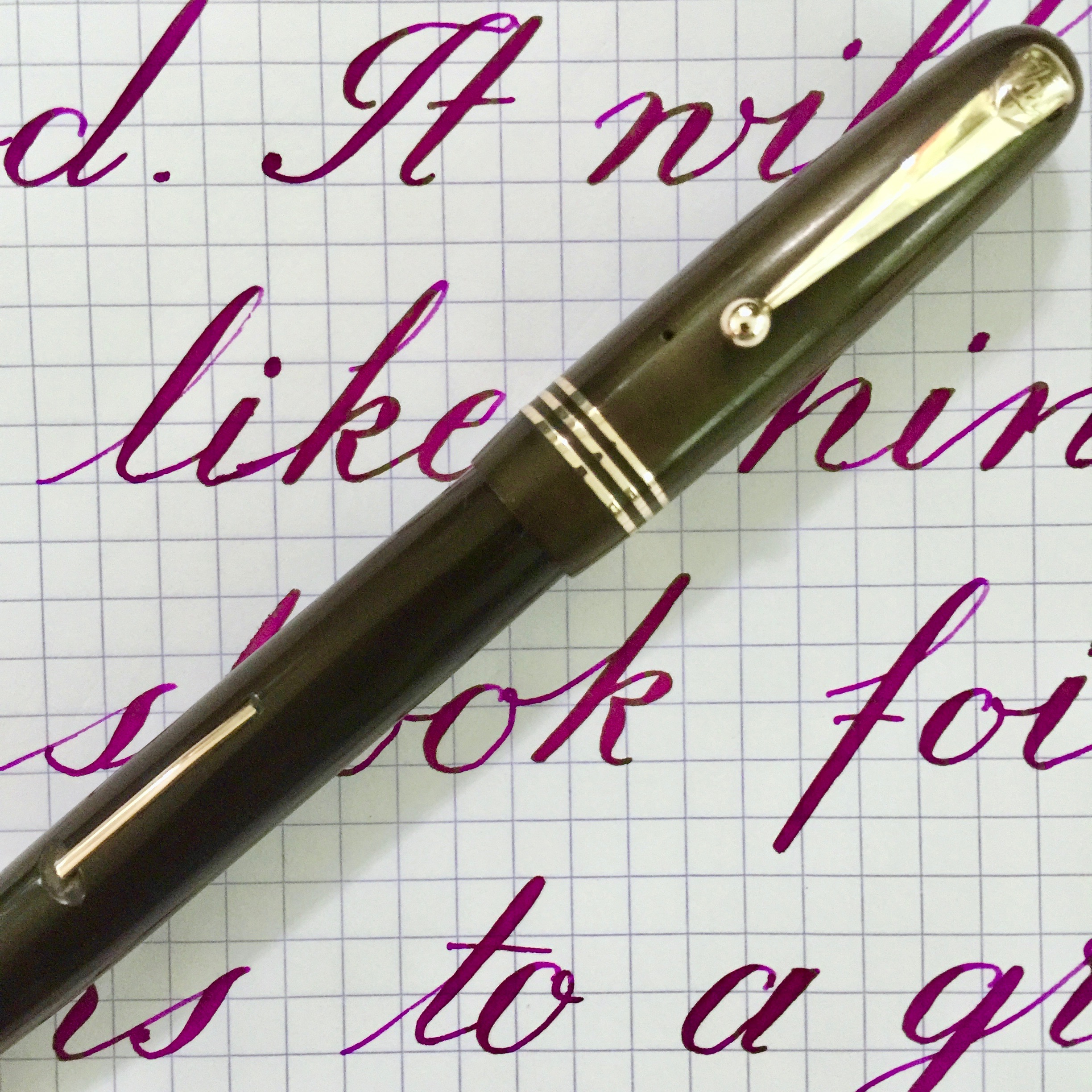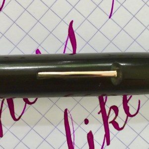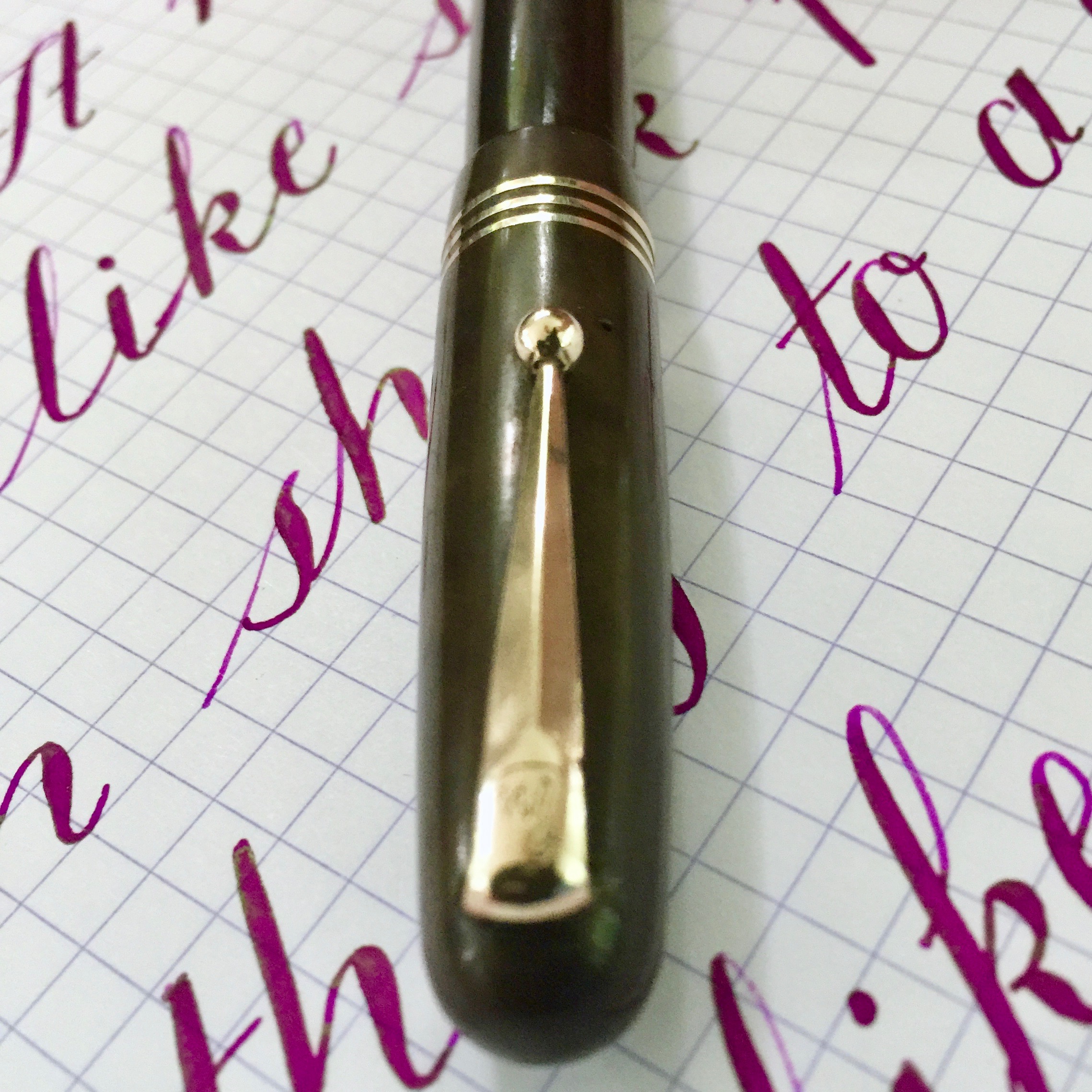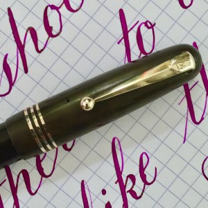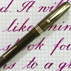 Here is a nice made in England Mabie Todd Swan #3360. The pen is made of smooth black hard rubber, which has faded to a dark brown. Some of the perks of this particular model is that the threads are actually metal, and the section screws out. This gold filled trim is in great condition with no brassing or much in the way of blemishes. The imprints are all nice and crisp. The only fault perhaps is that the lever is a bit stiff. The 14kt. “Swan” #3 nib is a beautiful writing F/M (0.5mm). It is wet and beautifully smooth. If you are looking for a nice writing vintage pen, it would be hard to do better. It does have some flex with some great rang producing swells all the way up to 1.8mm. The nib, however, is a bit on the stiff side, which is why I graded it as a “medium flex”.