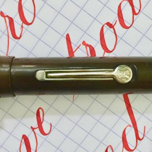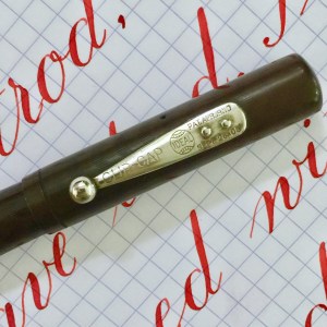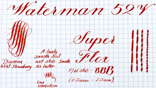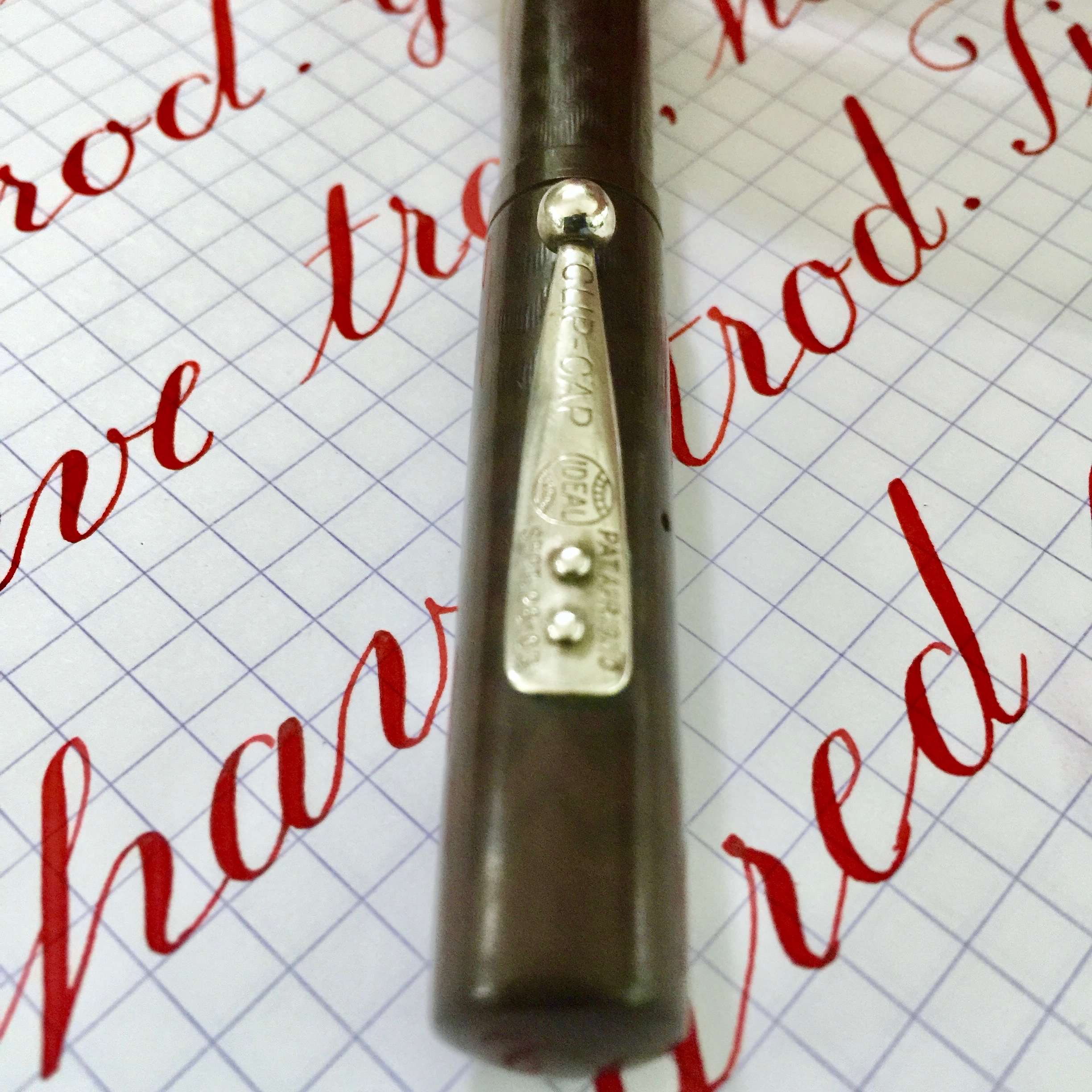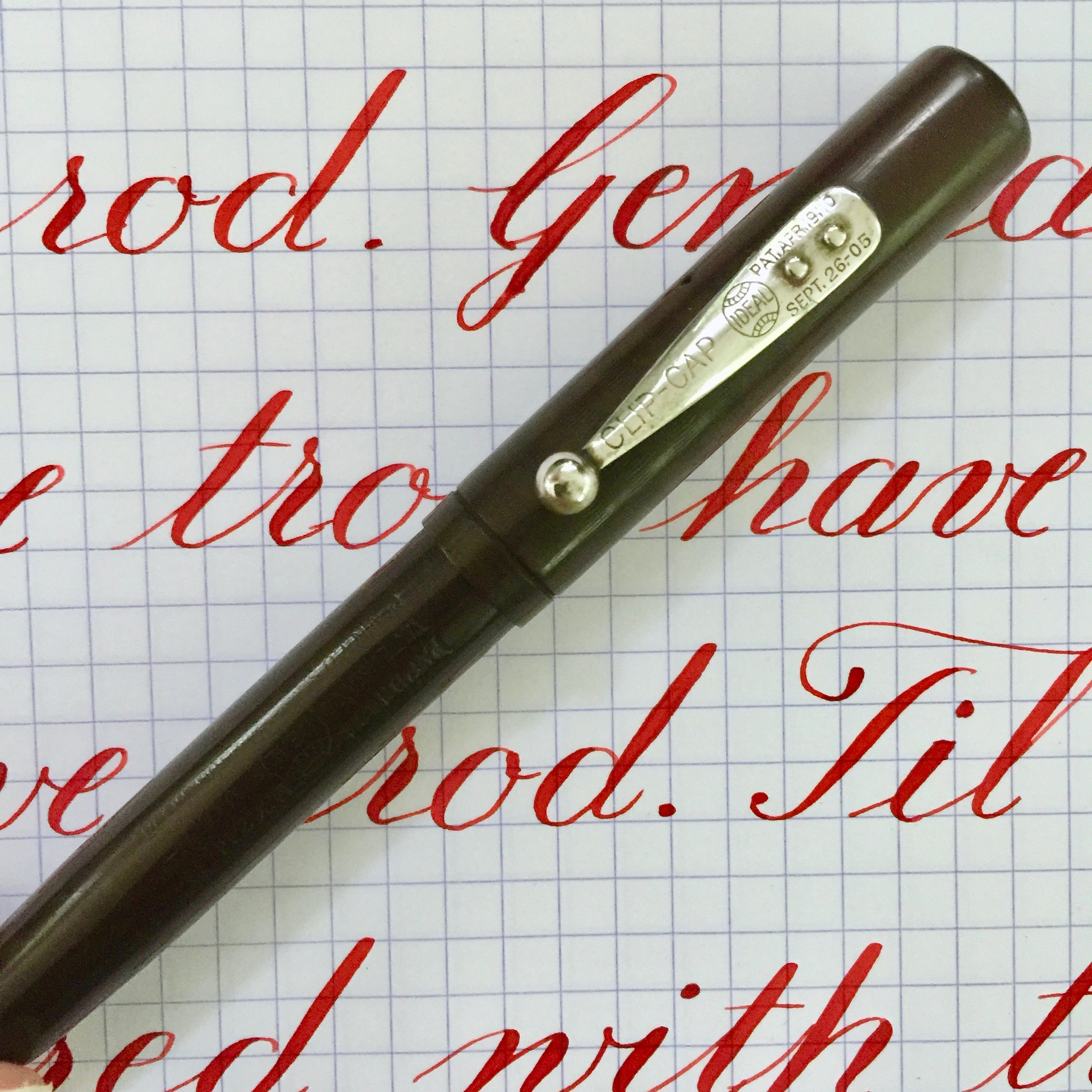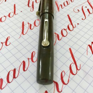 This is a Waterman 52 in vest pen size (“V”) and made from black chased hard rubber. The BCHR body has browned some to a dark, grayish brown. The chasing has also worn smooth in some places (like on the cap), though it is still visible throughout the pen. Imprints are also worn a bit, though mostly readable. The nickel filled trim is in overall good condition. No pitting or plate loss. Some light and very small scuffs are present in a few places. The Waterman #2 14kt. nib on this pen is a beauty. It is a F (0.5mm) stub nib that writes soft and glassy smooth. The nib is wet, though not gushing. And it has some superb flex action ranging from F to BBB+ (2.0mm). The flex comes quite easily and has some excellent responsiveness. The stub quality of the nib works beautifully with the flex, and is a real and unique pleasure to use. These flex stubs are not that easy to find.