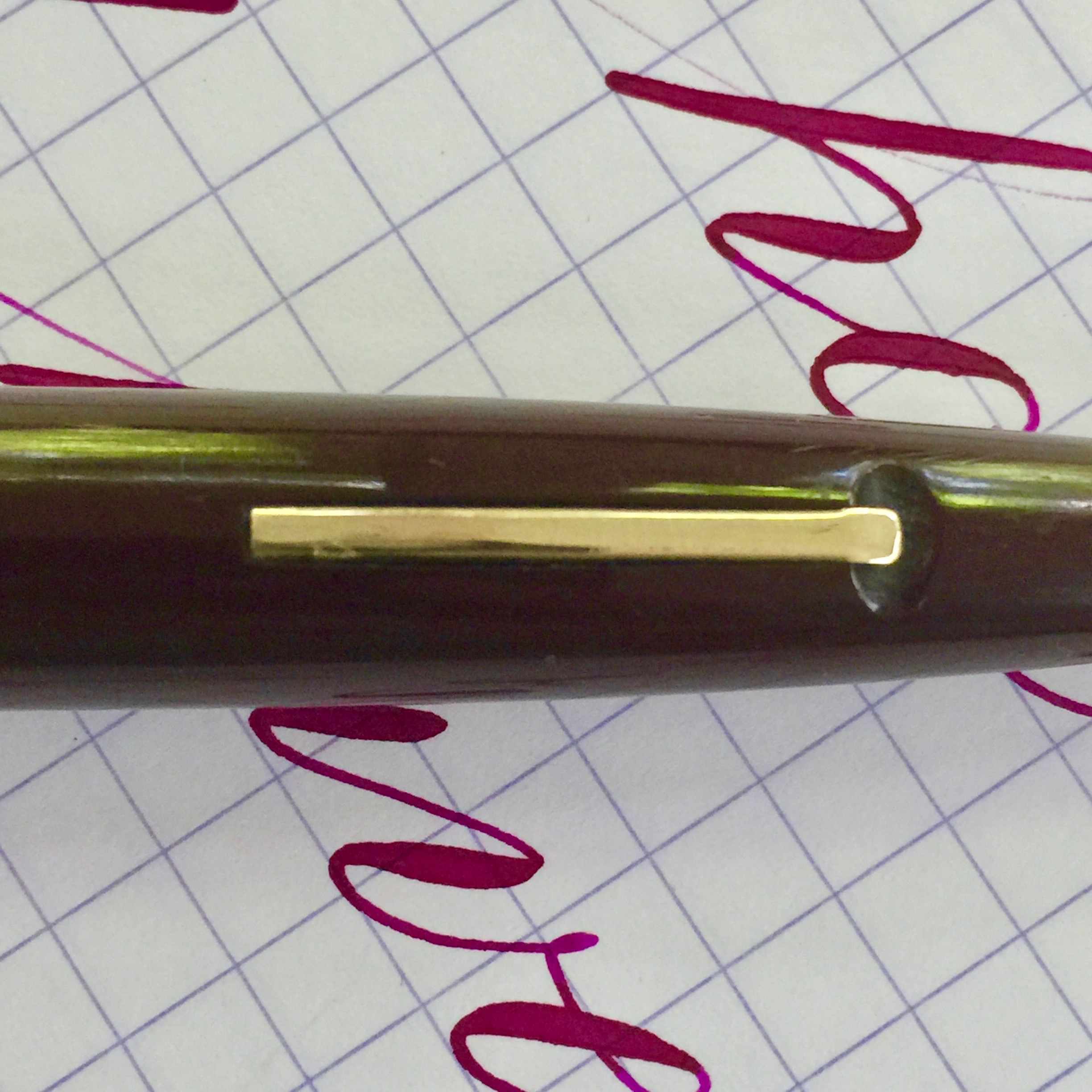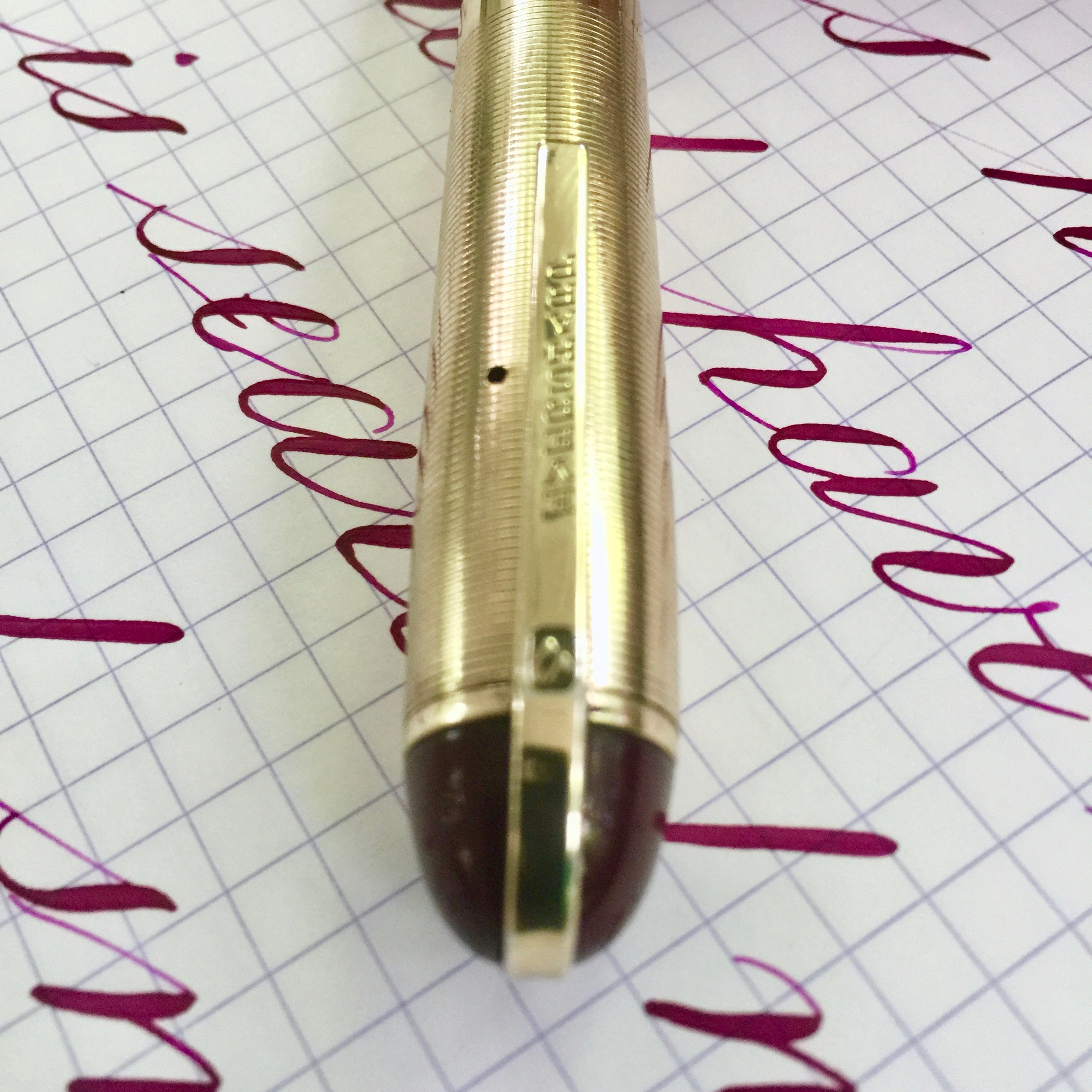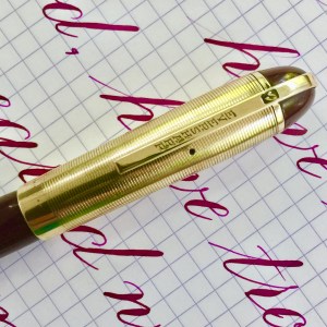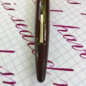 Here is a standard size Skyline in burgundy with gold filled trimming. The body of this pen is in good condition with just some very light scuffing from normal use. There is a bit more scuffing on the section, and it looks a bit duller than the body as a result. There is no brassing or plate loss on any of the gold-filled trim. There are a few small dings on the cap (see pics). The 14kt. Eversharp nib is a lovely writing XF with some flex. Normal writing in this pen is superb. The nib is smooth and elegant. A great writer. It also has some decent flex going up to BB (1.6mm). It’s a bit stiff to be a graded super flex, but it does have some nice responsiveness. Skylines are known for being great writing pens, and this nib makes a great experience even better.