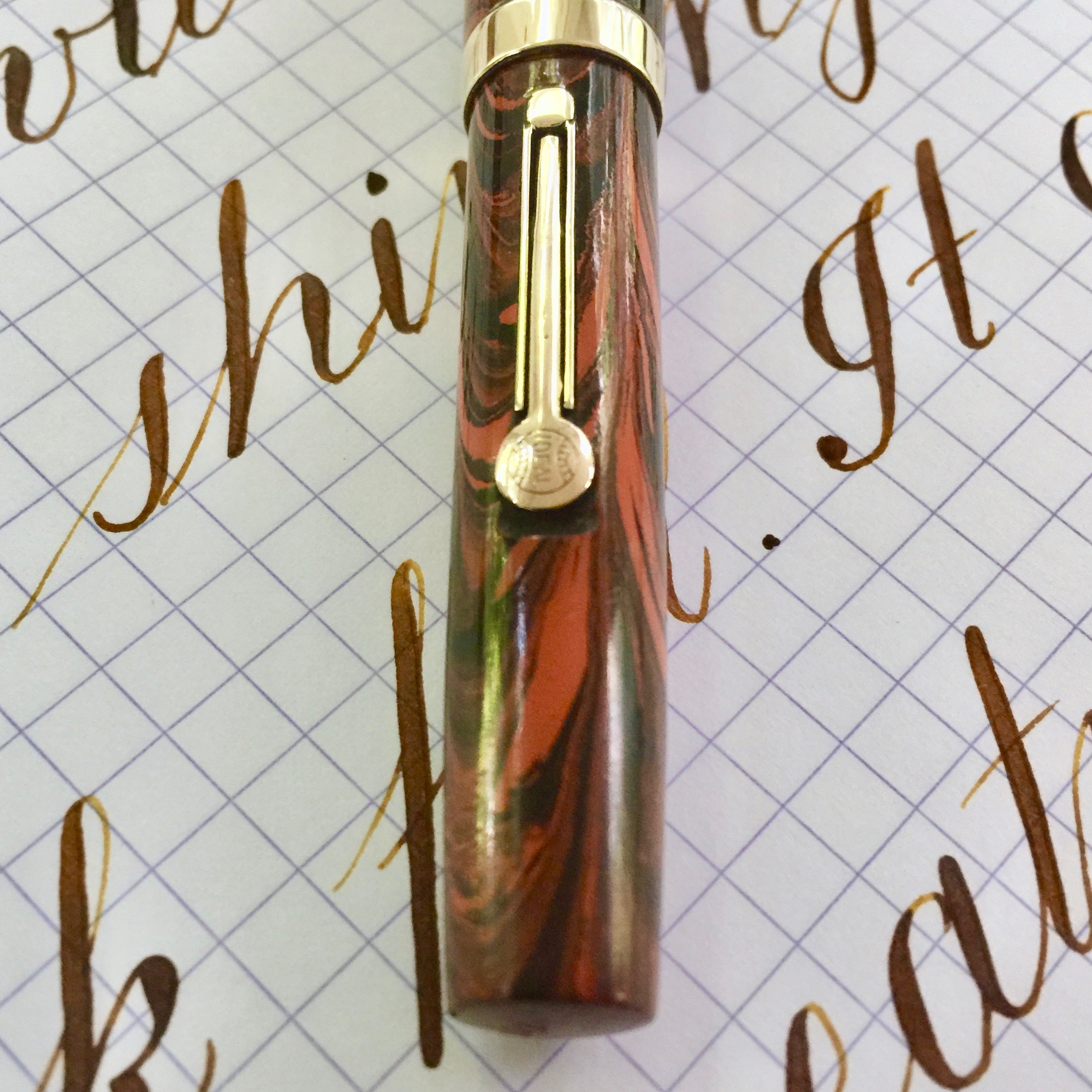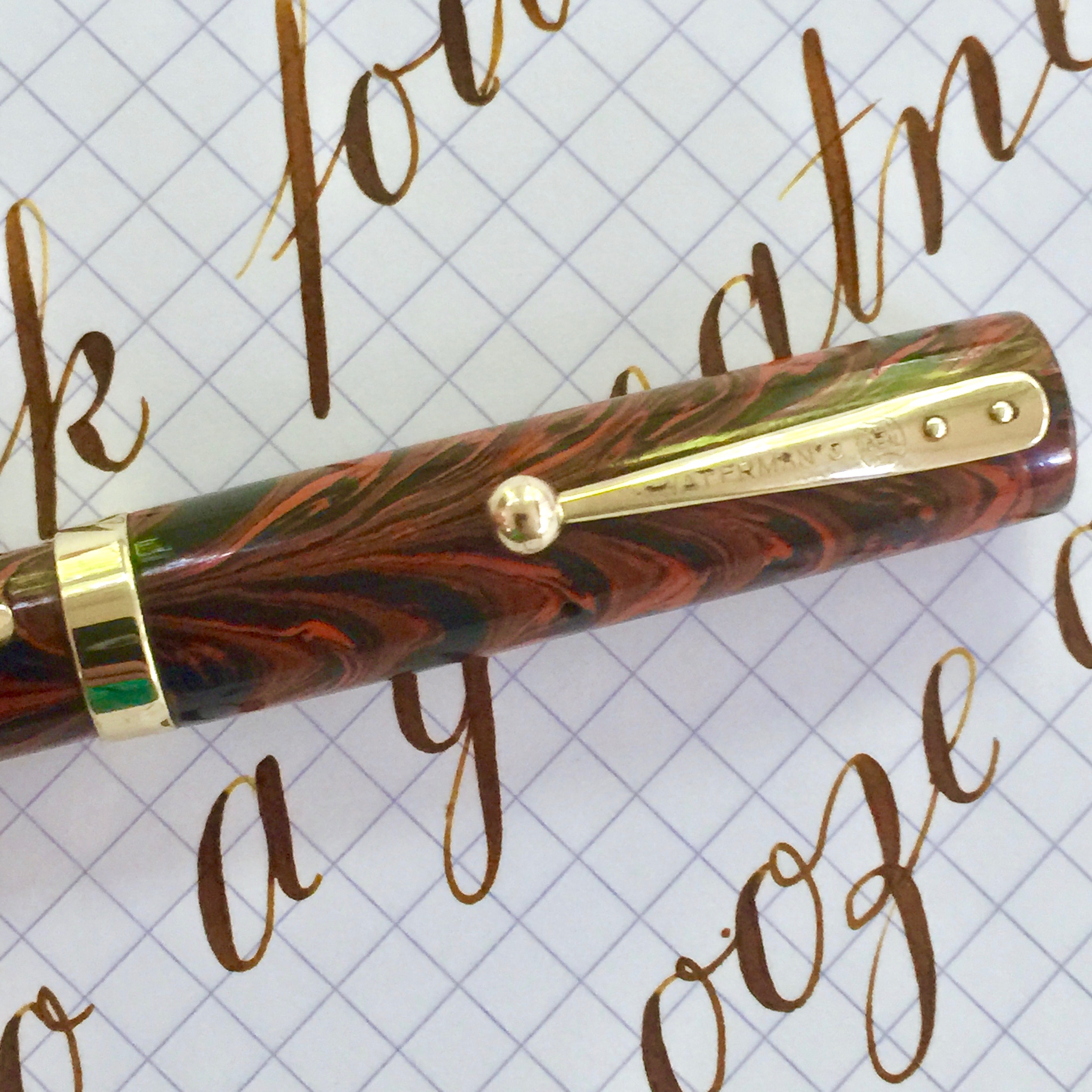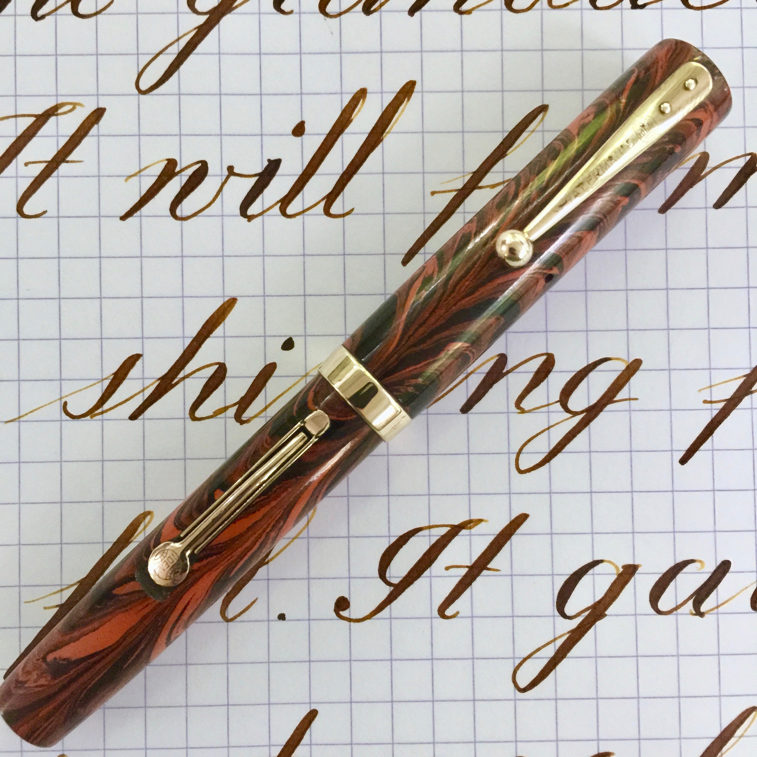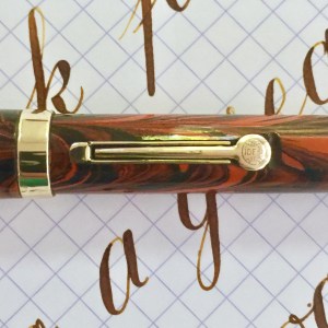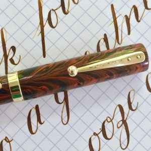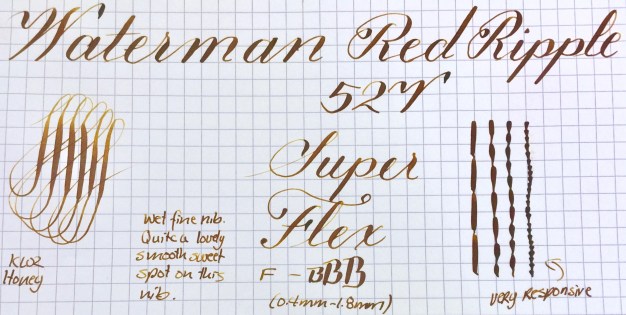 This is a beautiful 52V in Red Ripple hard rubber in very nice condition. The fading on the red ripple hard rubber is very minimal, and the pen body is still popping with bright color. The imprints are still pretty good and easily readable. The gold-filled trim looks good as well, but does have a few spots of brassing. These include a couple of small spots on the lever, a little on the ball of the clip, and a couple tiny spots on the “Waterman’s” on the clip. The 14kt. Waterman #2 is a good one. It’s a very nice, wet writing F (0.4mm) with a soft and smooth sweet spot. The line the nib produces does have a little bit of character to it, but I wouldn’t call it a stub. The flex on this pen is lovely as well. It flexes easily up to 1.8mm. But the real joy is just how snappy and responsive it is. It’s easy to achieve some beautiful calligraphy with this nib. A gorgeous red ripple Waterman with superb flex nib. What more can you want?