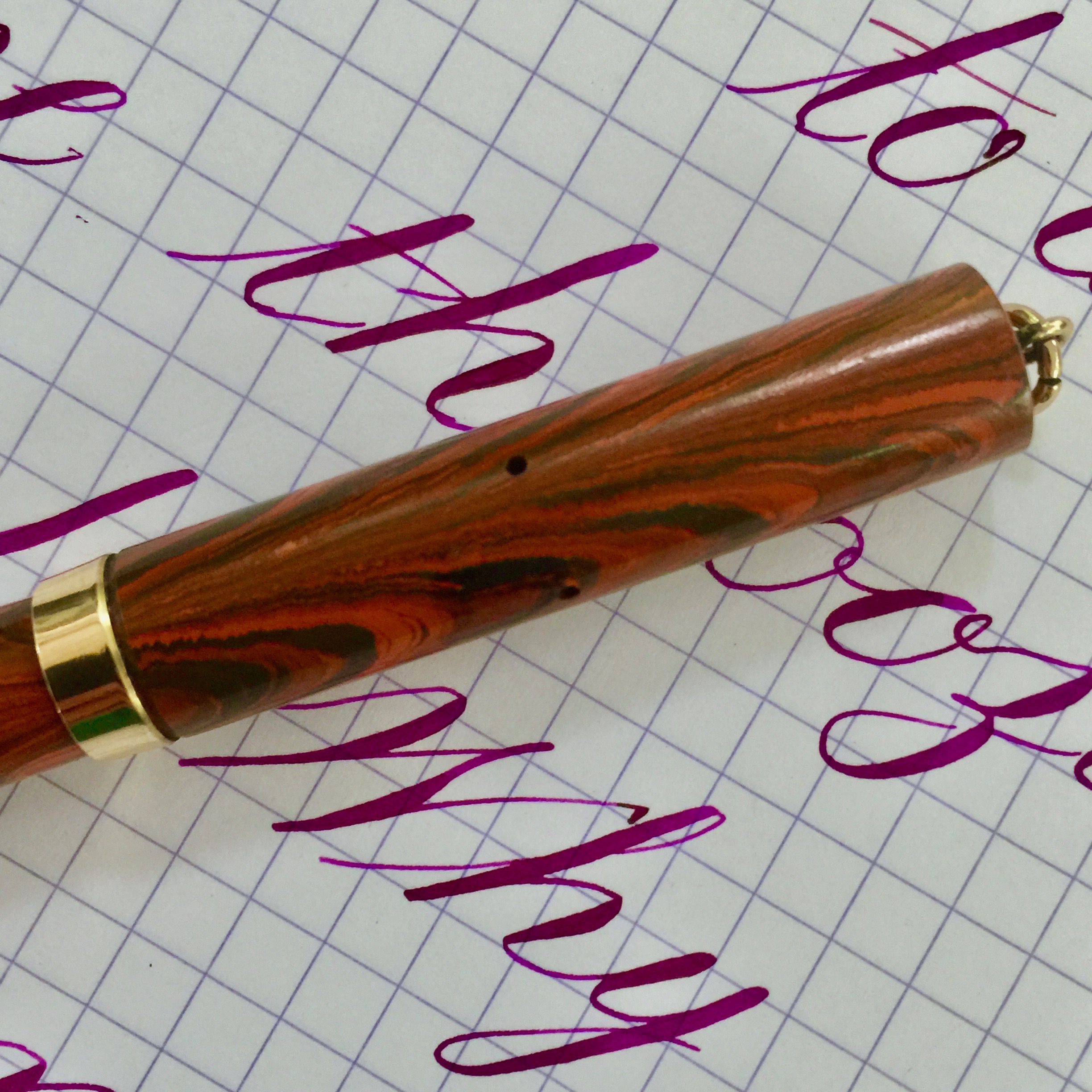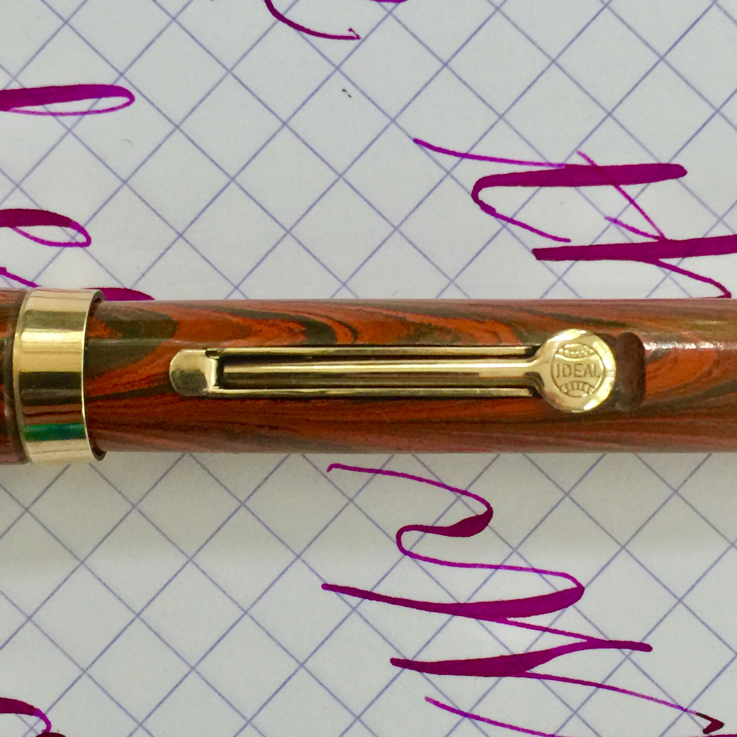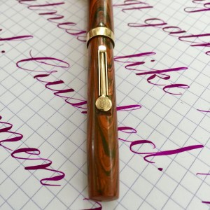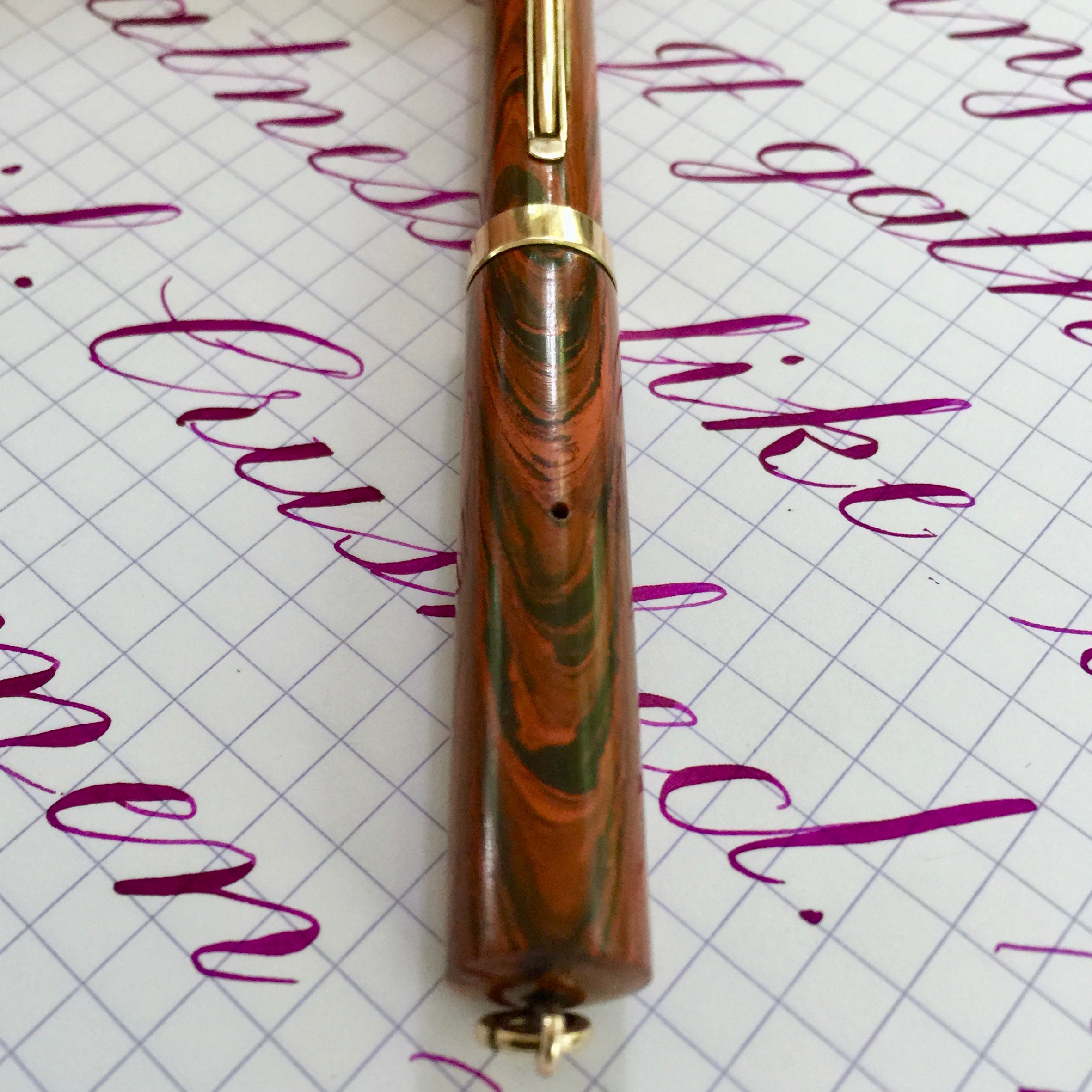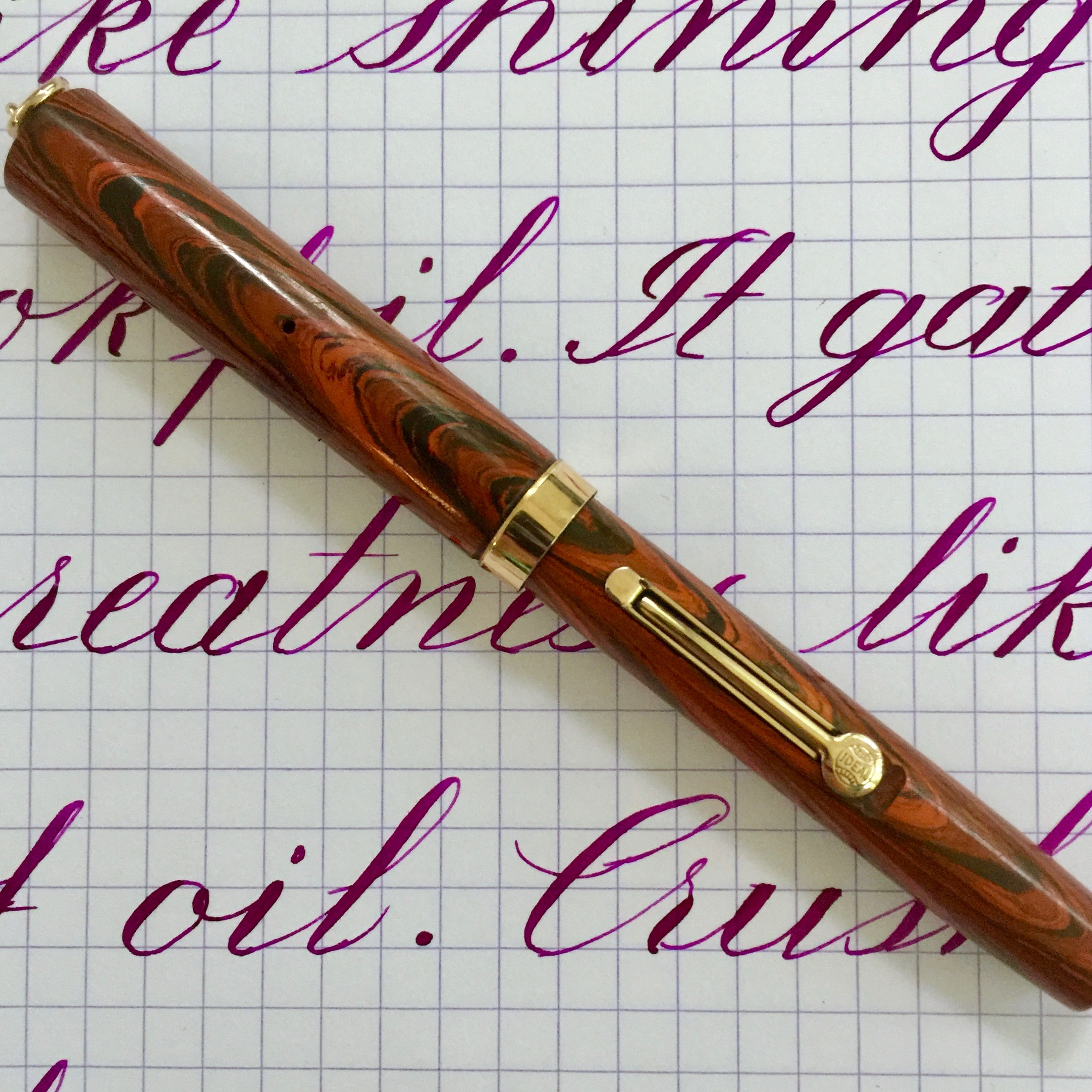 Here is a lovely Watermant 52 1/2 V with a ring top in red ripple hard rubber. The red ripple hard rubber does show some fading and thus a bit of dulling of the original red ripple color, but it still has plenty of color left. The imprints are very crisp with little to no fading. The gold-filled trim is also in excellent condition with no signs of brassing on the lever, band, and ring top. The Waterman #2 14kt. nib is a very fine (XXF) and lovely writing nib. It is quite smooth for how fine it is. The flex on this pen is in on the stiffer side of super flex, but the responsiveness is superb. Although the max width of the line isn’t enormous (1.5mm), it is plenty large enough to get quality line variation due to the XXF nib and to the snappy responsiveness of the nib. A beautiful little pen with impressive writing abilities.