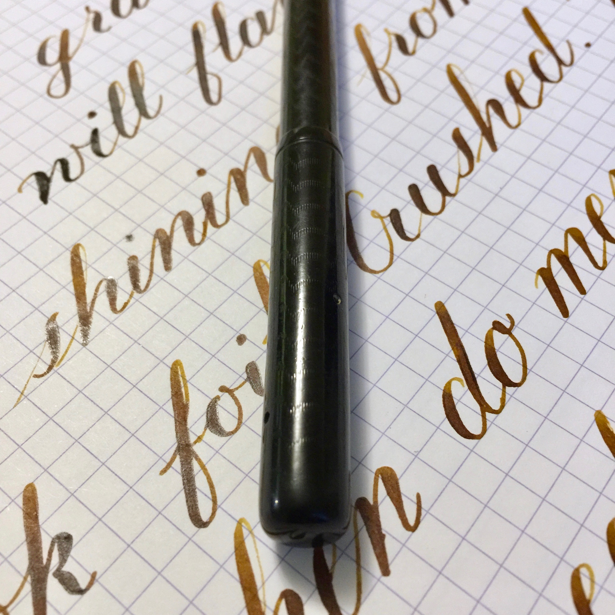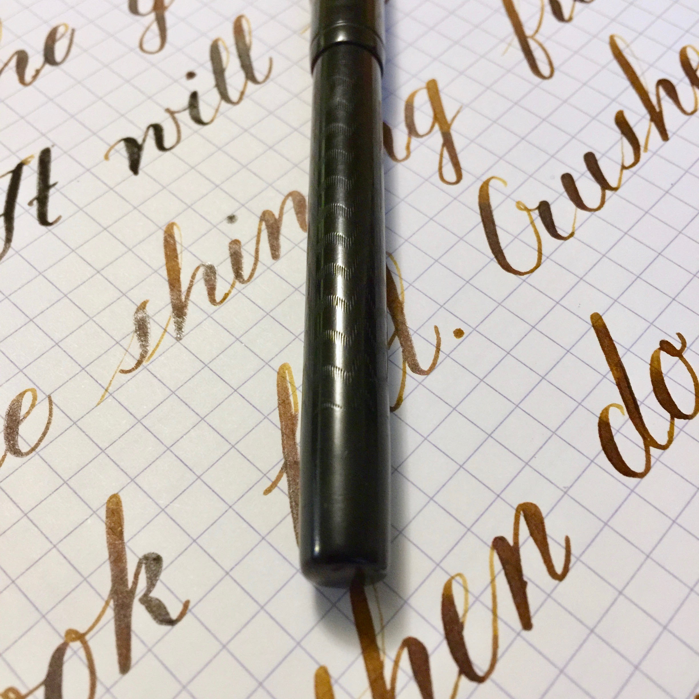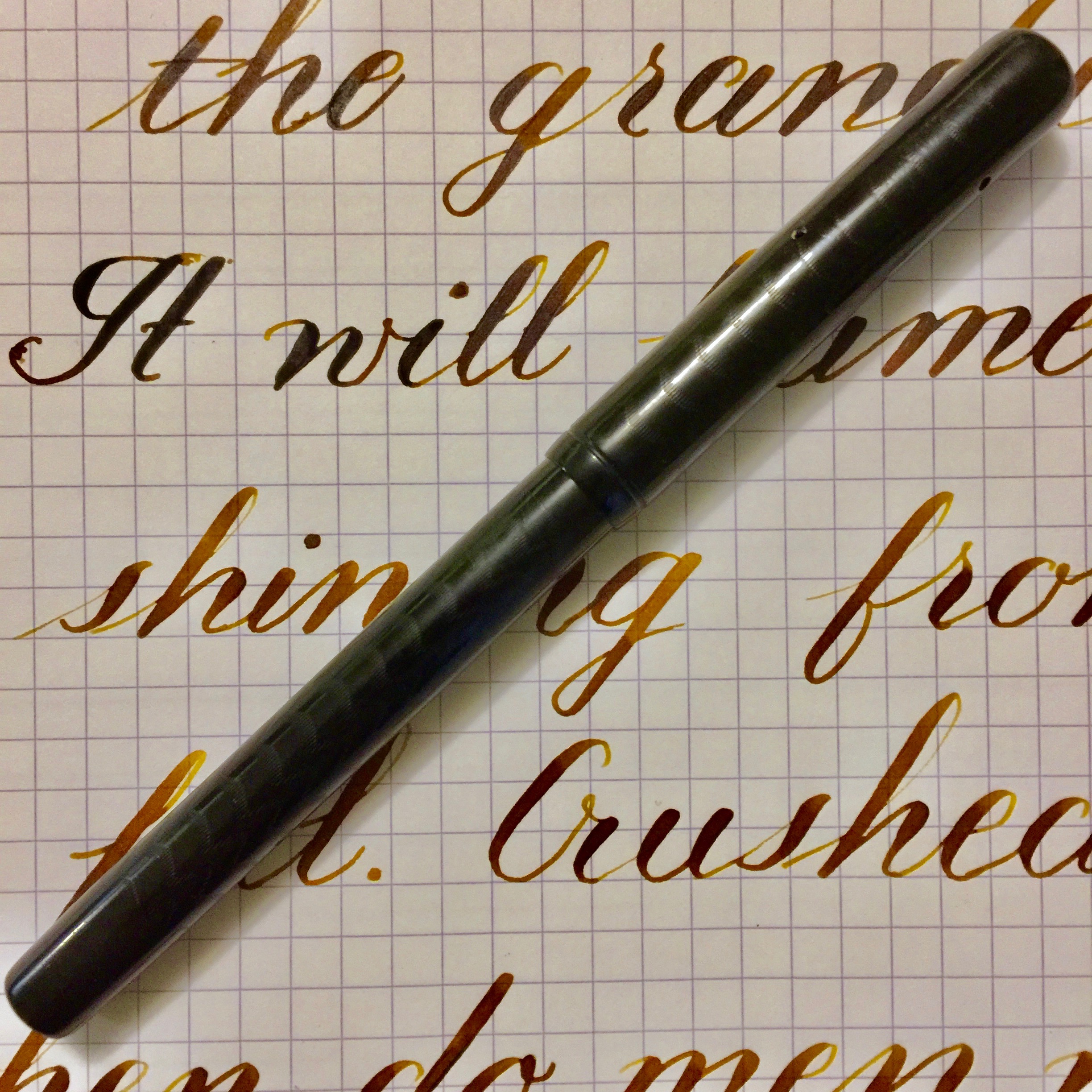 Here is a Waterman 12 eye dropper pen. The black hard rubber body has faded some to a very dark blackish brown. The chasing on this pen is quite worn. It’s visible but without much texture. The imprints are good and crisp and easily readable. The nib on this pen is quite interesting. I found this 12 in the “wild” nibless and decided to pair it with 14kt. Waterman #3. I know, I know, it’s a 12 and should have a #2. But I’ve been tracking down a 13 for this nib forever with little success, and the nib is just too nice to not be used. A good heat set of the nib and feed (which I do with all my vintage pens) took care of any slight size differences. The base of this nib is huge, so it’s not sliding around any. It’s a very fine stub really with some decent line variation. Not quite an “italic”. The flow keeps up nicely, but I wouldn’t call this a “wet” stub. It’s a great writer that adds character. The nicest feature of the nib is it’s flex. This is a soft super flex nib with a great range, very good responsiveness. It’s getting pretty close to “wet noodle” status but not quite. A really nice pen and nib.