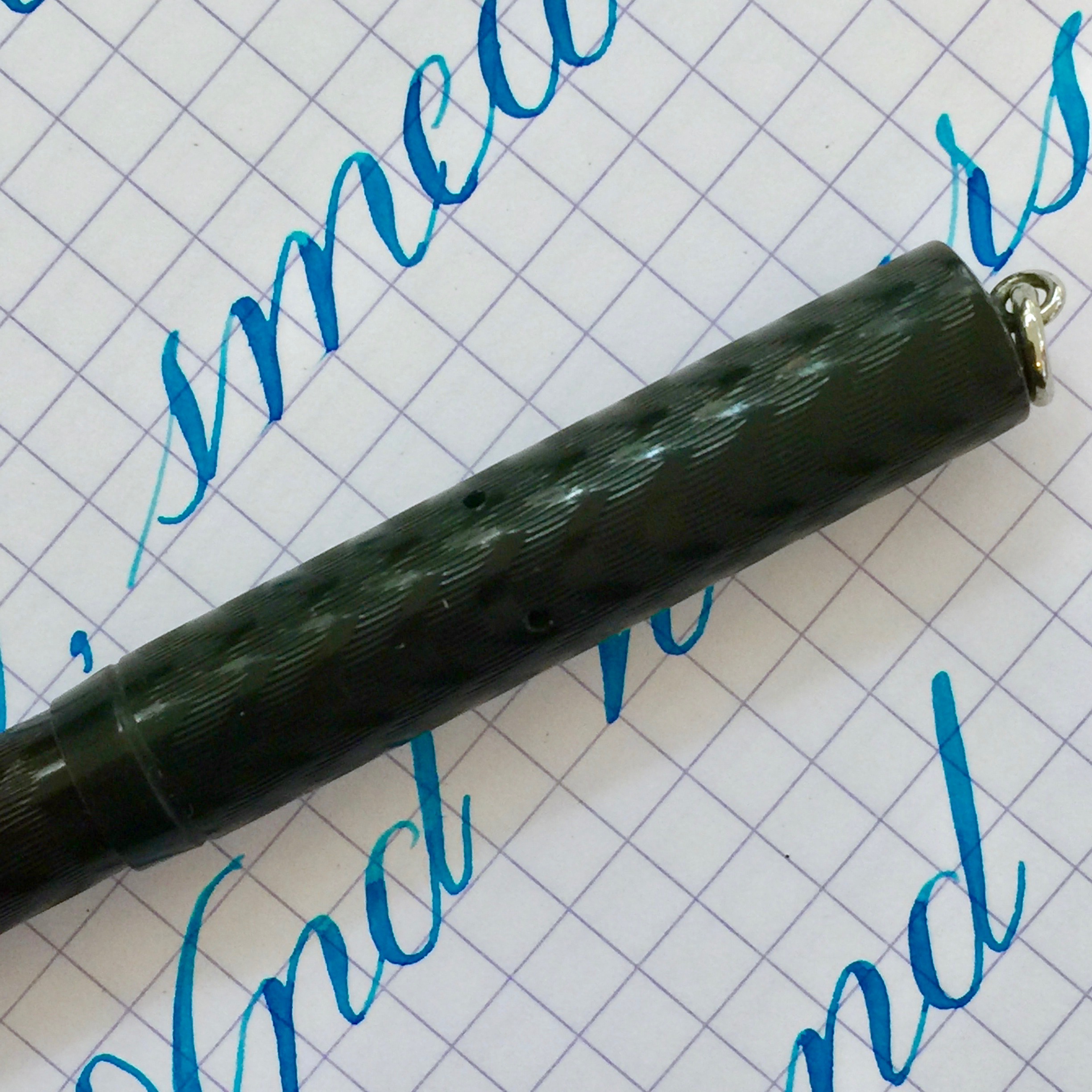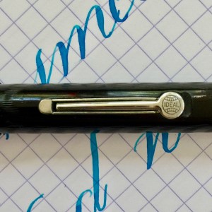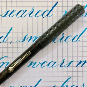 This vintage Waterman 52 1/2 V is really in fantastic condition. The black chased hard rubber body is still very black with little to no fading. The chasing is also good and crisp as well as all the imprints. The pen really looks to have hardly ever been used. The nickel trim also looks near perfect. The most essential part of any pen, the nib, is lovely as well. The 14kt. Waterman #2 is a wet and butter smooth XF. You just don’t find XF nibs this smooth. It’s pure joy to use. It also has very good flex ranging from XF-BBB (0.3mm to 1.6mm). I have graded this as a super flex, but I would say it’s a lower tier super flex. That is, it’s closer to a “good flex” grade than a “wet noodle” grade. Still, it’s extremely hard to find these in such a good condition and the overall writing experience is phenomenal.