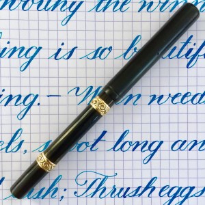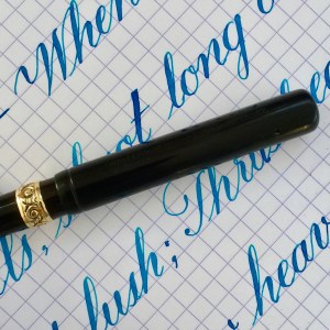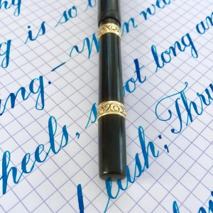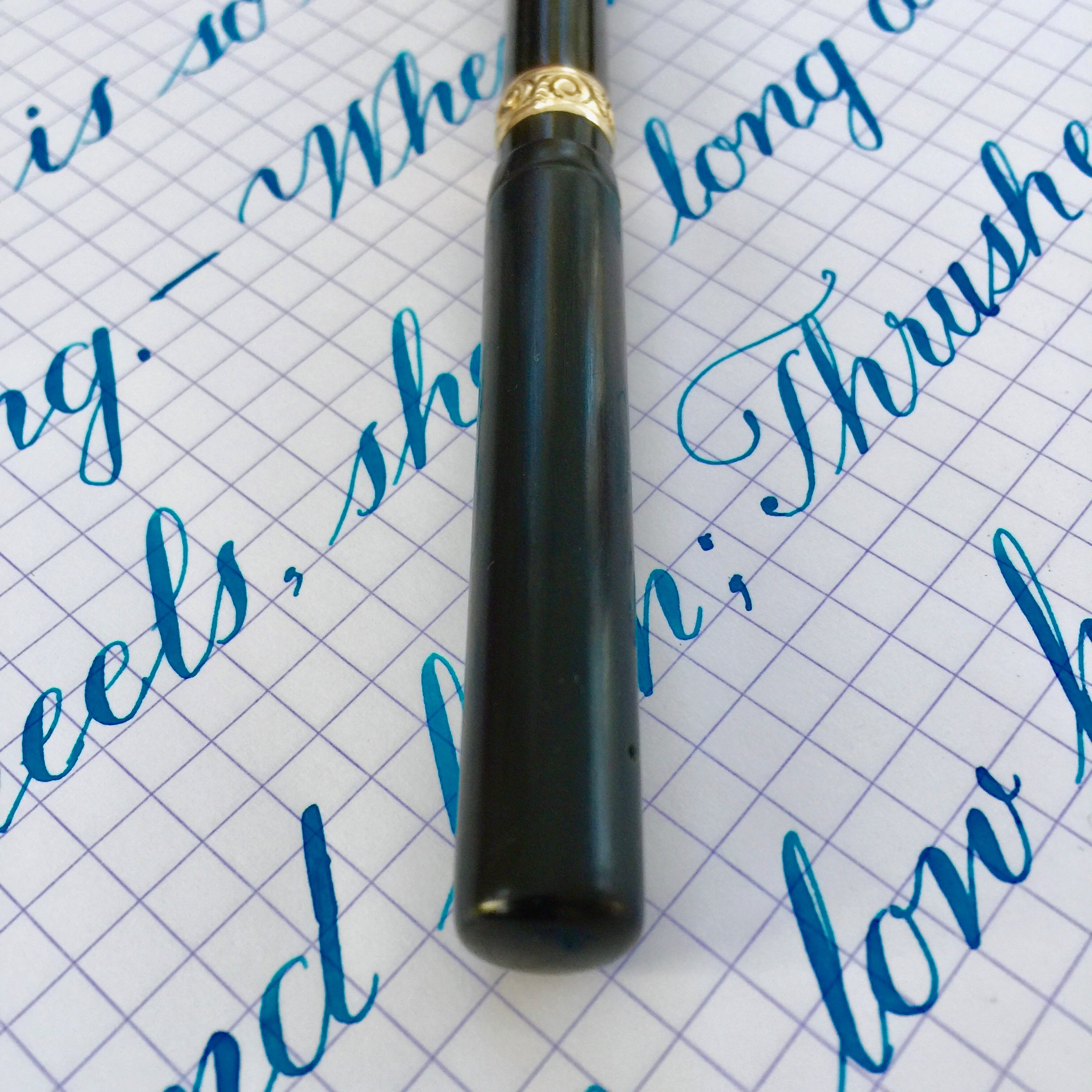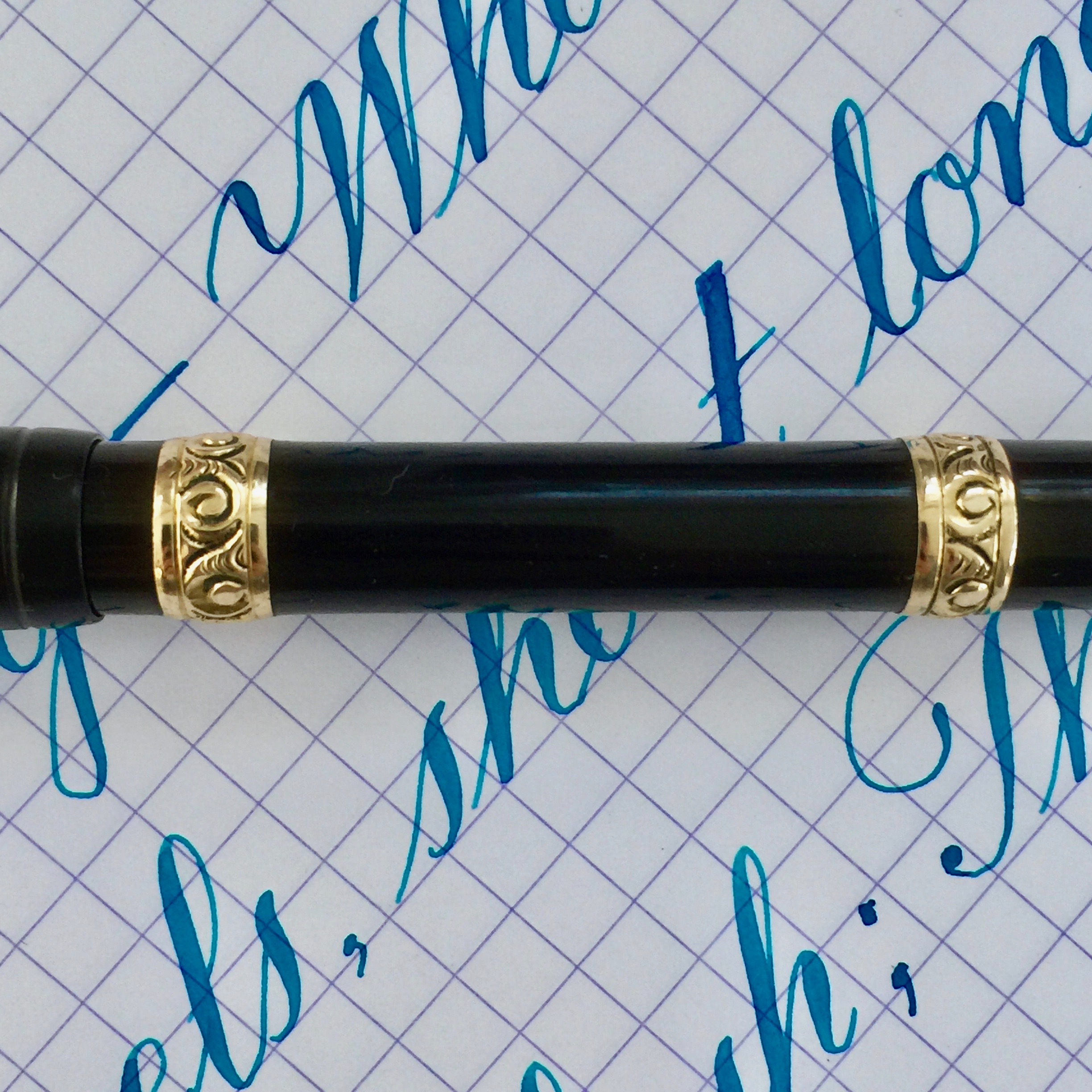 This Waterman 12 eye dropper (pat. date 1903) has a smooth black hard rubber body (no original chasing) with two gold-filled repousse bands. The hard rubber is still very black with very little fading. The imprint on the cap has a little bit of wear but it is still easily readable. The “12” on the end of the barrel looks great with some of the original red paint still present. The gold-filled bands are also in great shape with no brassing that I can see. This 12 is in fantastic condition. The 14kt Waterman #2 is also a great nib. It writes a lovely, wet and smooth XF (0.3mm) line with a normal hand. When flexed the nib has a great bouncy, responsive feel to it. The flex comes very easily going up to BBB (1.6mm). The softness of the nib isn’t paintbrush soft, but I graded it as a high super flex near wet noodle due to its superb responsiveness. This is a perfect example of why vintage flex pens are so appealing.